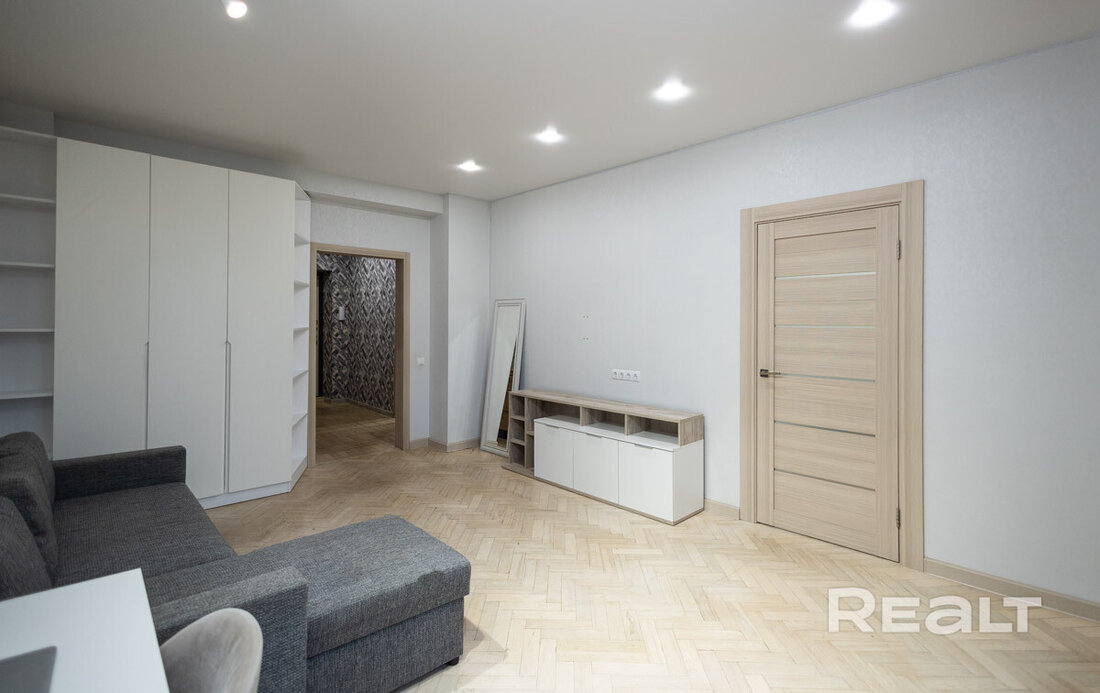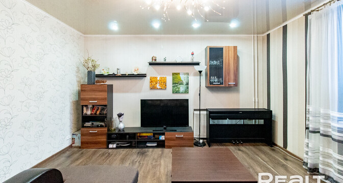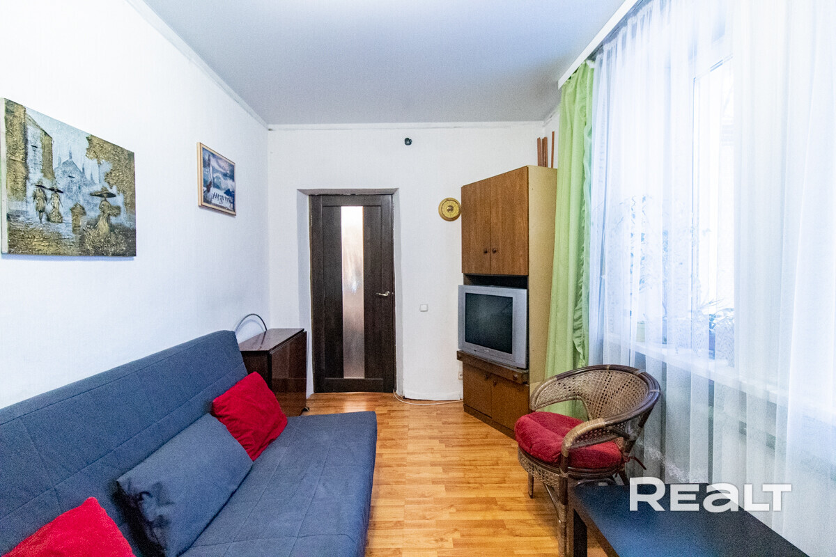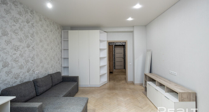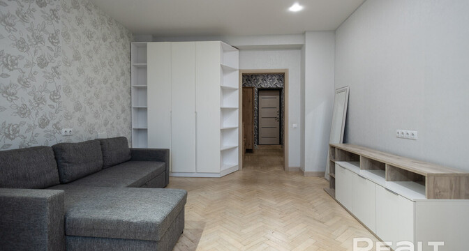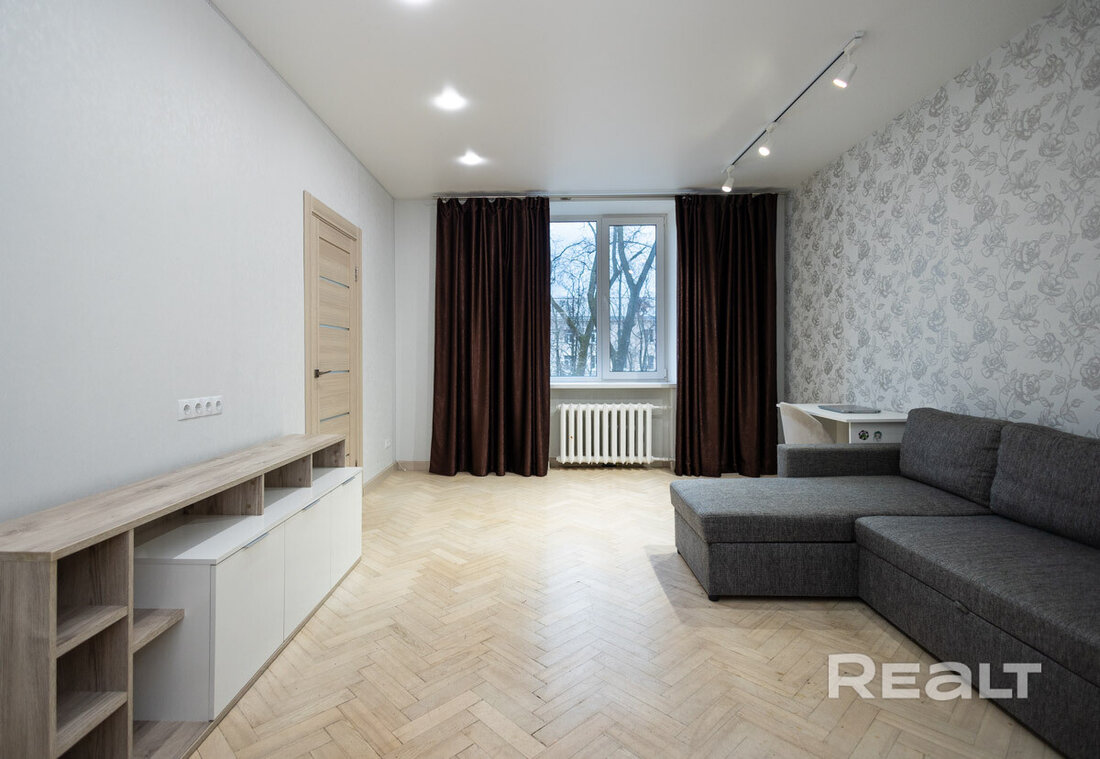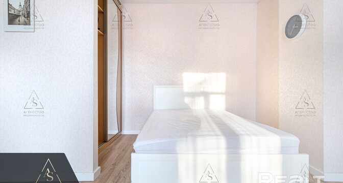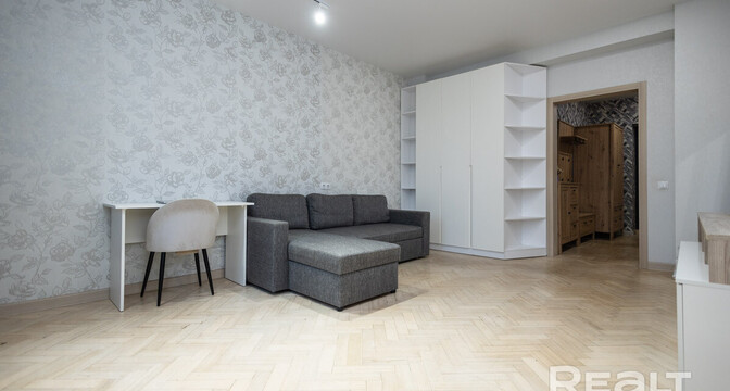 Квартира расположена на первом этаже. Ее общая площадь — 26 квадратов, а жилая — 14 квадратов. Потолки — 2,9 метра. Стены выровнены, поклеены обои. Потолки натяжные матовые. На полу линолеум. В комнате стоит раскладной диван, установлен шкаф-купе. Санузел совмещенный.