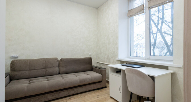 Интерьер в квартире выполнен в светлых оттенках. В одной комнате установлен шкаф-купе и стоит диван. В другой комнате — еще один диван и рабочий стол.