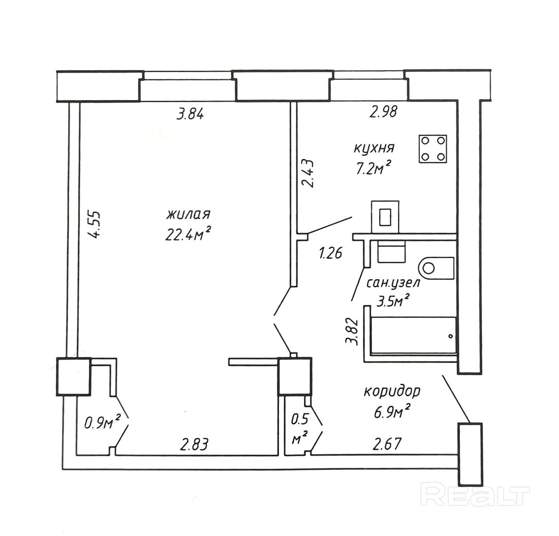 Общая площадь — 36 квадраты, 14 из них приходится на жилую комнату, а 8 метров — на кухню. Потолки — три метра. В жилой комнате есть выход на незастекленный балкон. Санузел раздельный, установлена ванна.