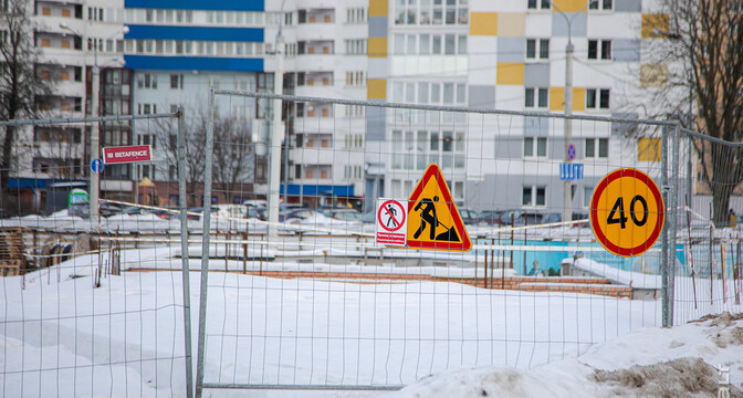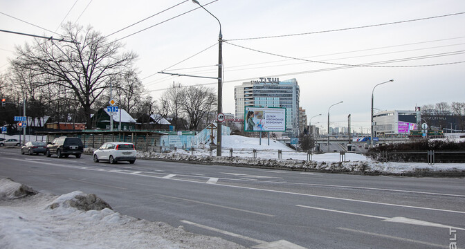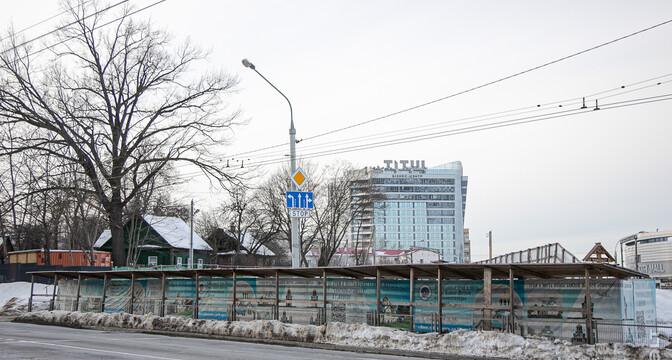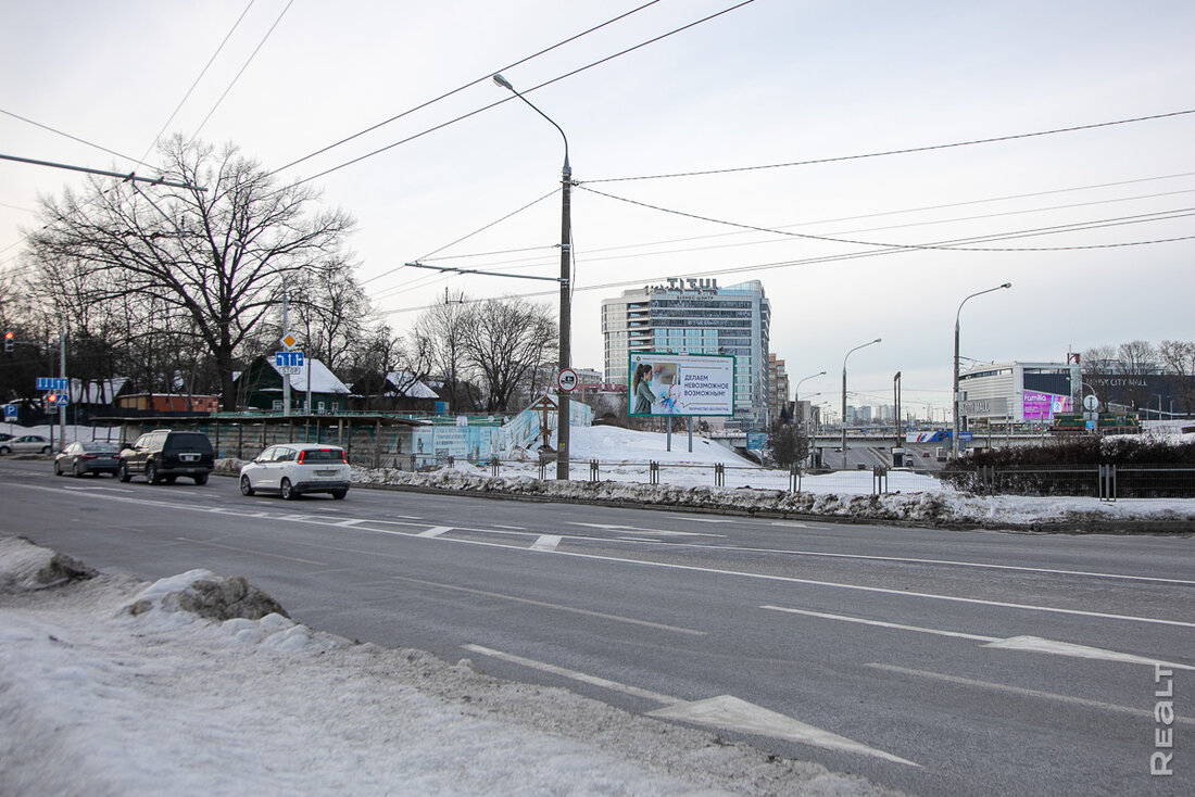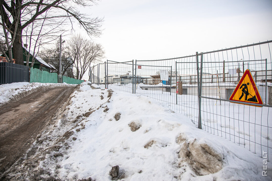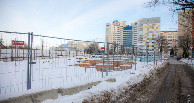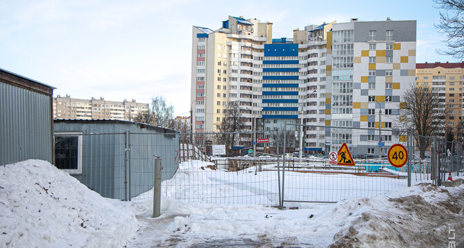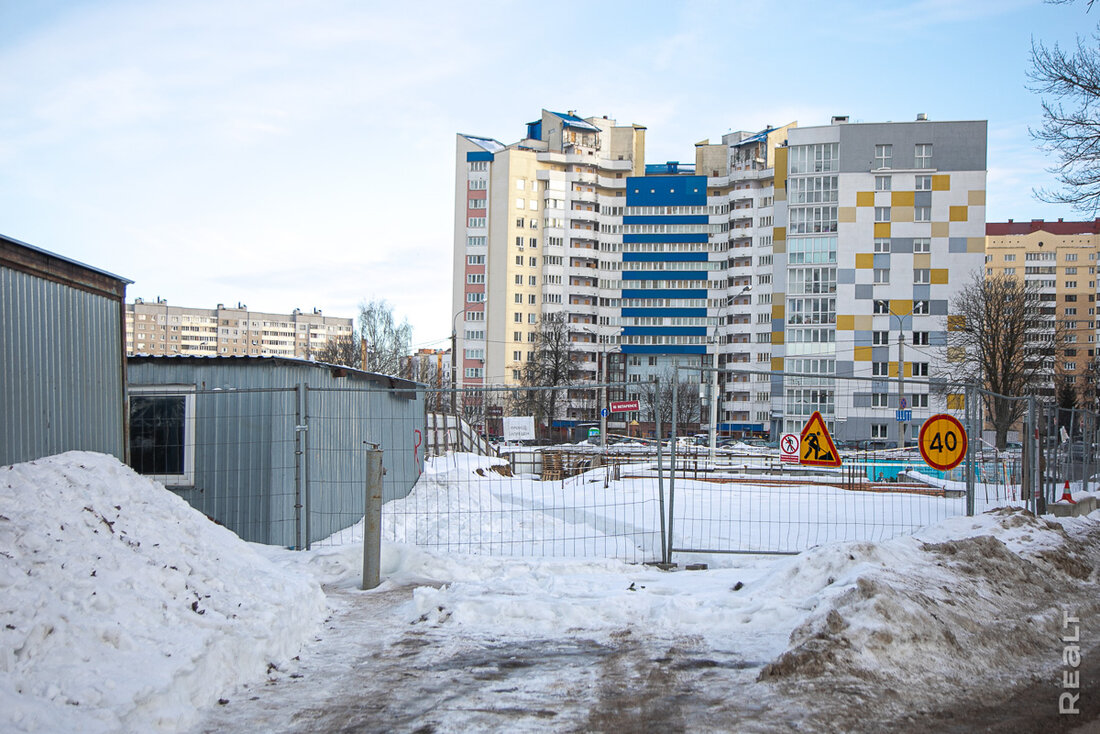 Стройплощадка находится по соседству с многоэтажками и частными домами, а на заднем фоне виден бизнес-центр «Титул» на улице Льва Толстого, железнодорожный вокзал и комплекс «Ворота Минска».