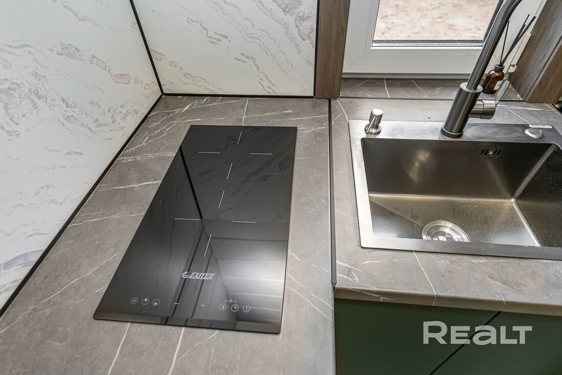 Общая зона представляет собой совмещенную кухню-гостиную. Здесь уже есть мебель и техника: холодильник Indesit, варочная панель Exiteq, стирально-сушильная машина Electrolux и бойлер на 80 литров.