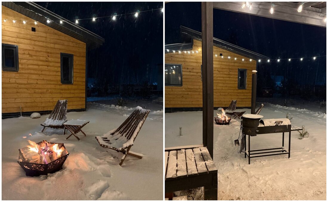 Поблизости построен хозблок. Не нему примыкает мангальная зона. На участке есть кострище с креслами кентукки.