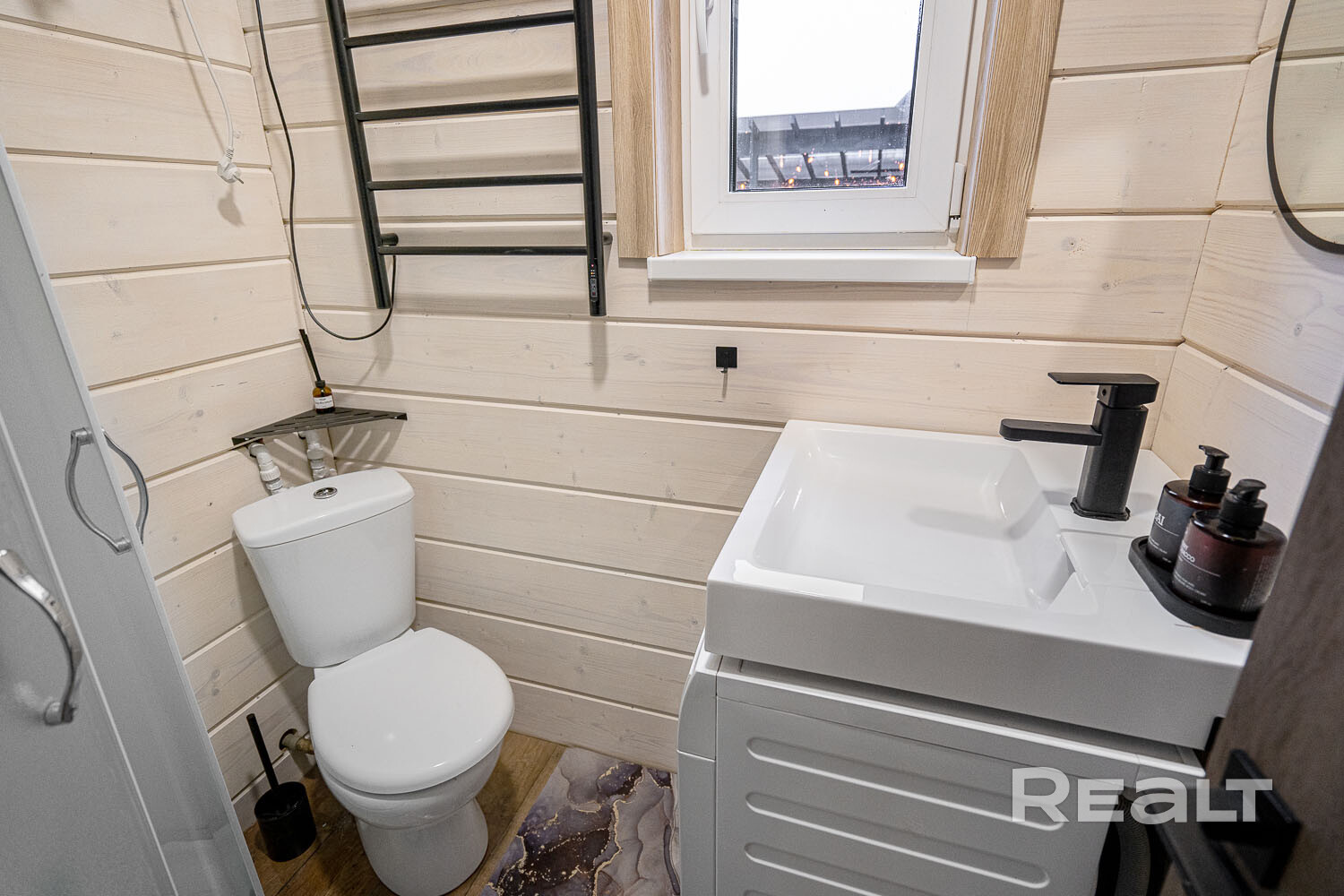 Совмещенный санузел идет с душевой кабиной. Вода в дом введена из скважины, установлена станция биологической очистки. Бойлер и полотенцесушитель оборудованы умной розеткой, которая позволяет управлять ими удаленно. Сделан теплый пол. Температуру в комнатах также можно регулировать удаленно.
