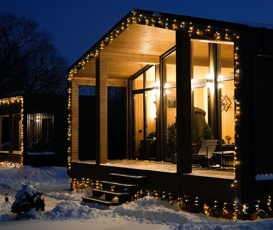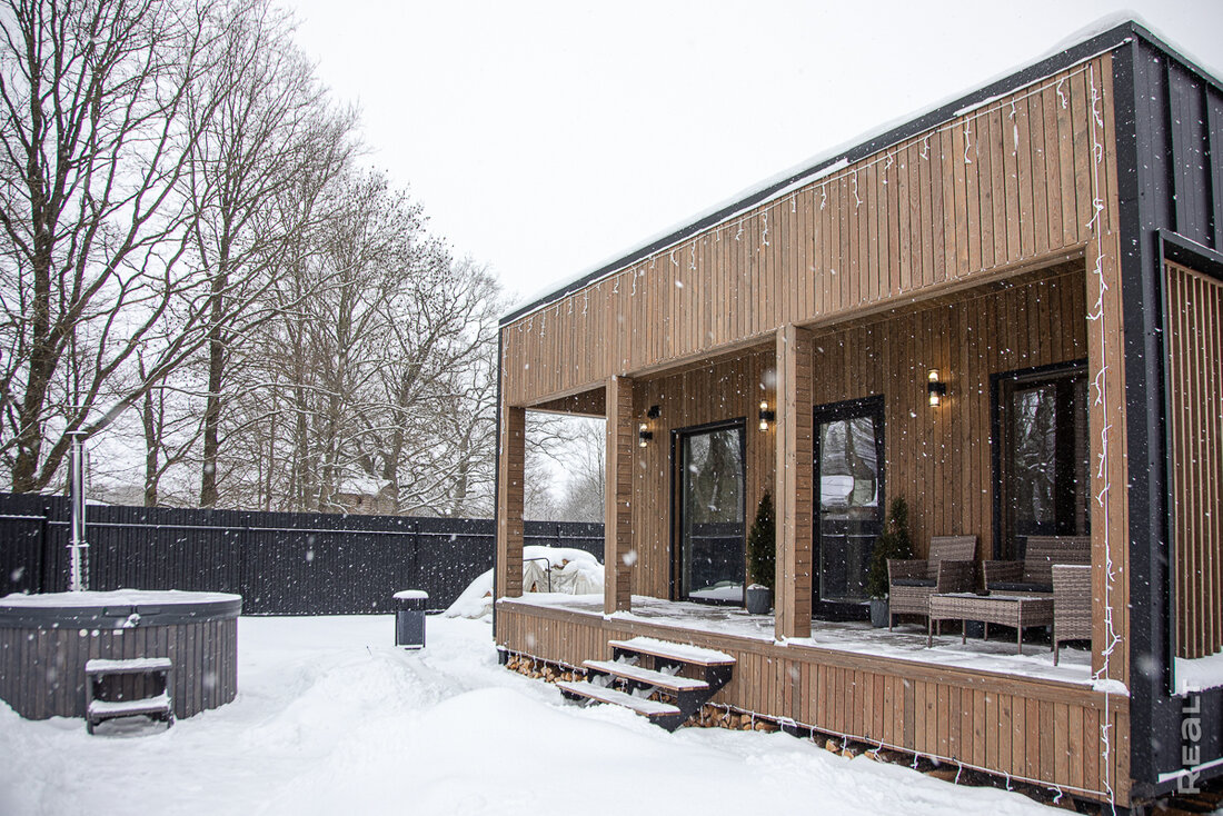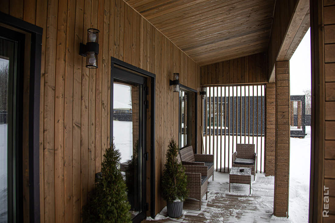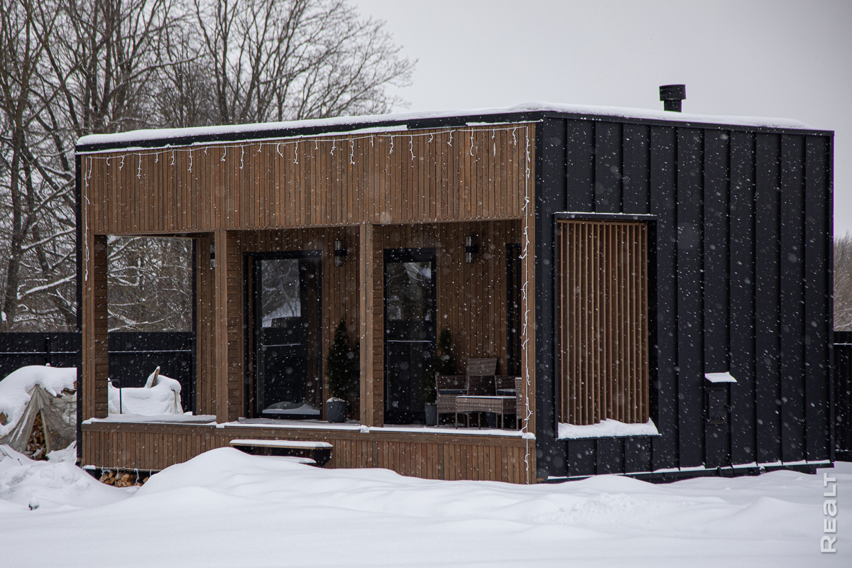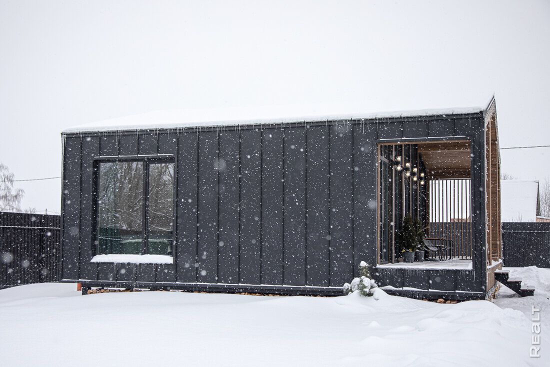 Поэтому Никита выбрал классический дом с двускатной крышей в стиле барнхаус. При площади около 60 квадратов, в нем две полноценные спальни с панорамными окнами, гостиная с большой диванной зоной, мини-кухней с большим обеденным столом, раздельный санузел и мини-топочная. У входа — большая крытая терраса.