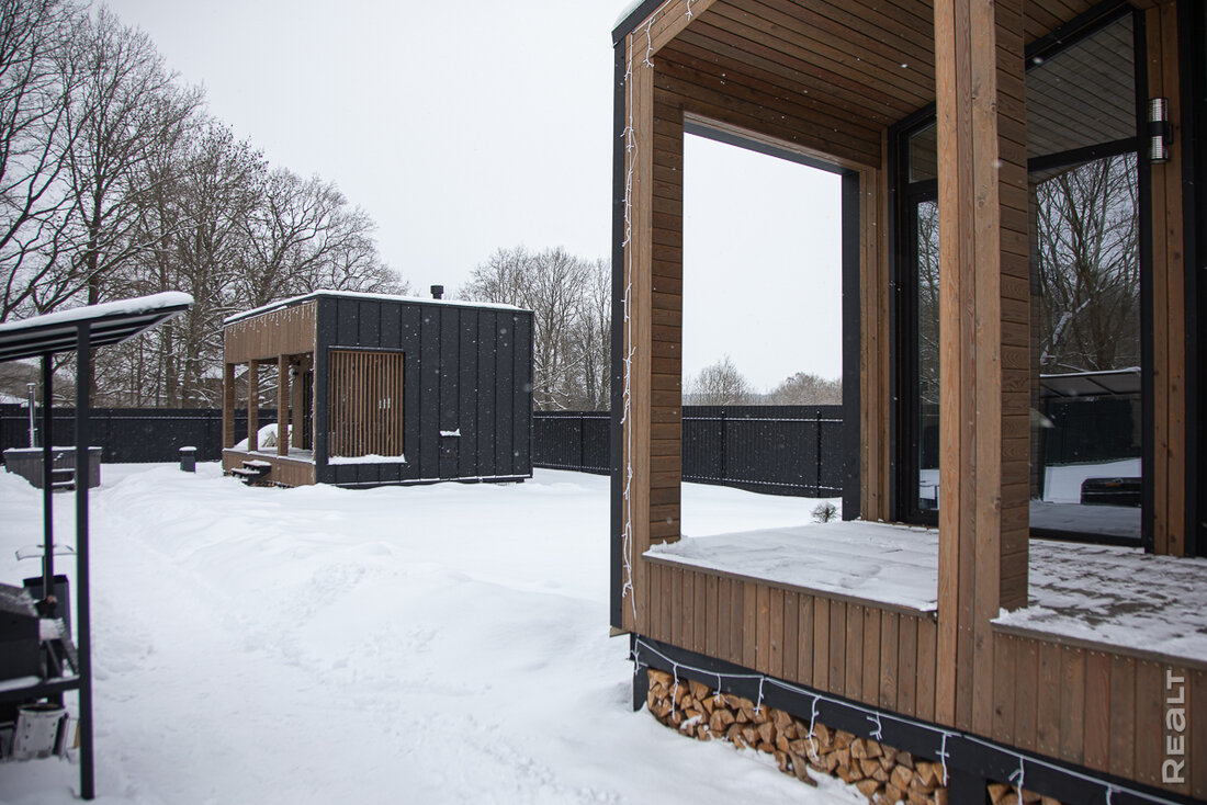 Размер бани подбирался соответствующий количеству гостей — чтобы в ее парилке с панорамным окном все поместились. Строение делится на четыре части — терраса у входа, комната отдыха с мини-кухней, раздельный санузел, парная. Стоит отметить, что банька сейчас хоть и выглядит как строение с плоской крышей, но это обман зрения. Если заглянуть в проект, то увидим, что крыша односкатная, просто с небольшим уклоном. В целом же и дом, и баня читаются как объекты в едином стиле.