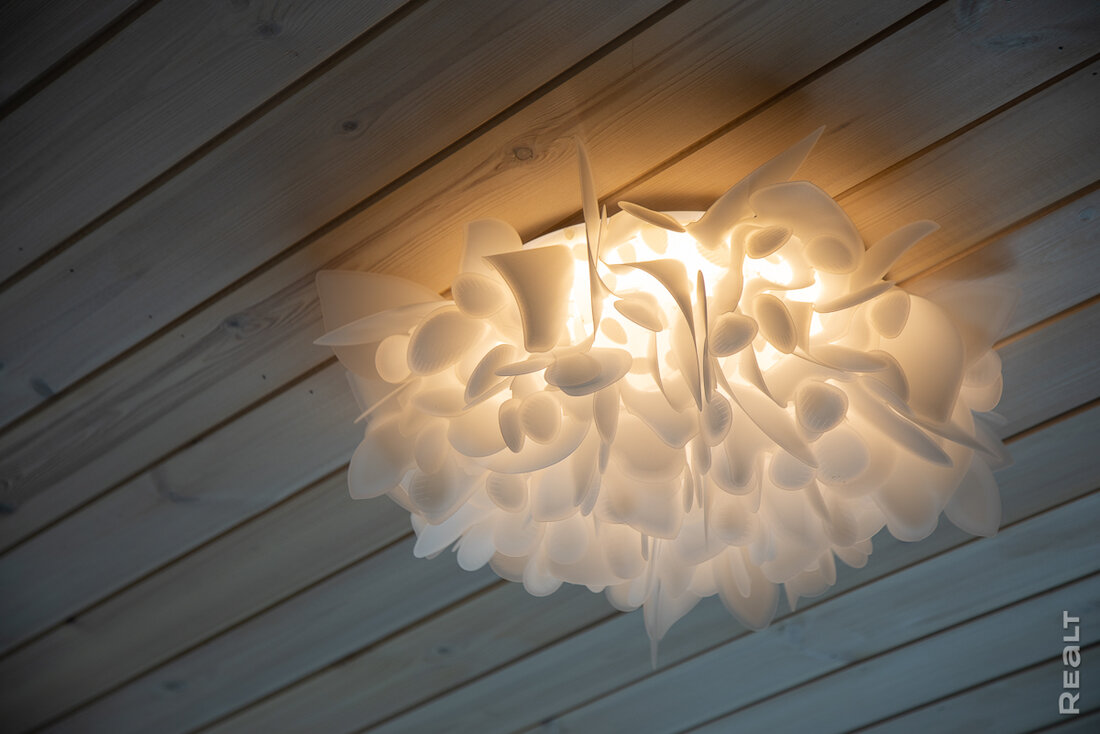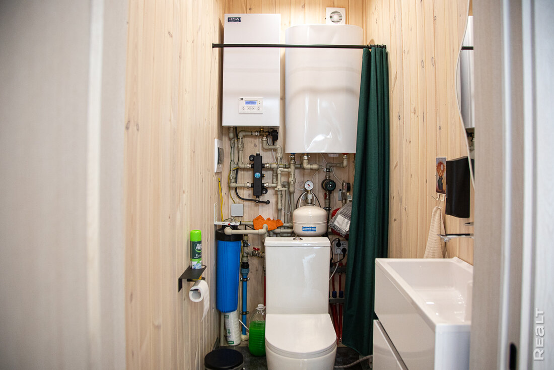 Внутри дома во всех помещениях — плитка. Дело не только в том, что такие полы легче убирать. Они служат и основным обогревателем дома — в стяжке под плиткой находится система теплых полов, подсоединенных к электрокотлу. Стоит признать, что это очень классно — даже в самый лютый мороз по дому можно ходить без тапочек.