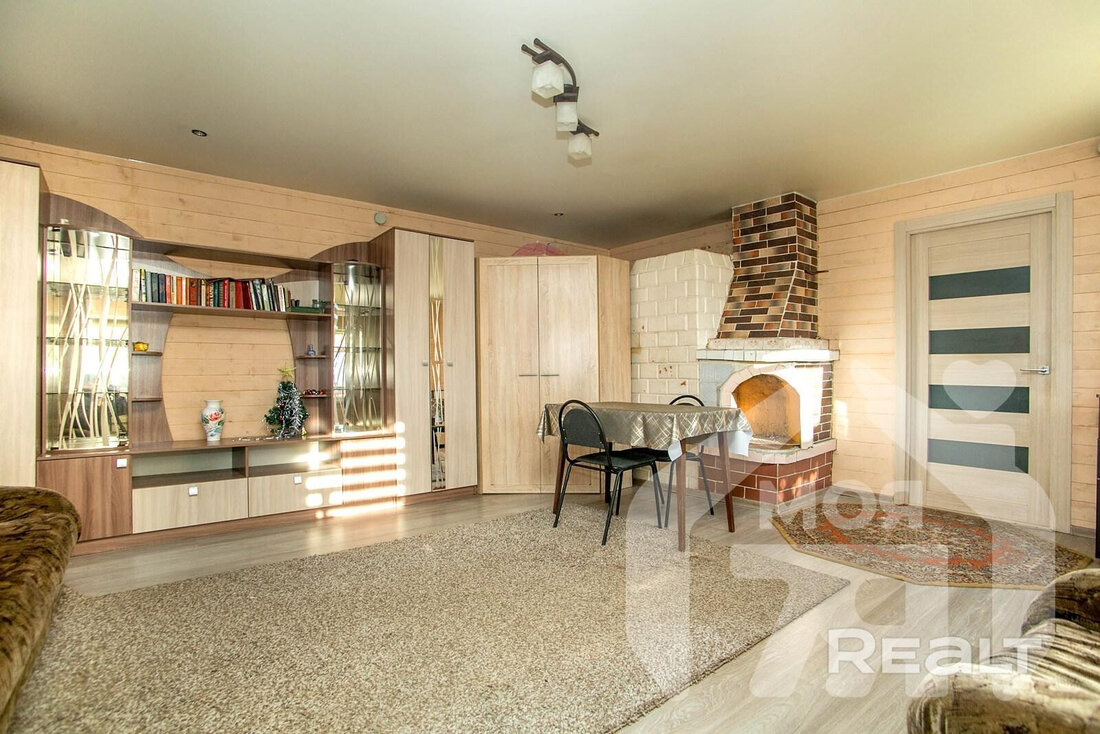 Общая площадь — 45,1 м2. В доме светлая жилая комната со свежим ремонтом и камином, холл с плиткой и системой теплого пола, комната, которую при необходимости легко переоборудовать в кухню или дополнительную спальню.