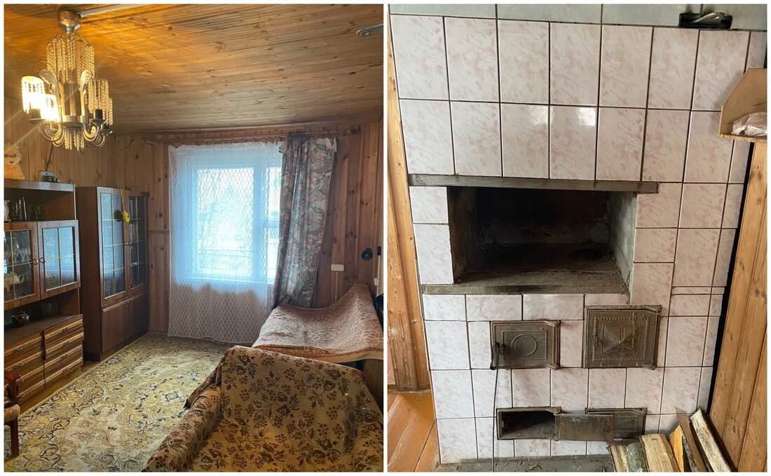 Интерьер простой и аккуратный: стены отделаны вагонкой, окна идут с деревянными рамами. Первый этаж разделили веранда с кухней и две жилые комнаты. В дом введена вода, отлично справляется с отоплением печь. А вот туалет здесь на улице.