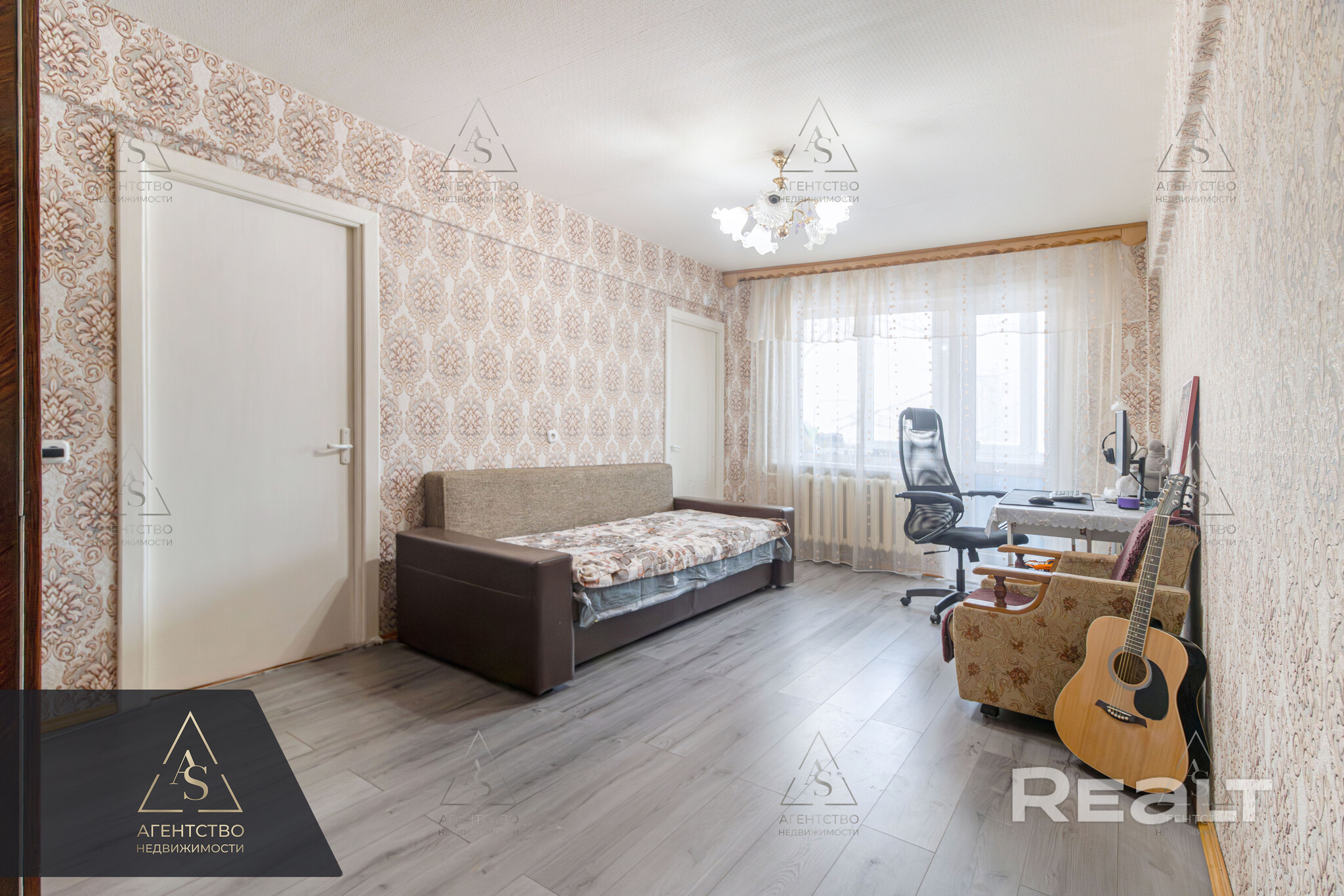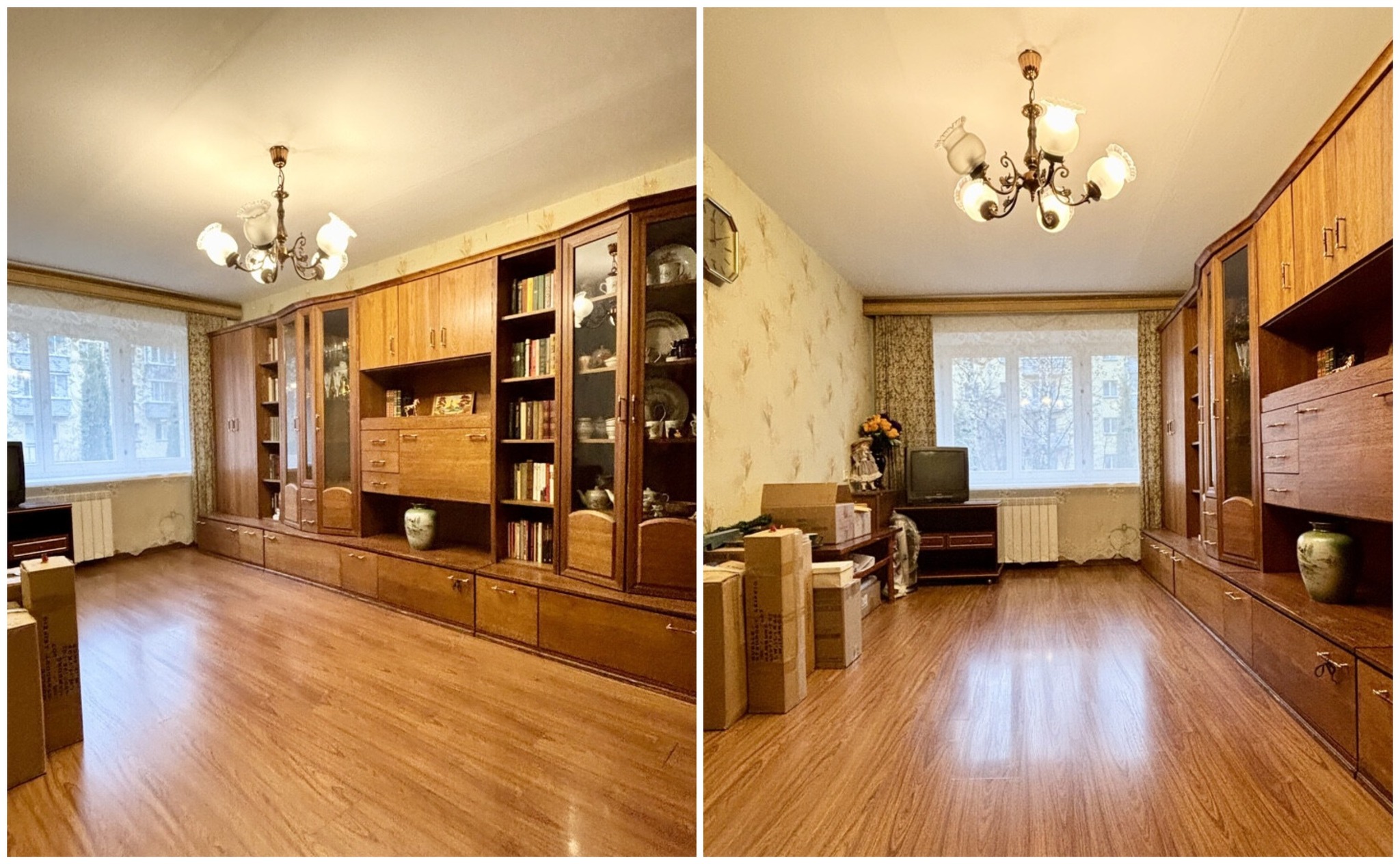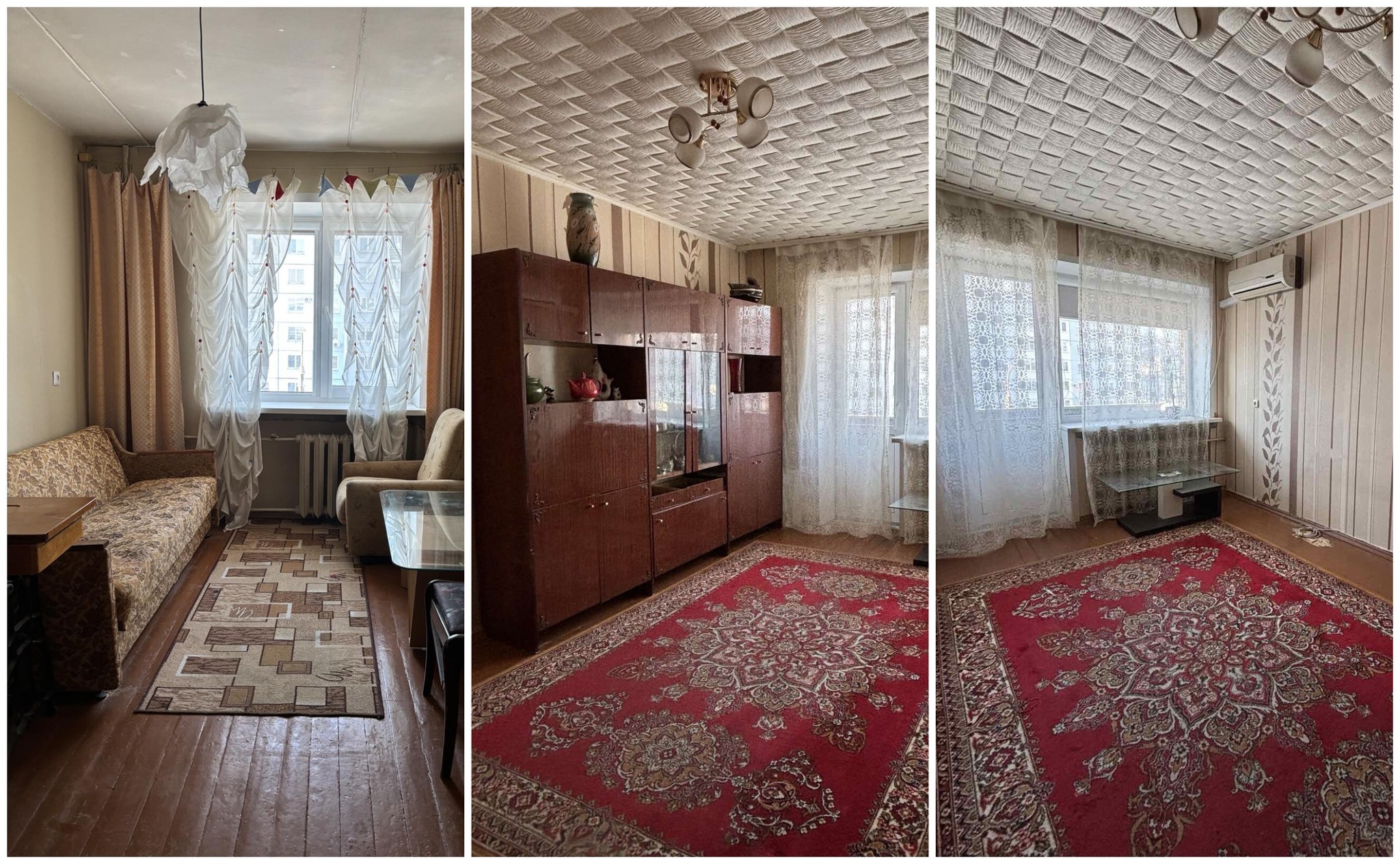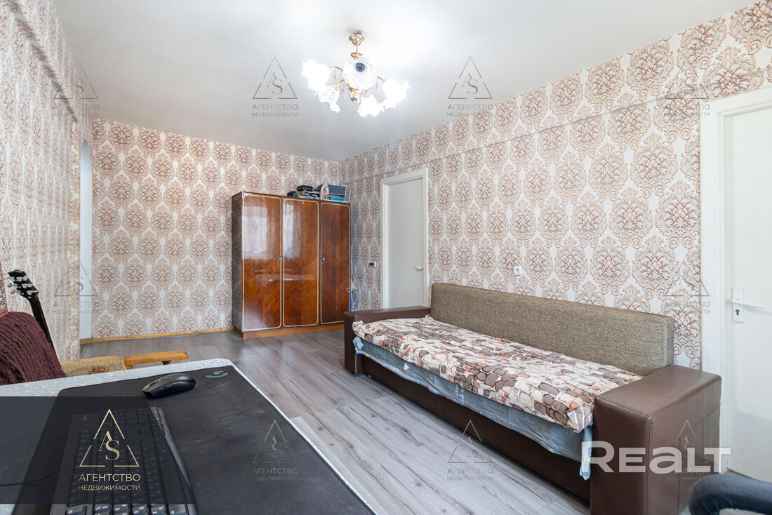 Квартира нуждается в ремонте. Все комнаты здесь отдельные. В центральной есть выход на балкон. Стены тут оклеены обоями, на полу лежат доски, в окнах стоят стеклопакеты.