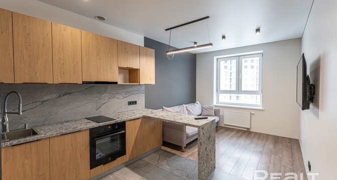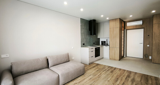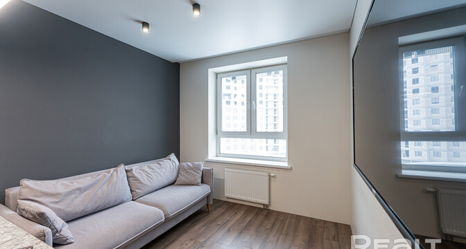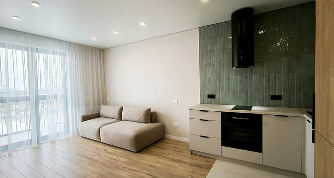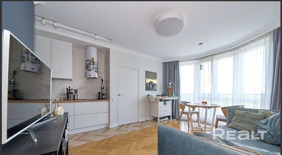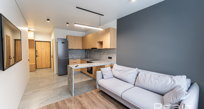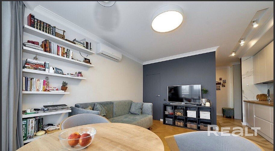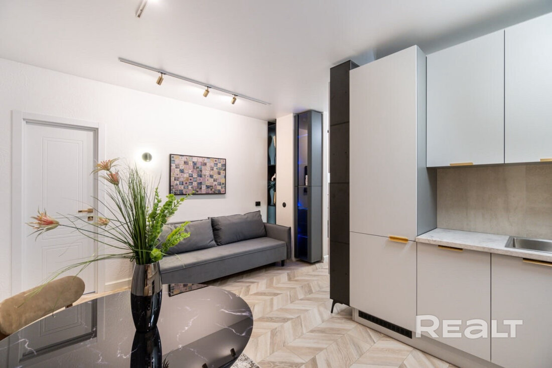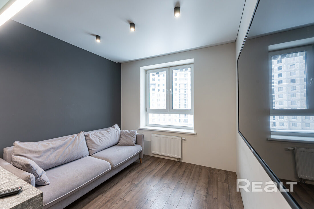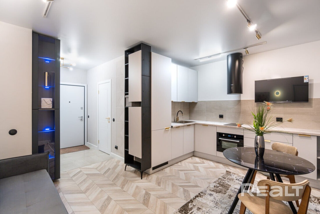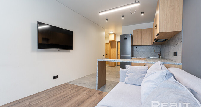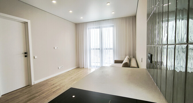 Общая площадь квартиры — 46 метров, а на жилую приходится 31 квадрат. В гостиной, совмещенной с кухней, большое окно во всю стену. Стены выравнены и окрашены, на полу в комнатах дубовый паркет, а вдоль рабочей зоны кухни — плитка с подогревом. Установлен кондиционер.