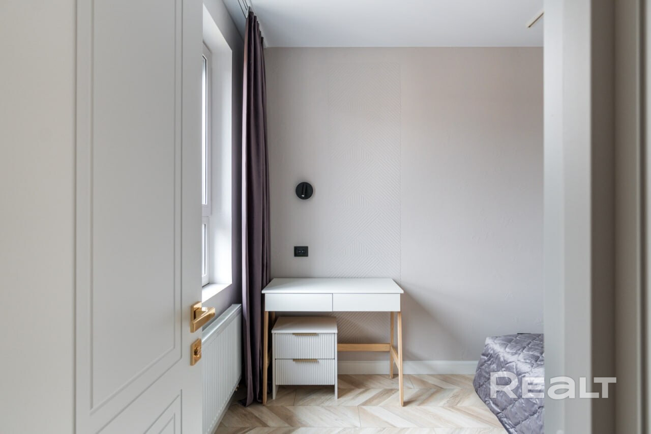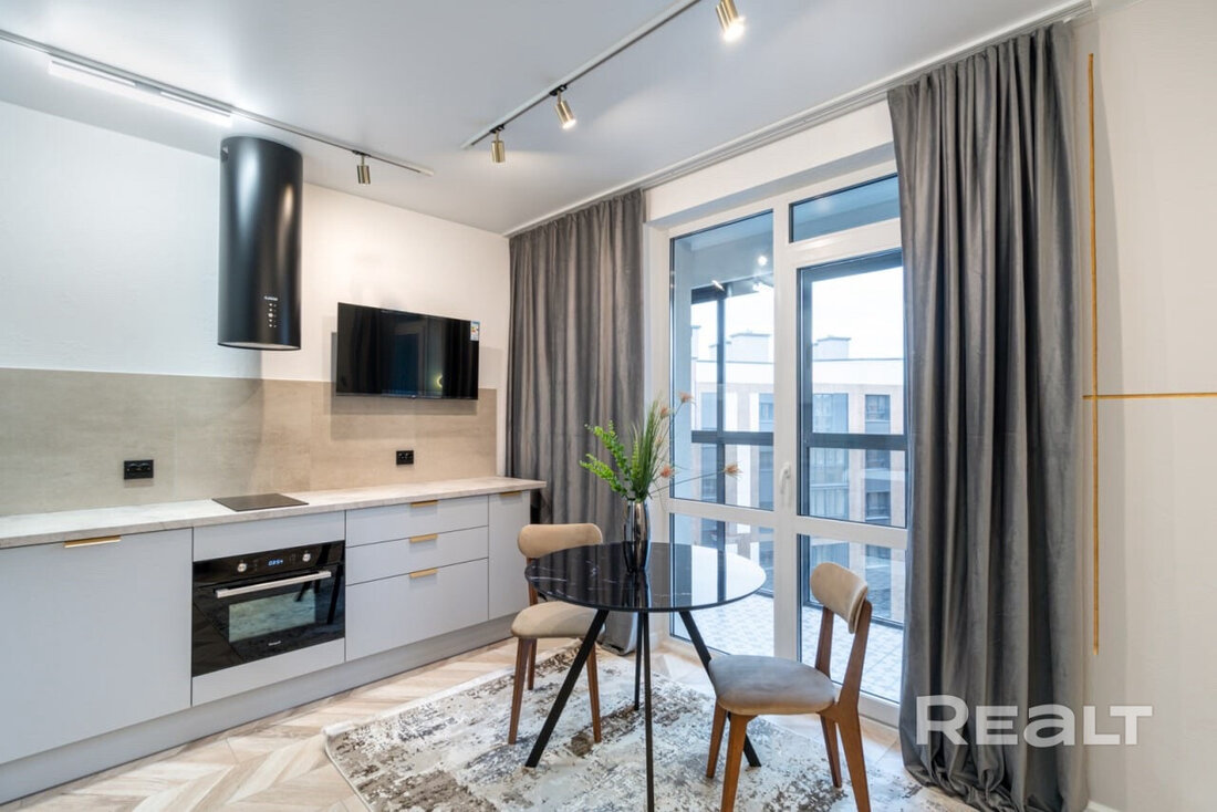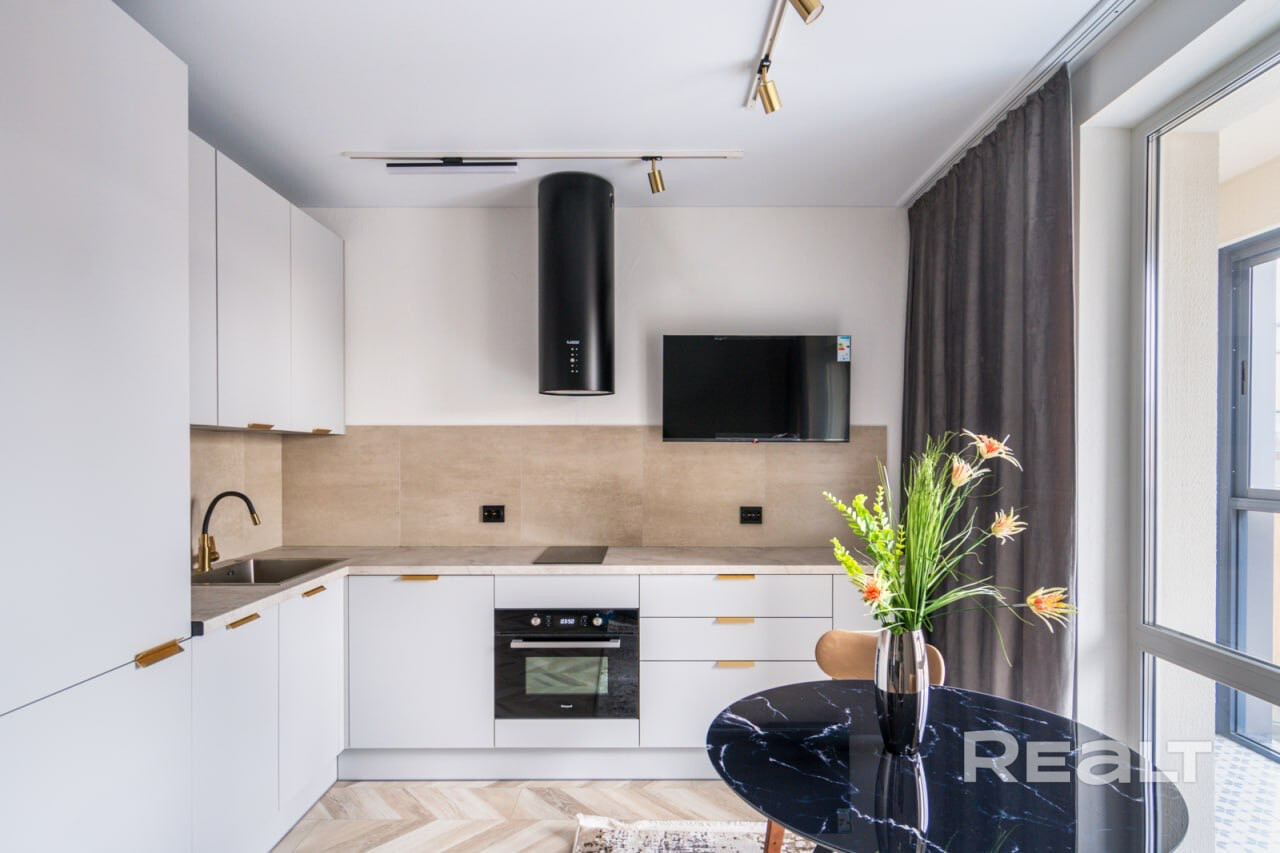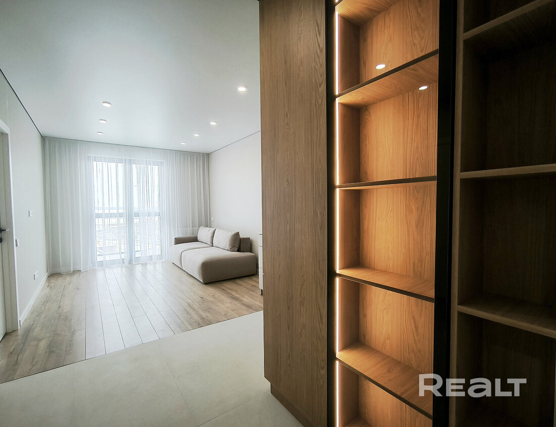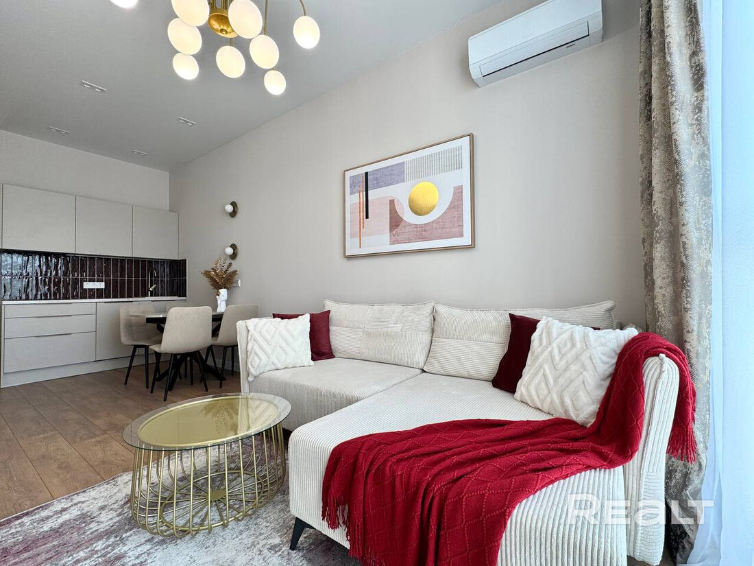Общая площадь квартиры — 46 метров, а на жилую приходится 31 квадрат. В гостиной, совмещенной с кухней, большое окно во всю стену. Стены выравнены и окрашены, на полу в комнатах дубовый паркет, а вдоль рабочей зоны кухни — плитка с подогревом. Установлен кондиционер.