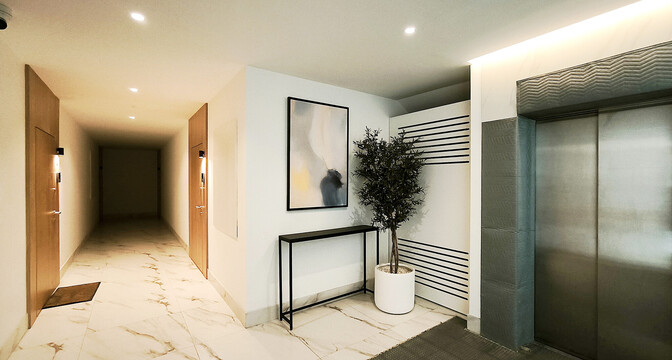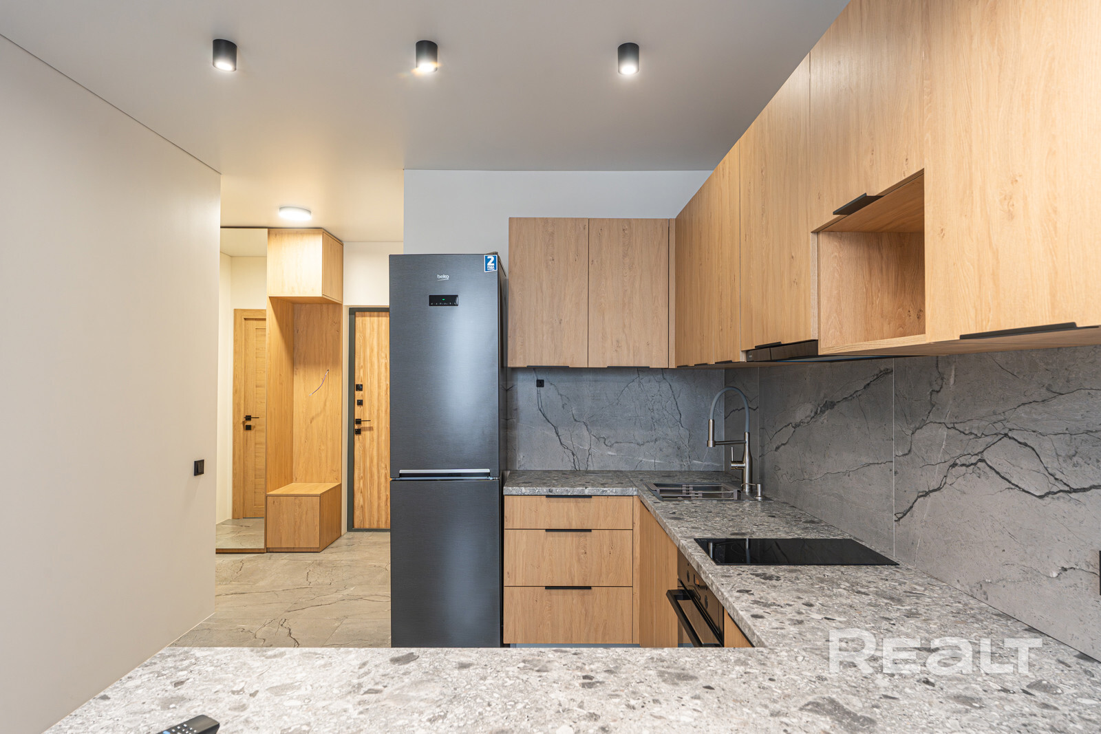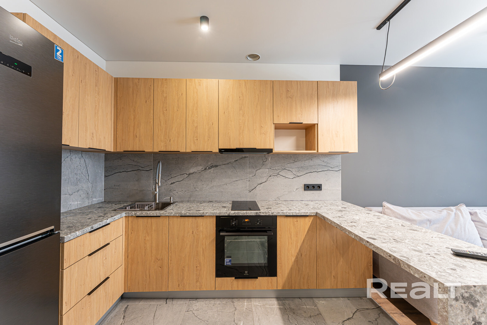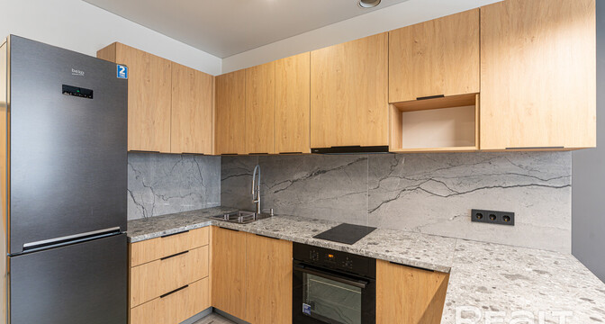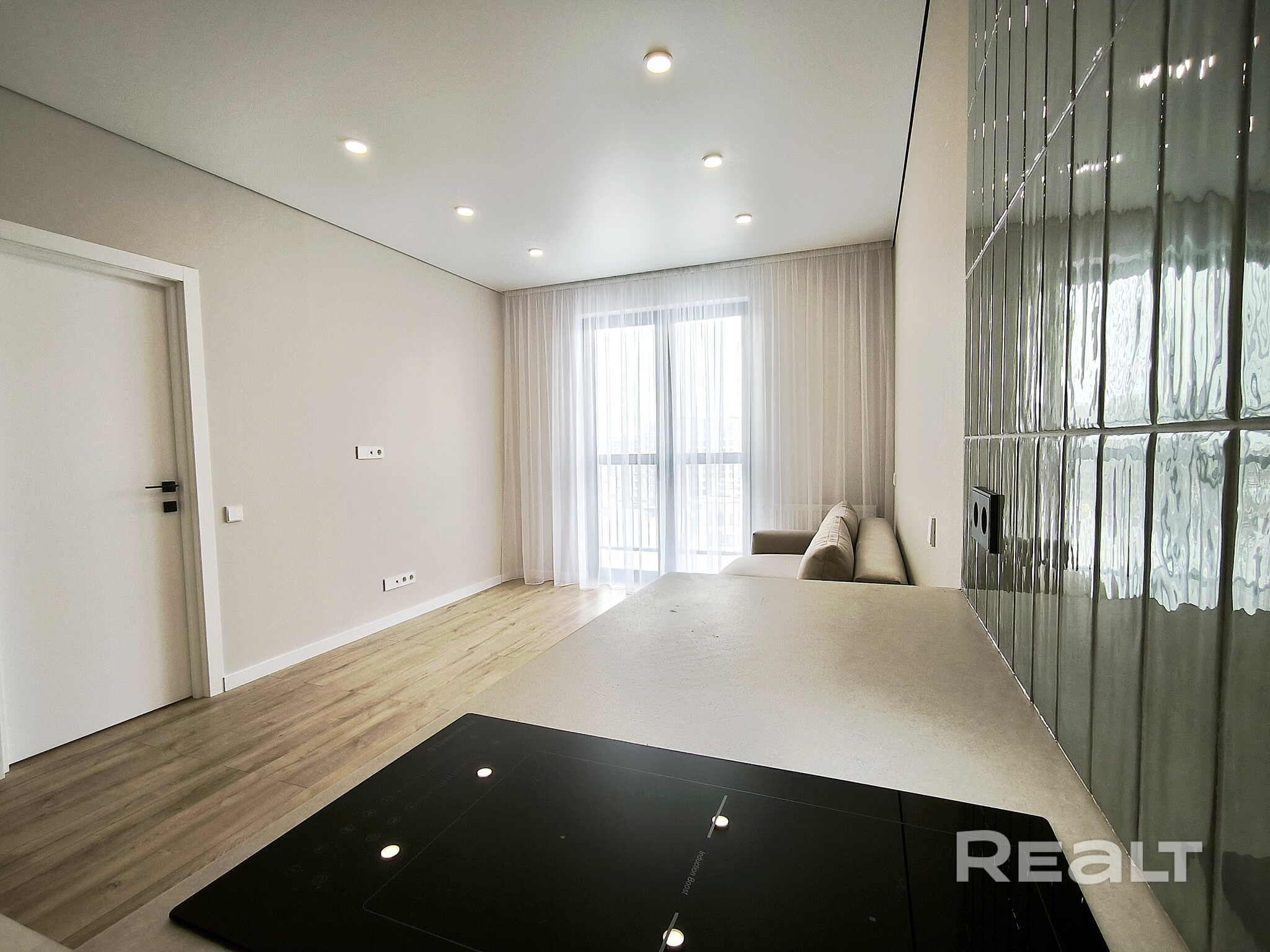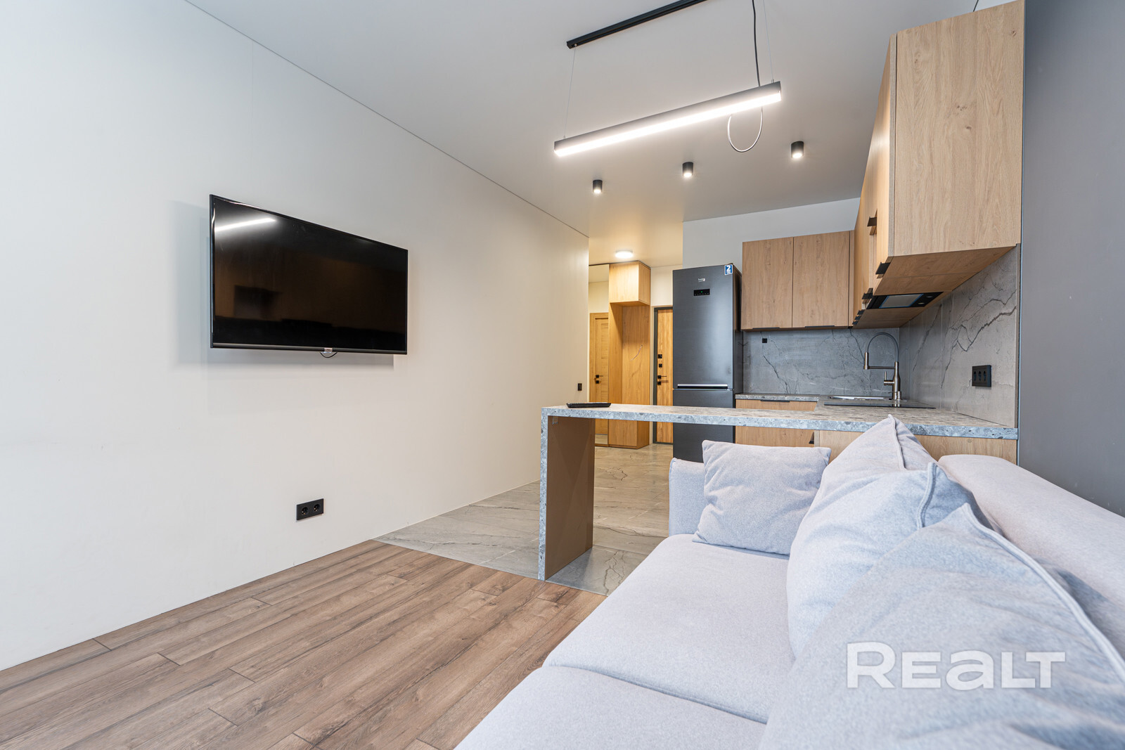 Общая площадь квартиры — 46 метров, а на жилую приходится 31 квадрат. В гостиной, совмещенной с кухней, большое окно во всю стену. Стены выравнены и окрашены, на полу в комнатах дубовый паркет, а вдоль рабочей зоны кухни — плитка с подогревом. Установлен кондиционер.