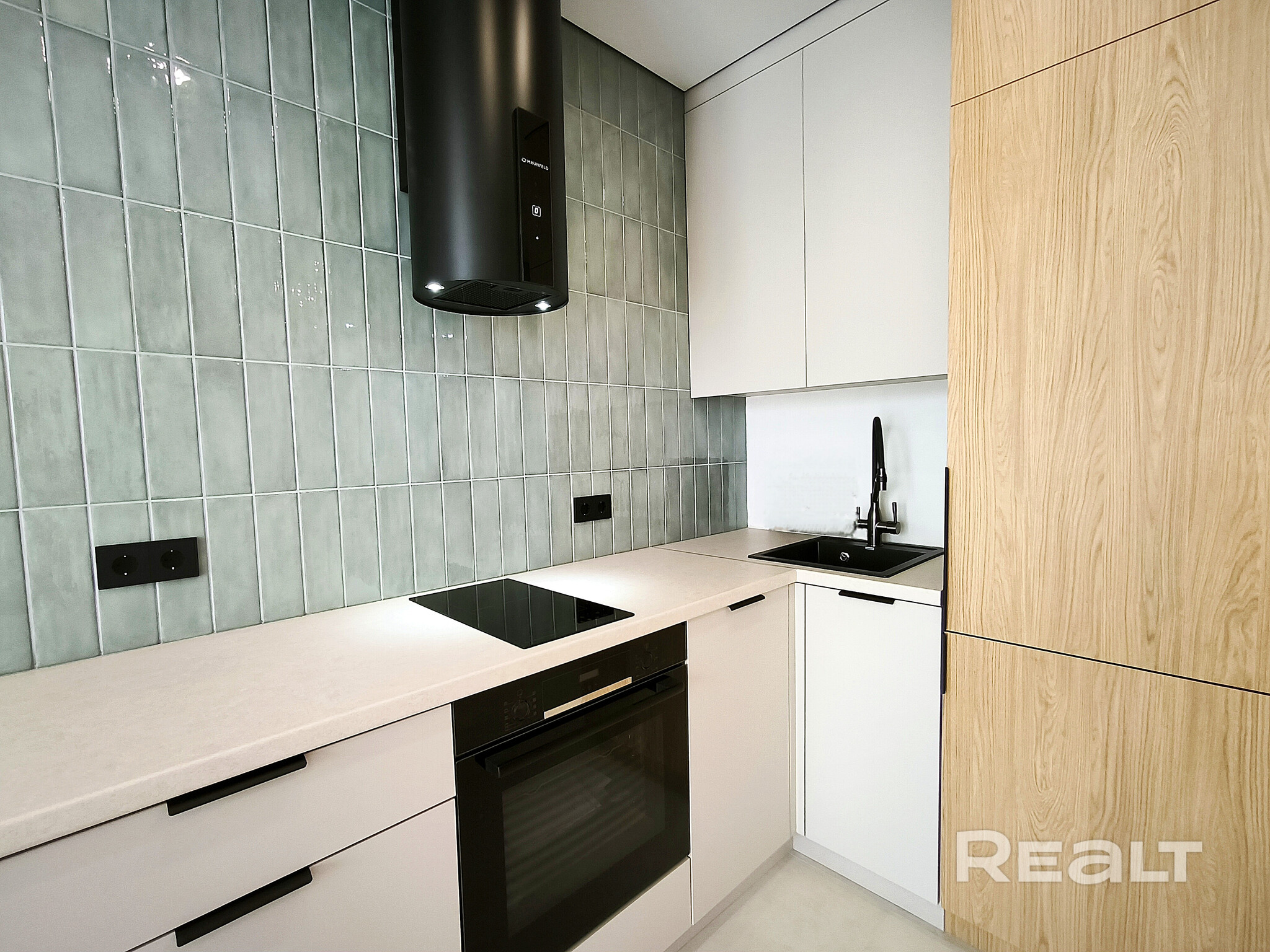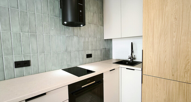В кухонной зоне фартук выполнен в акцентном изумрудном цвете. Из техники есть посудомоечная машина, духовой шкаф, варочная панель и вытяжка.