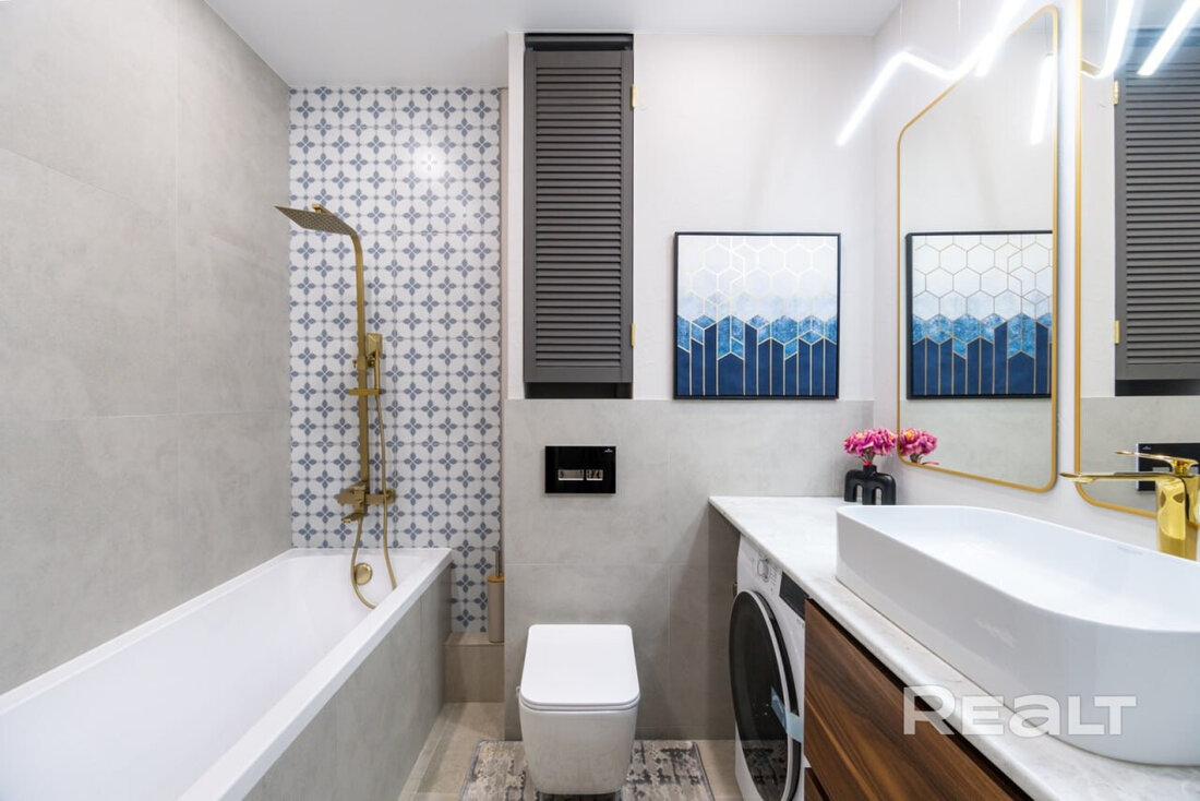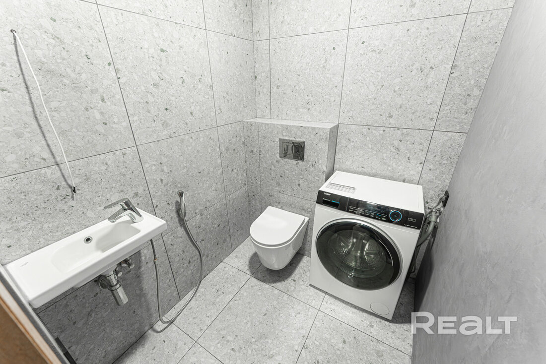 Санузел раздельный. В ванной комнате установлена ванна и умывальник, в туалете — подвесной унитаз, еще один умывальник и стиральная машина.