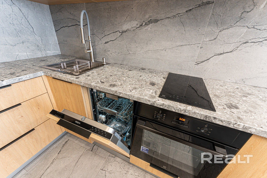 Еще из техники есть варочная панель и духовка Gorenje, вытяжка и посудомоечная машина Ariston, СВЧ LG с грилем.