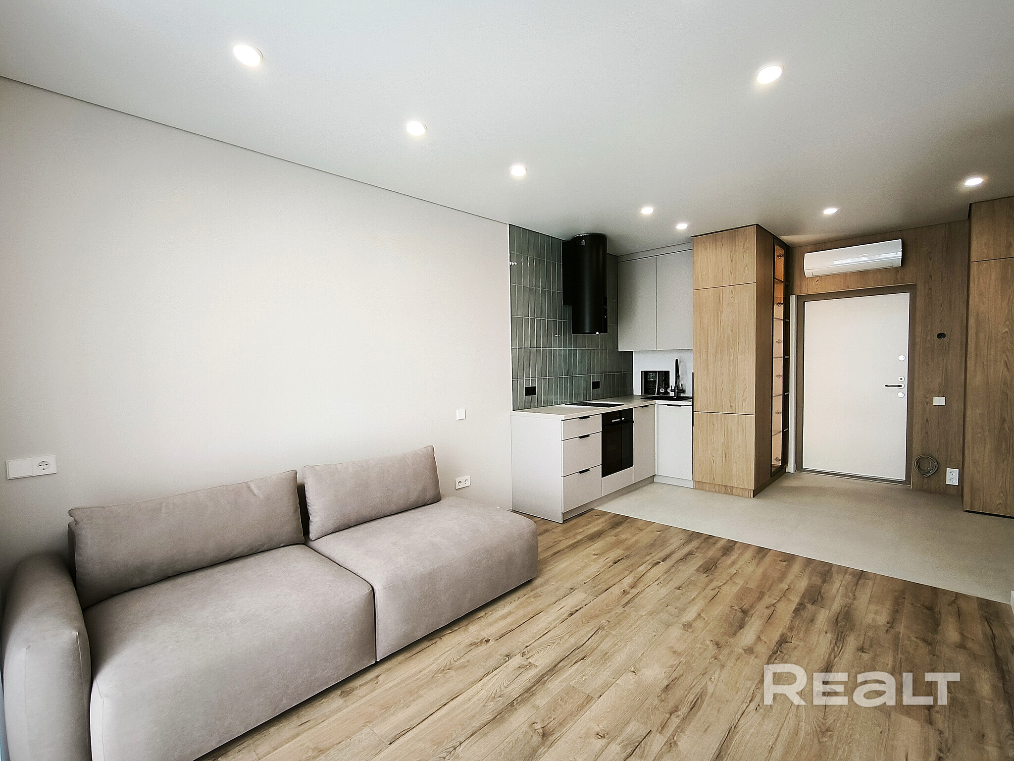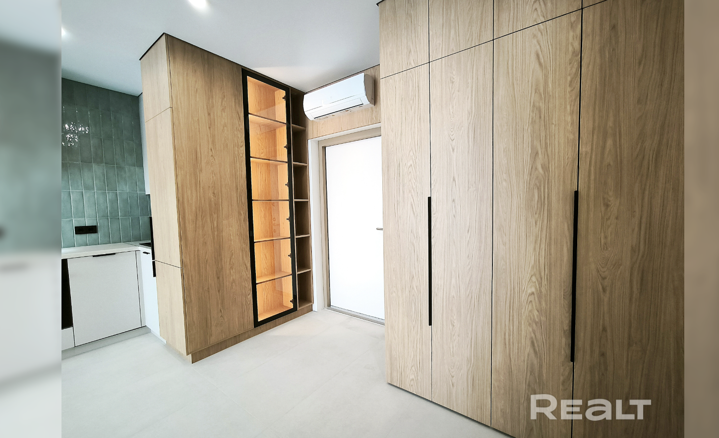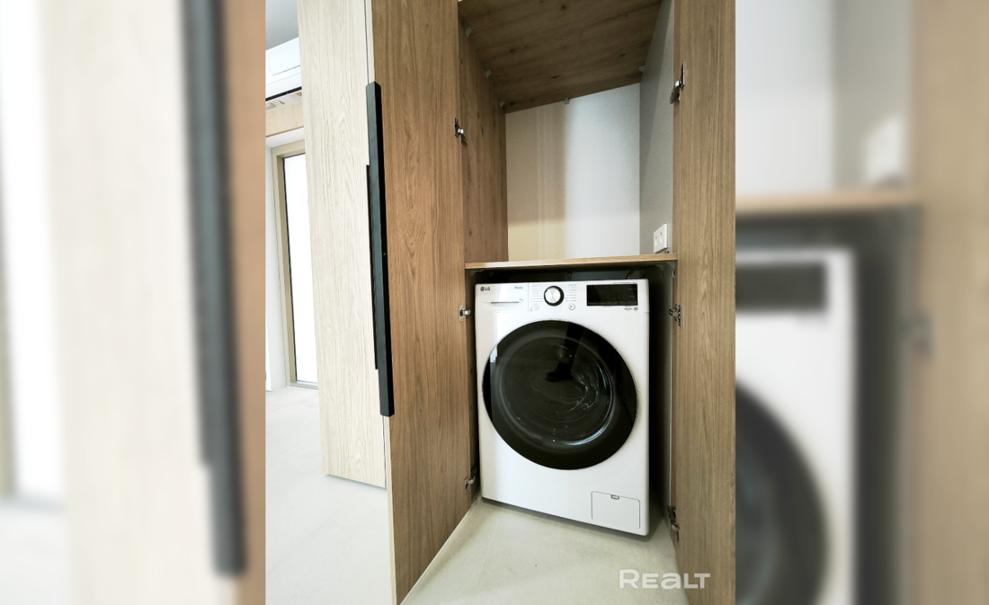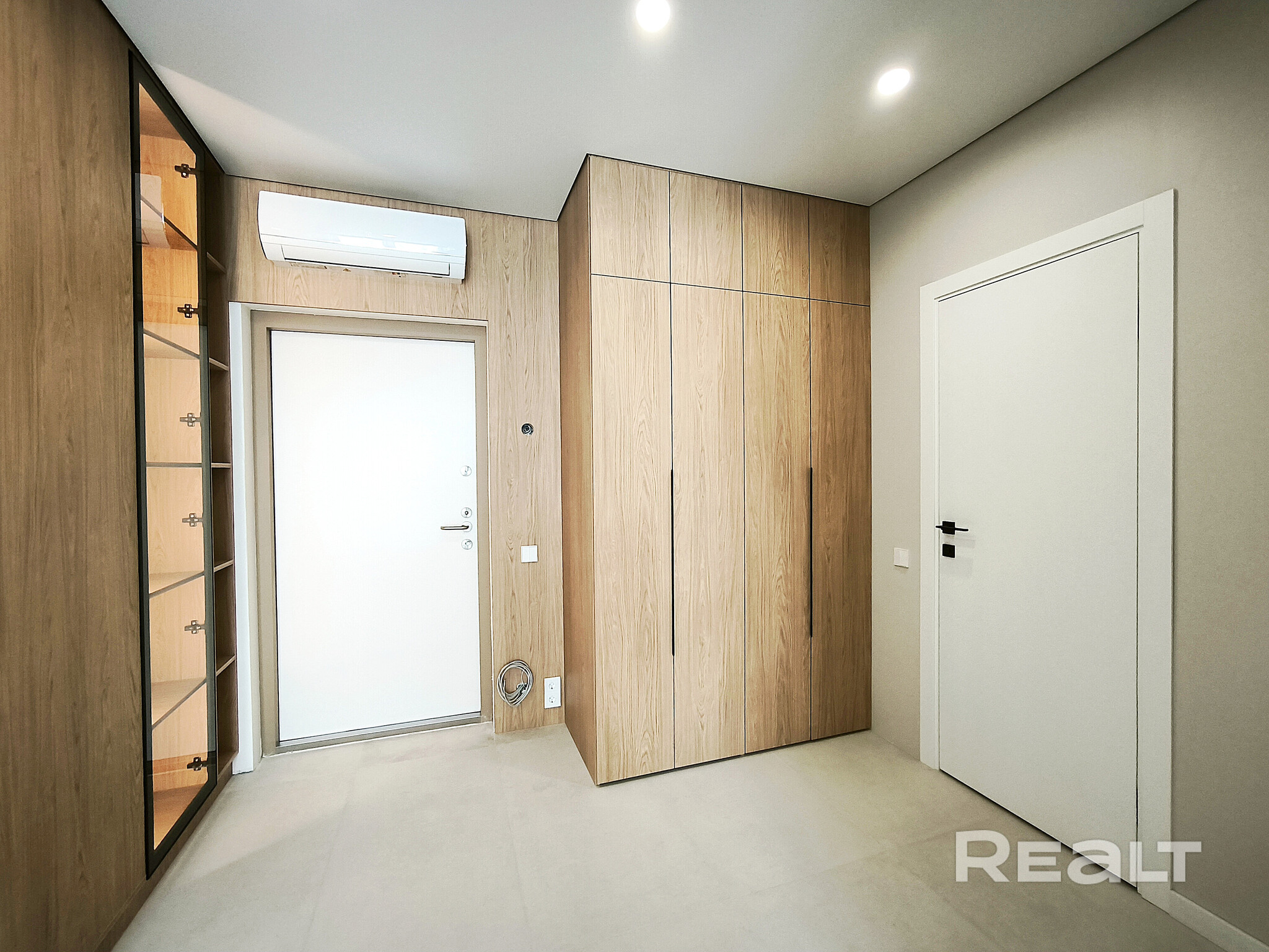 У входа в квартире оборудован шкаф для верхней одежды. Еще в нем спрятана стиральная машина. Над входной дверью установлен кондиционер.