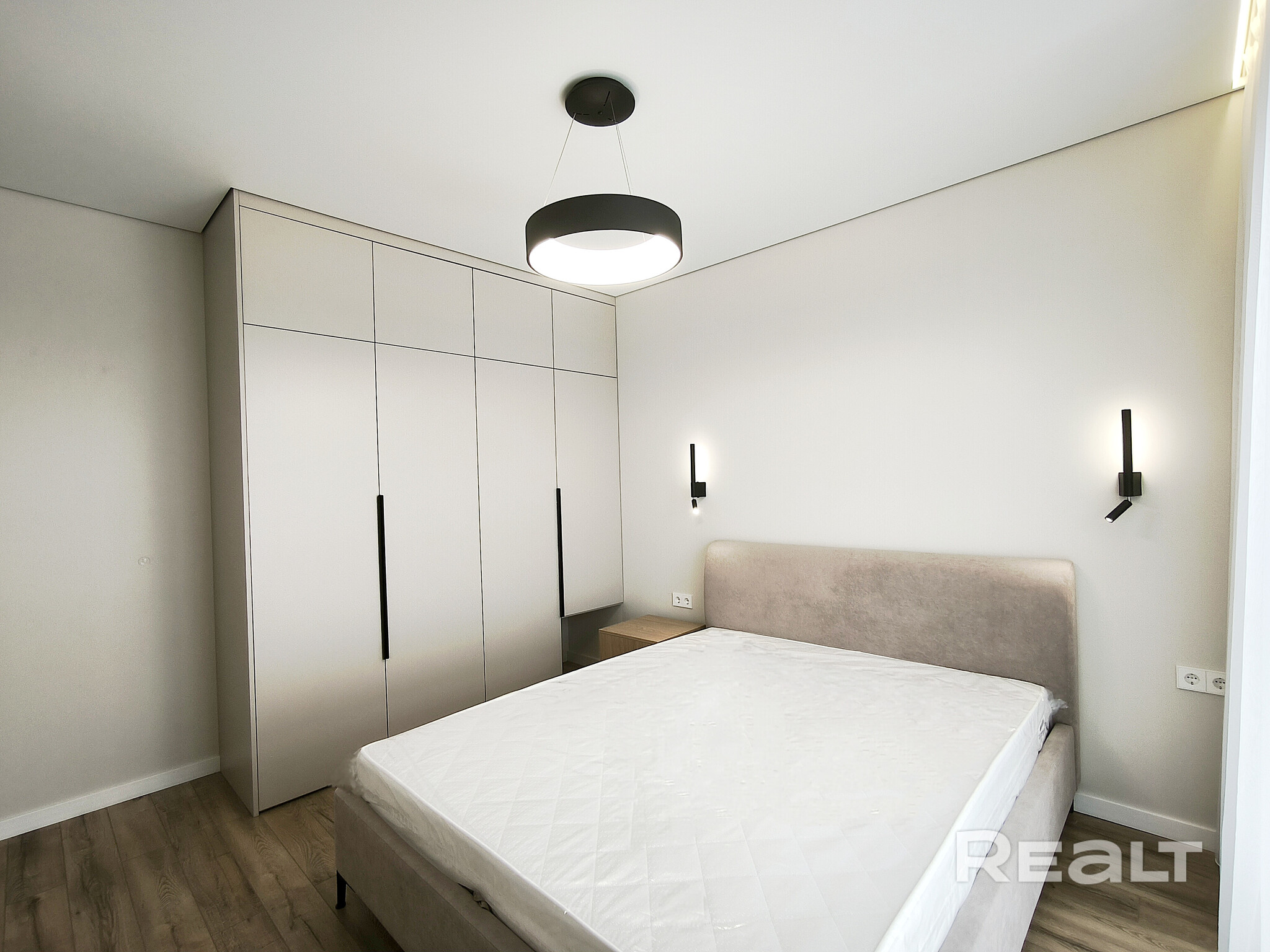 В спальне стоит кровать и большой шкаф.