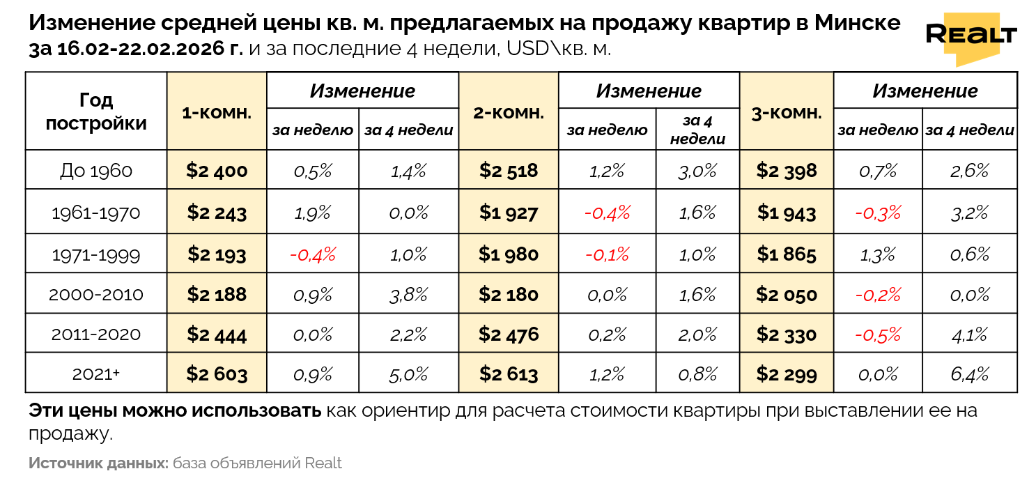 Брест — 1200 $/м2 (+0.5%), Витебск — 945 $/м2 (-0.3%), Гомель — 1026 $/м2 (+0.3%), Гродно — 1132 $/м2 (+0.1%), Могилев — 1060 $/м2 (-0.3%).