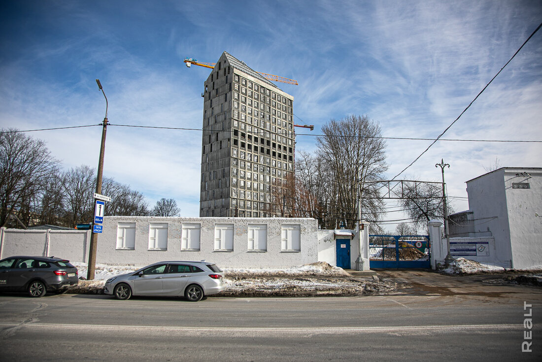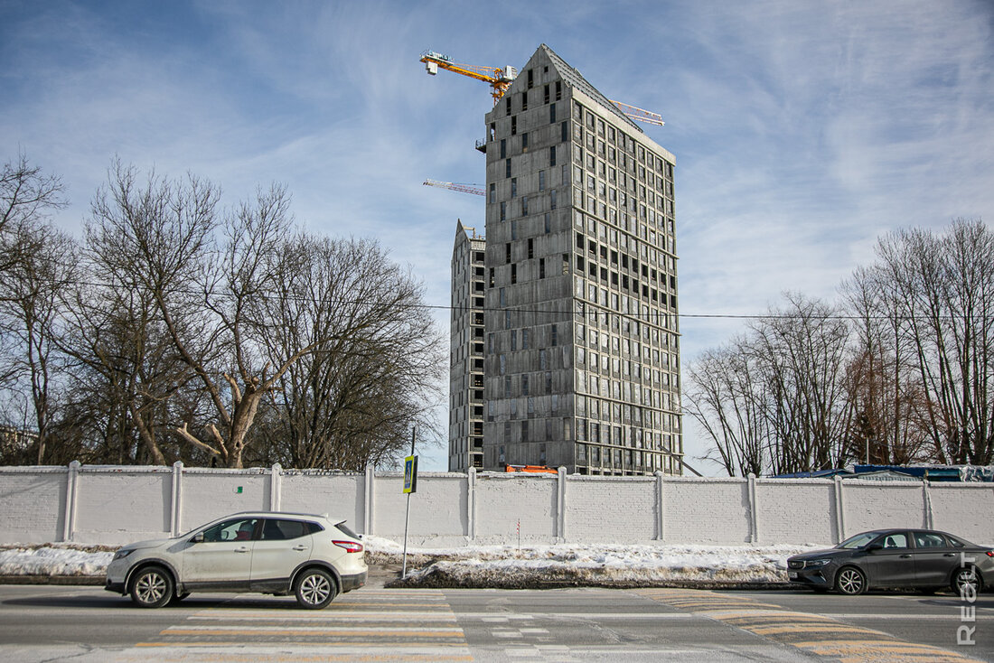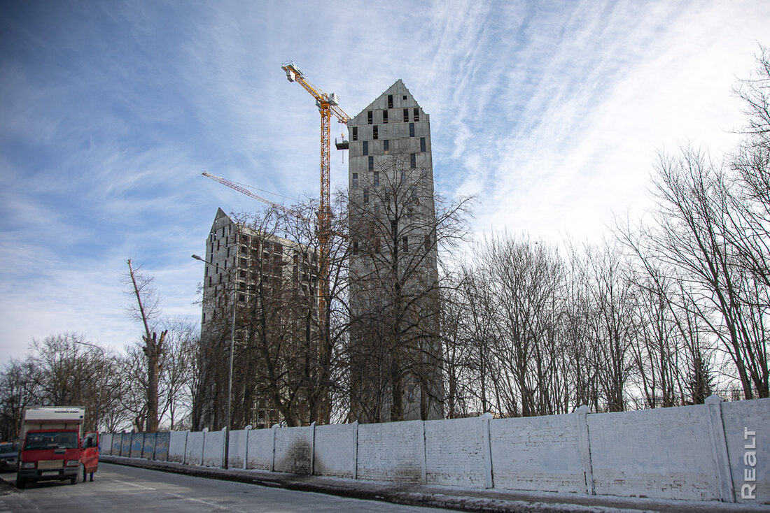 В ясный зимний денек две эффектные новостройки от «Минскстроя» можно заметить издалека. Тем более что они резко контрастируют с окружающим пейзажем, состоящим из пятиэтажек советского времени.