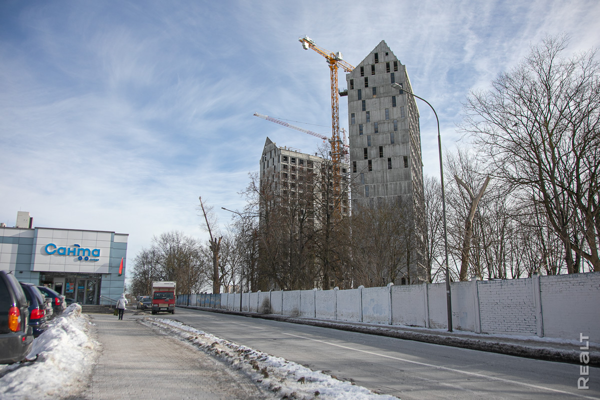 В ясный зимний денек две эффектные новостройки от «Минскстроя» можно заметить издалека. Тем более что они резко контрастируют с окружающим пейзажем, состоящим из пятиэтажек советского времени.