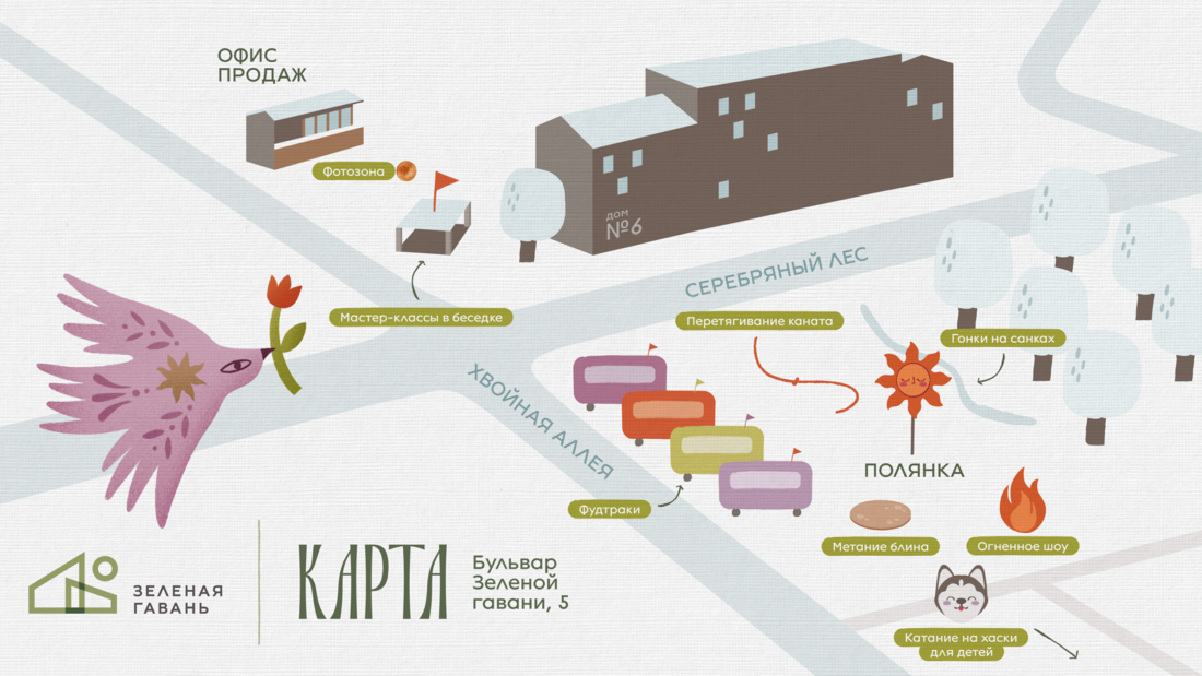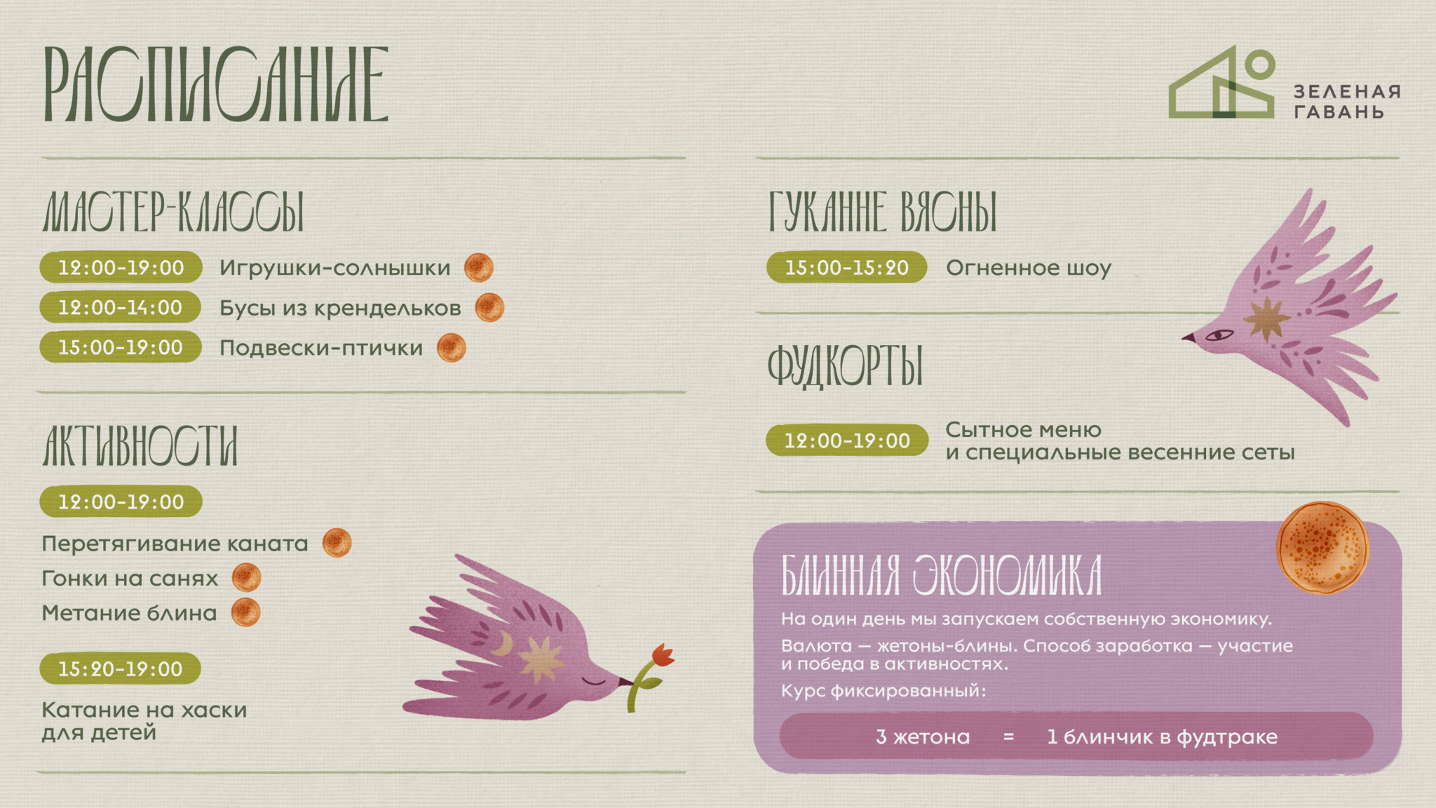Взрослым предложат поучаствовать в «блинной экономике». Правила простые: участники получают жетоны за активность. Один жетон можно заработать за гонки на санках, перетягивание каната, освоение мастер-классов, метание блинов или публикацию сторис либо поста в Instagram с отметкой аккаунта Зеленой гавани. Накопив три жетона, их можно обменять на бесплатный блинчик. На площадке также будут работать фудтраки. К празднику они подготовят специальные масленичные сеты.