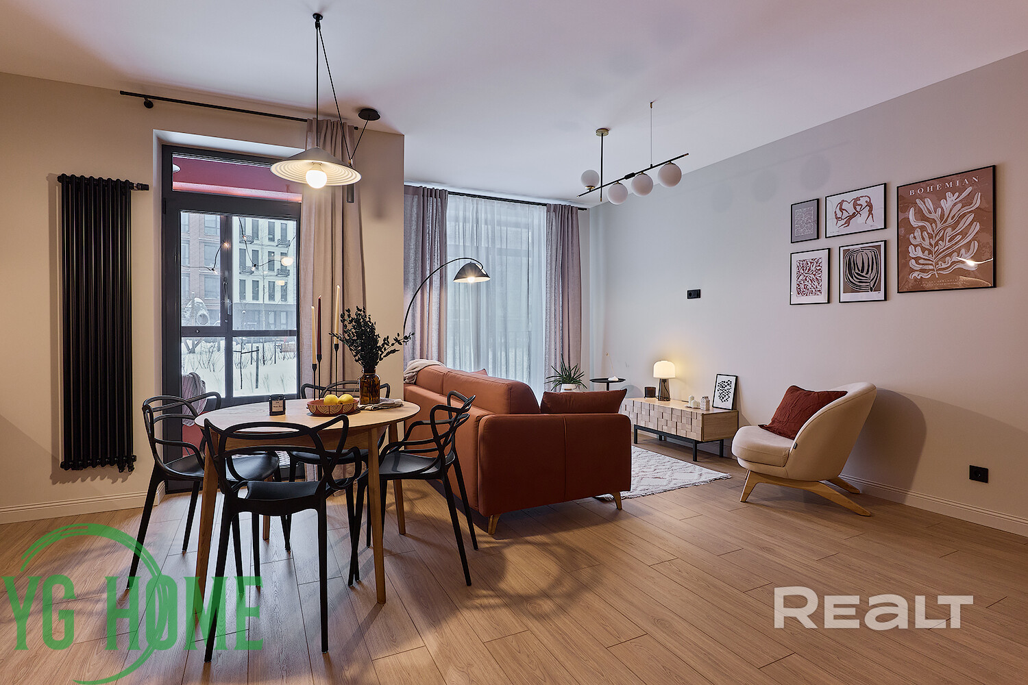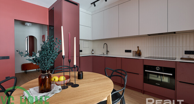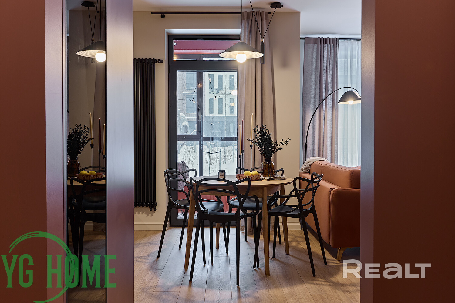 В кухне-гостиной обустроена столовая. В квартире продумано несколько сценариев освещения. Установлена и бытовая техника бренда Bosch: посудомойка, стиральная машина с функцией сушки, духовой шкаф с режимами микроволновки. Холодильник тут встроенный.