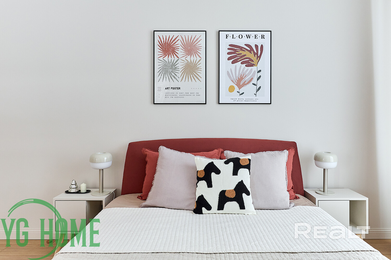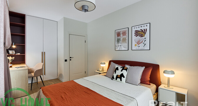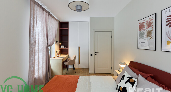 В светлой спальне удалось выделить рабочее место. Здесь же есть шкаф для вещей.