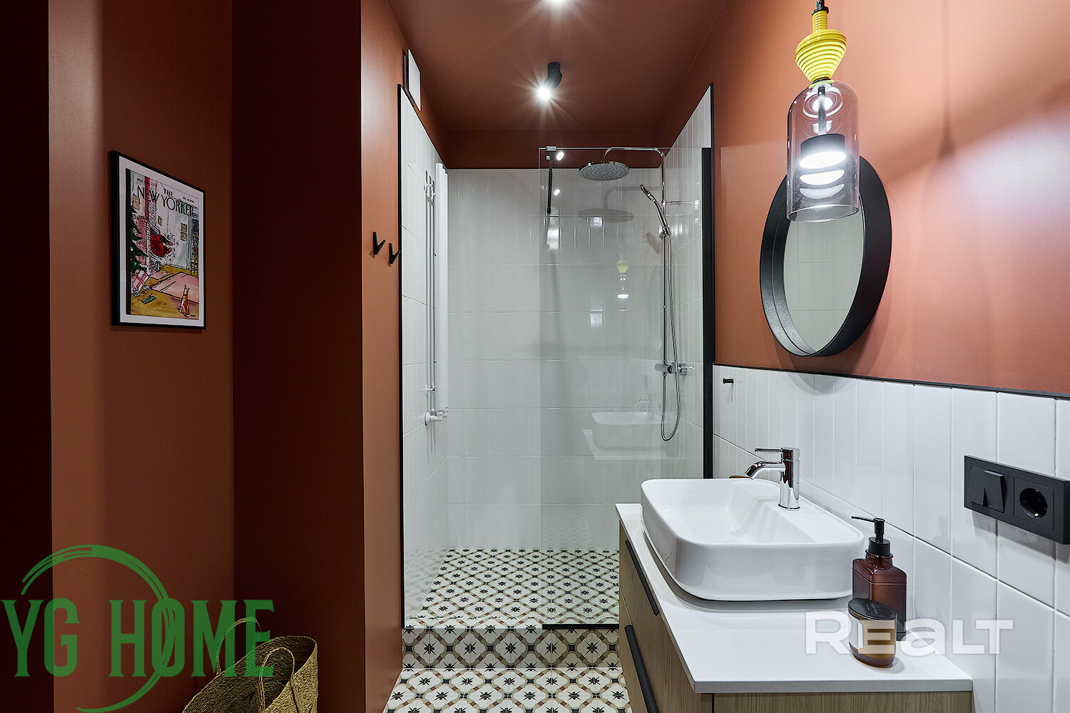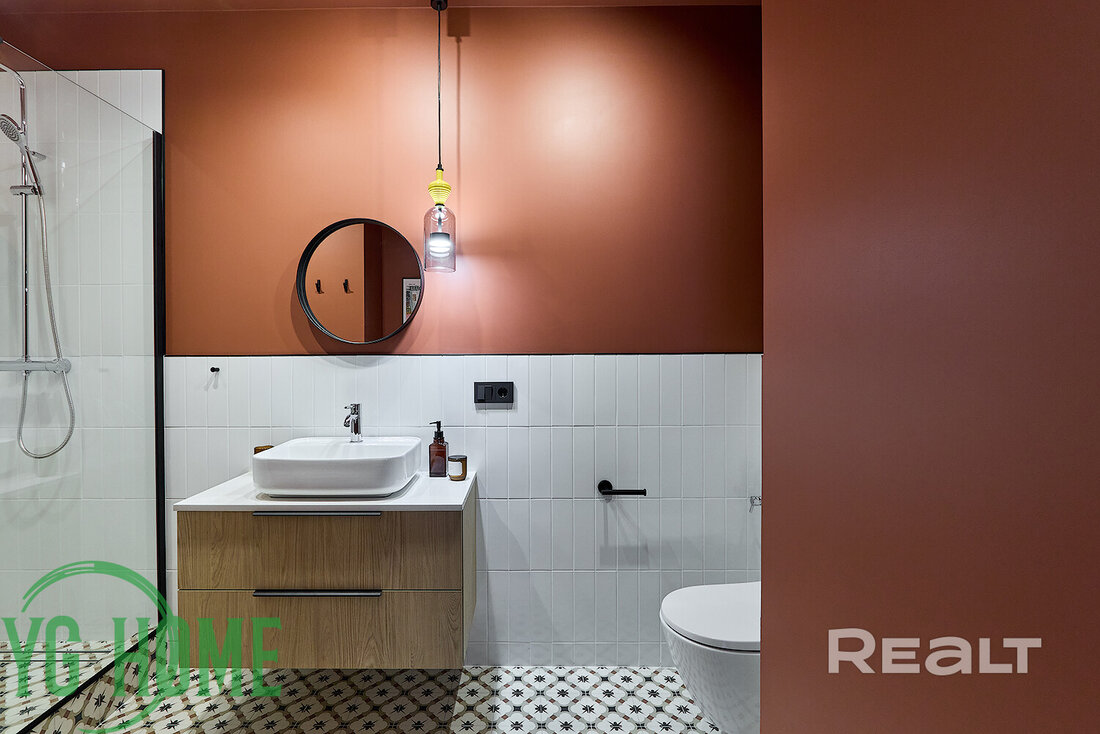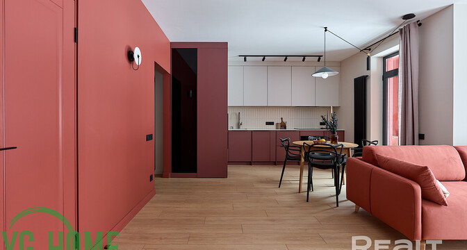 Жилье уже готово к проживанию: стены, потолки, кухонный гарнитур, двери и другая корпусная мебель выделяются ярким теплым цветом.