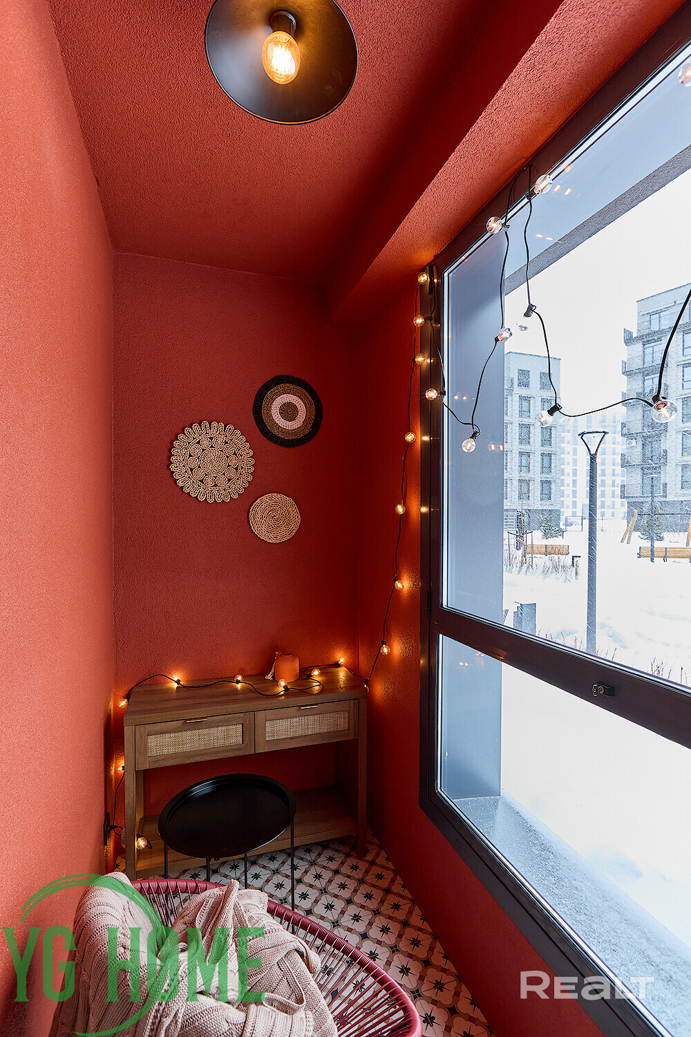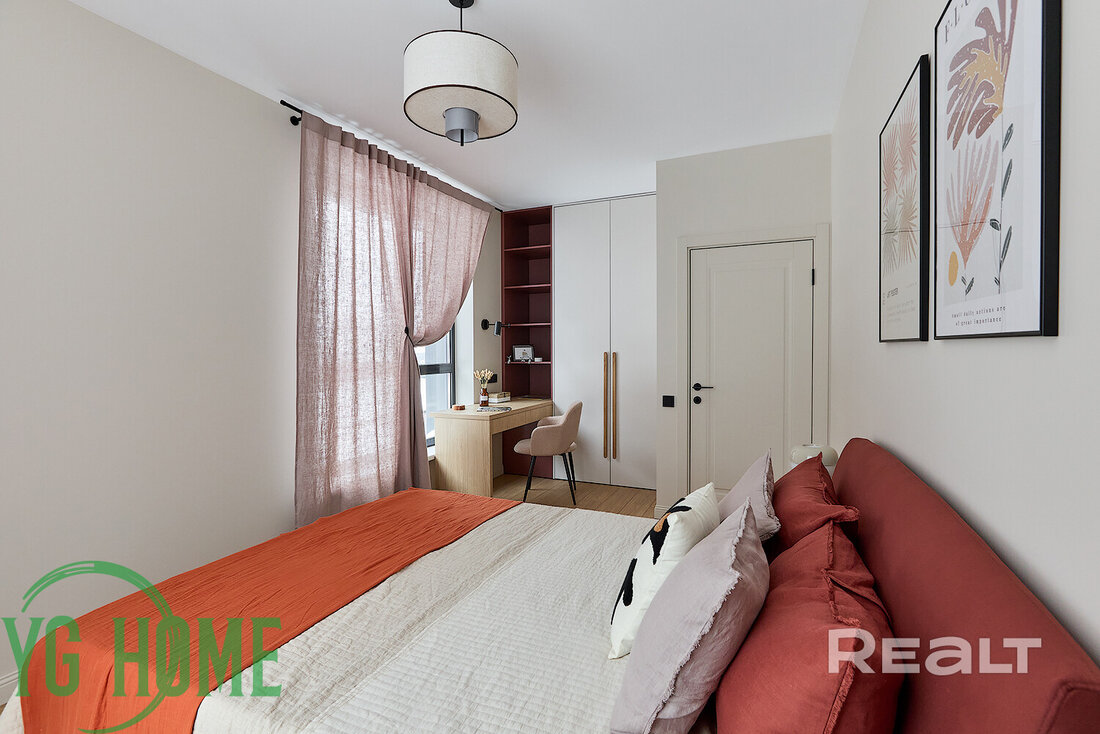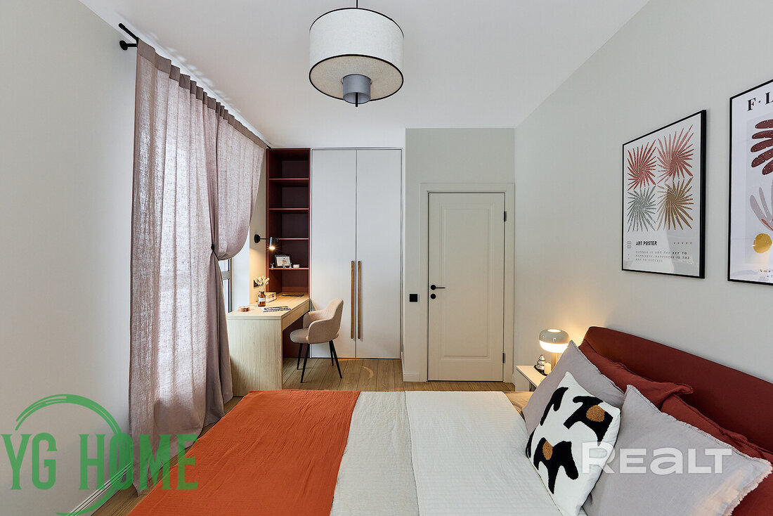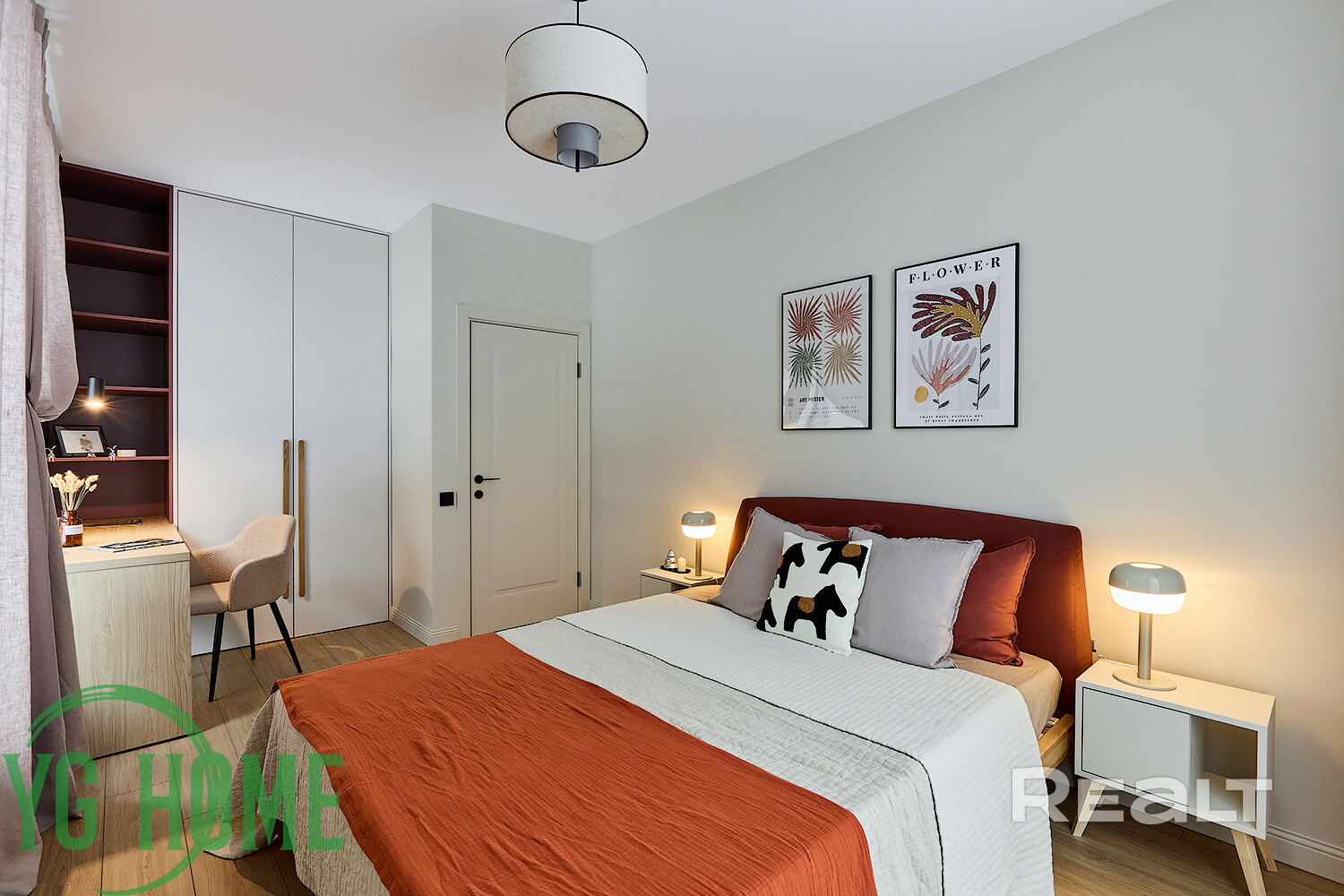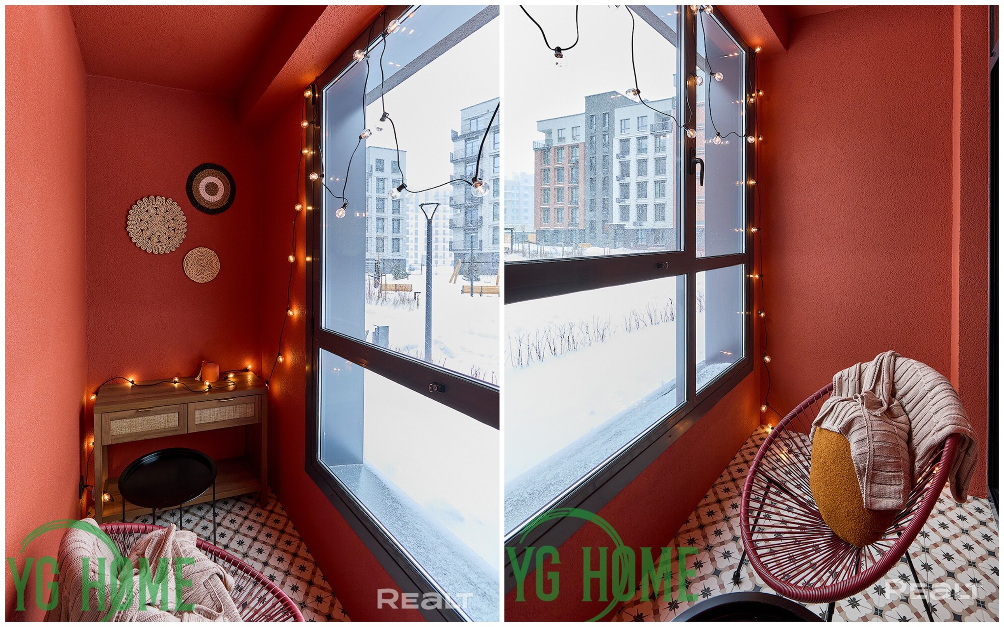 В этой евродвушке не станет скучно из-за ярких фасадов кухни и стен, даже балкон тут нетипичного цвета. Кроме этого, жилье готово к проживанию — обставлено хорошей техникой и мебелью. Два окна в спальне позволили организовать там рабочее место. Посмотрите, как все удалось обустроить. Цена в конце.