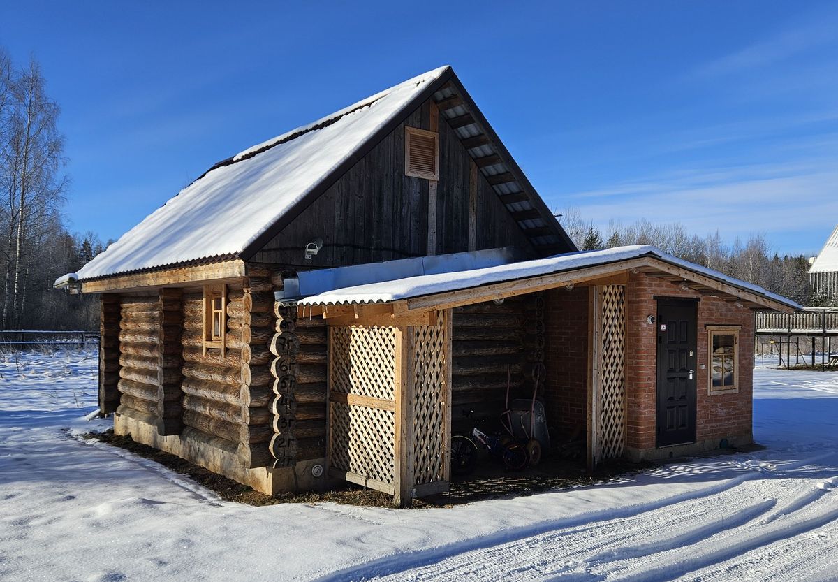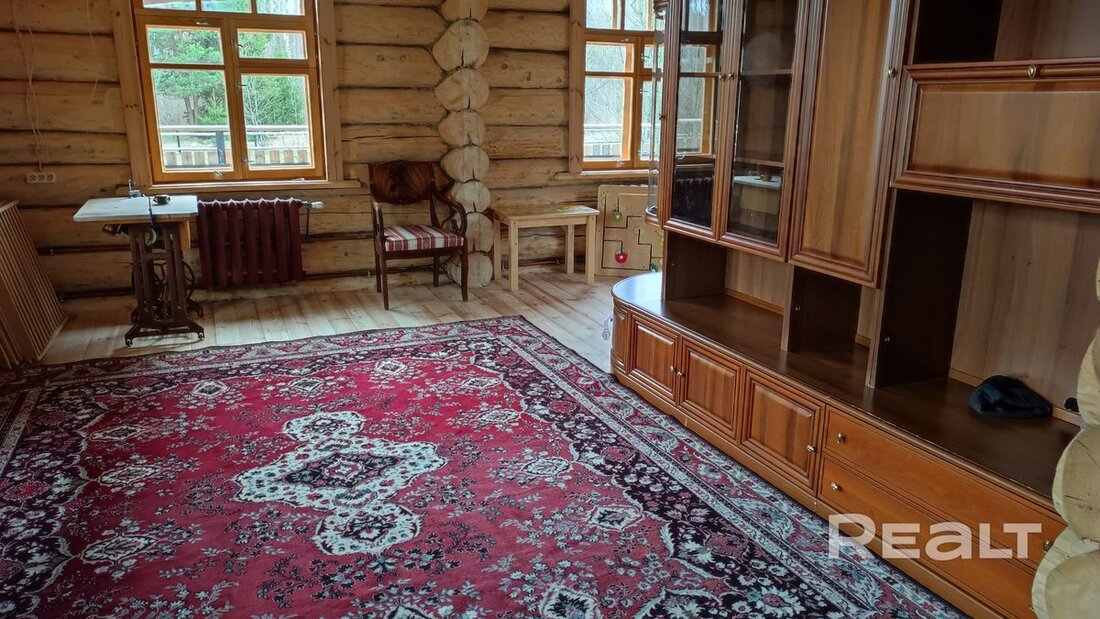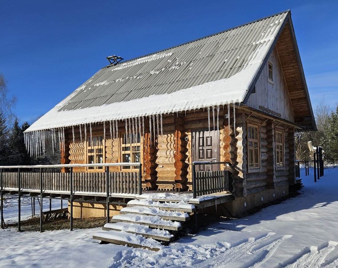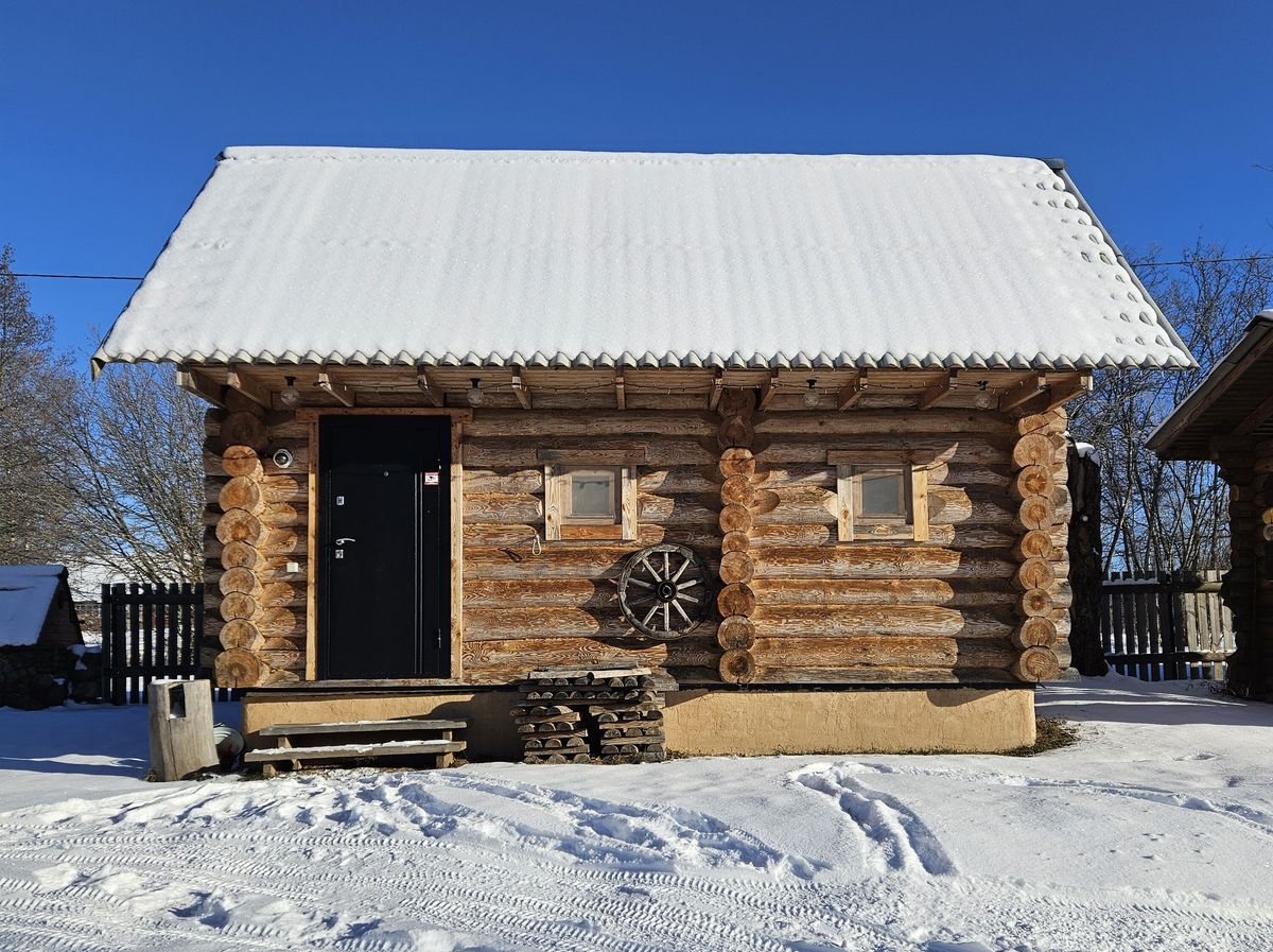 Все строения новые, из бревен большого диаметра. На крыше — шифер. Площадь основного дома — 80 квадратов. Внутри все по классике деревенского дома: полы, потолки, стены и даже оконные рамы — деревянные. Планировка простая, терраса при входе, санузел с душем, гостиная-кухня и спальня.