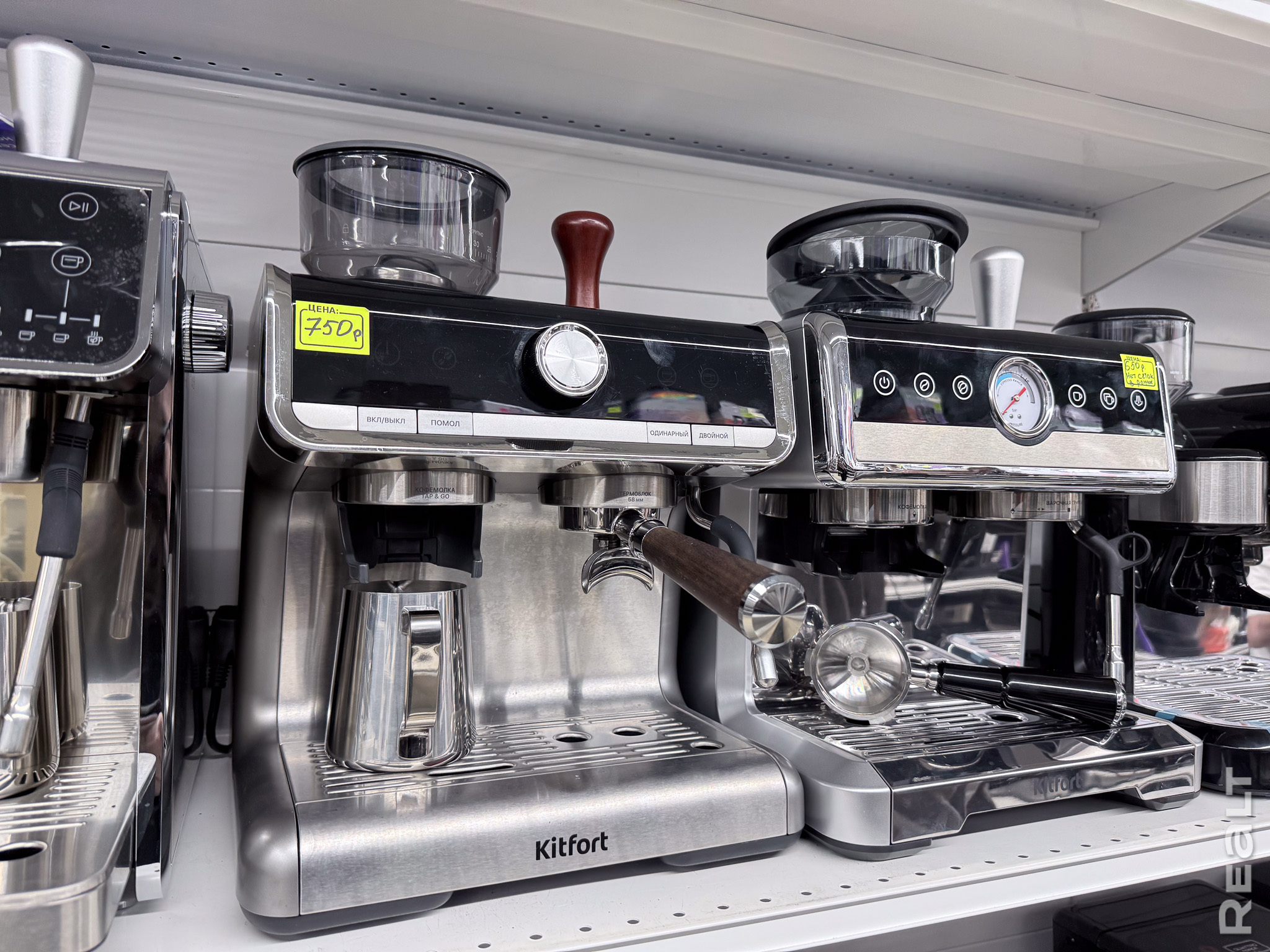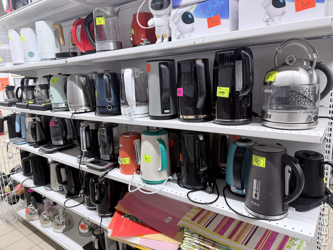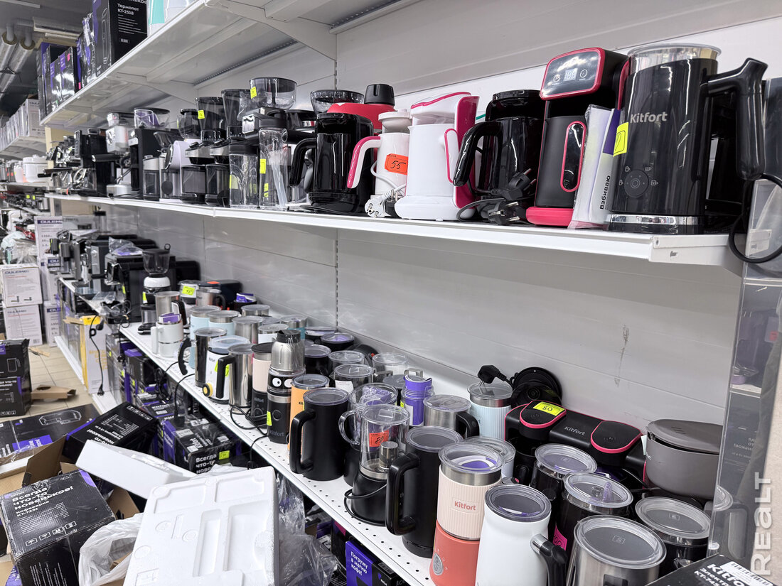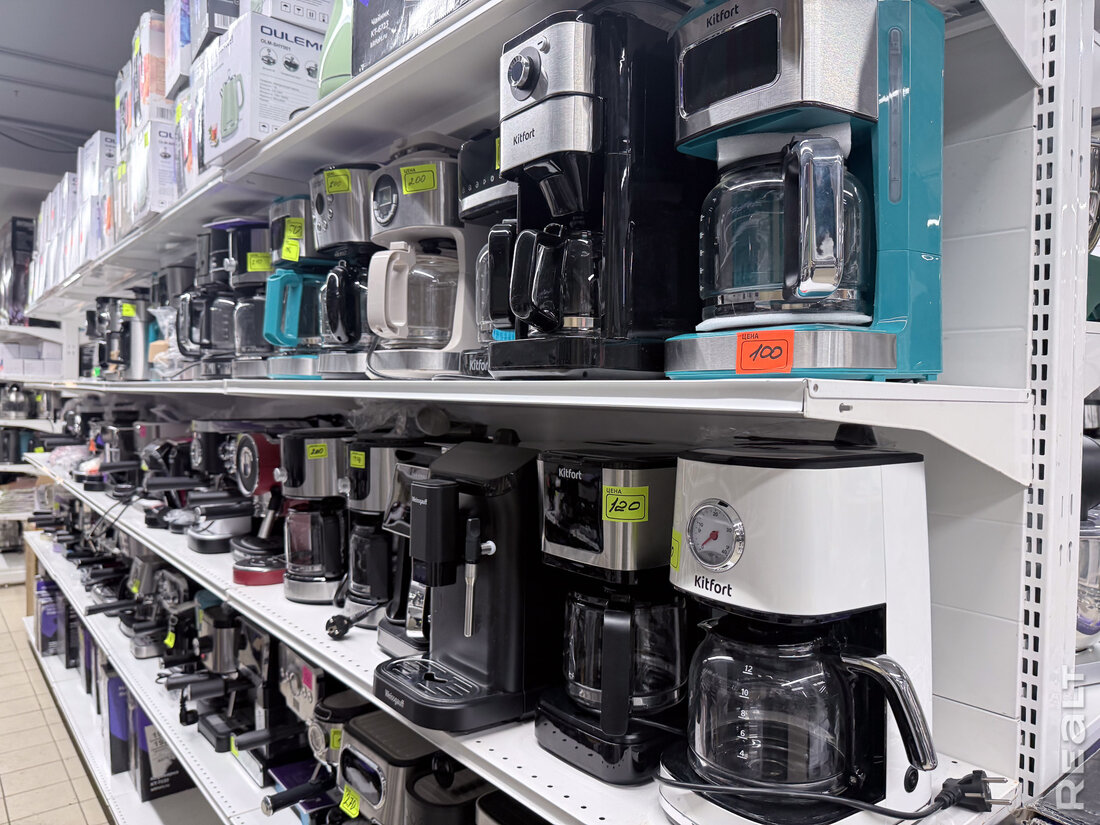 Несколько стеллажей заняты кофеварками, кофемашинами и кофемолками. Есть варианты от небольших капельных и рожковых кофеварок до серьезных кофемашин. Из брендов — это, в основном, Kitfort, DeLonghi и Weissgauf. Также можно выбрать и чайник.