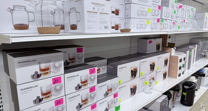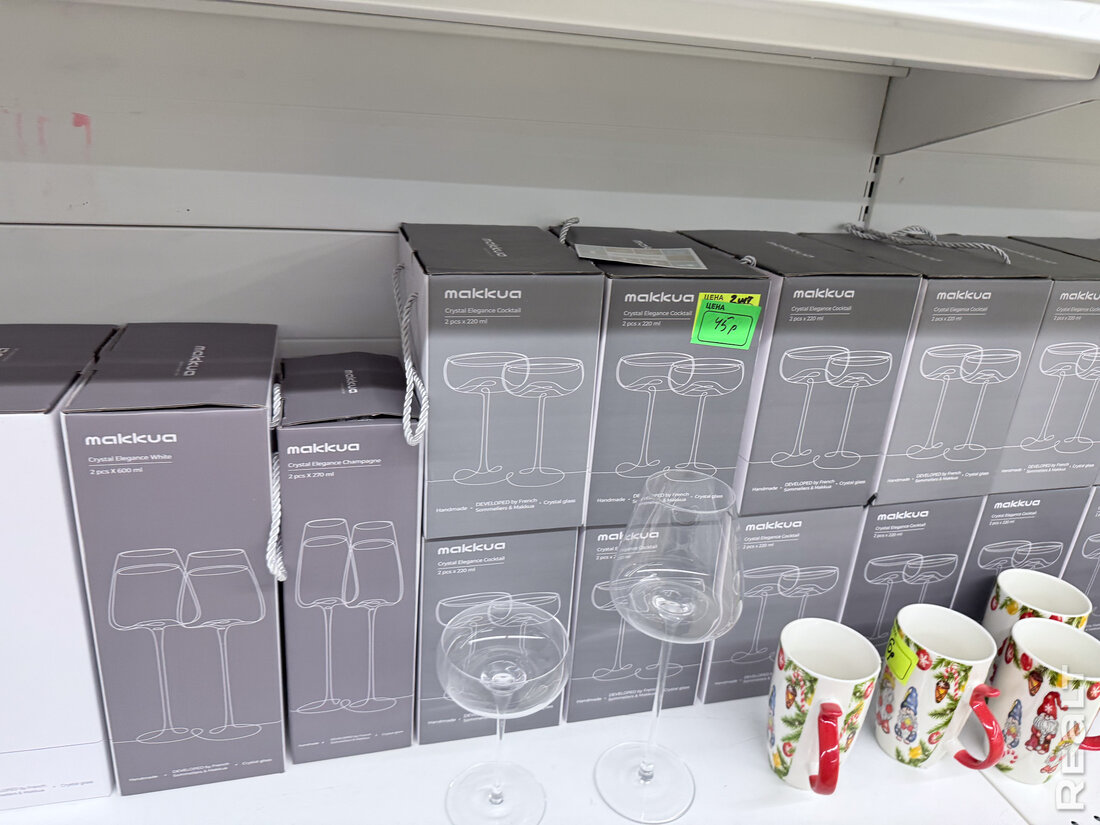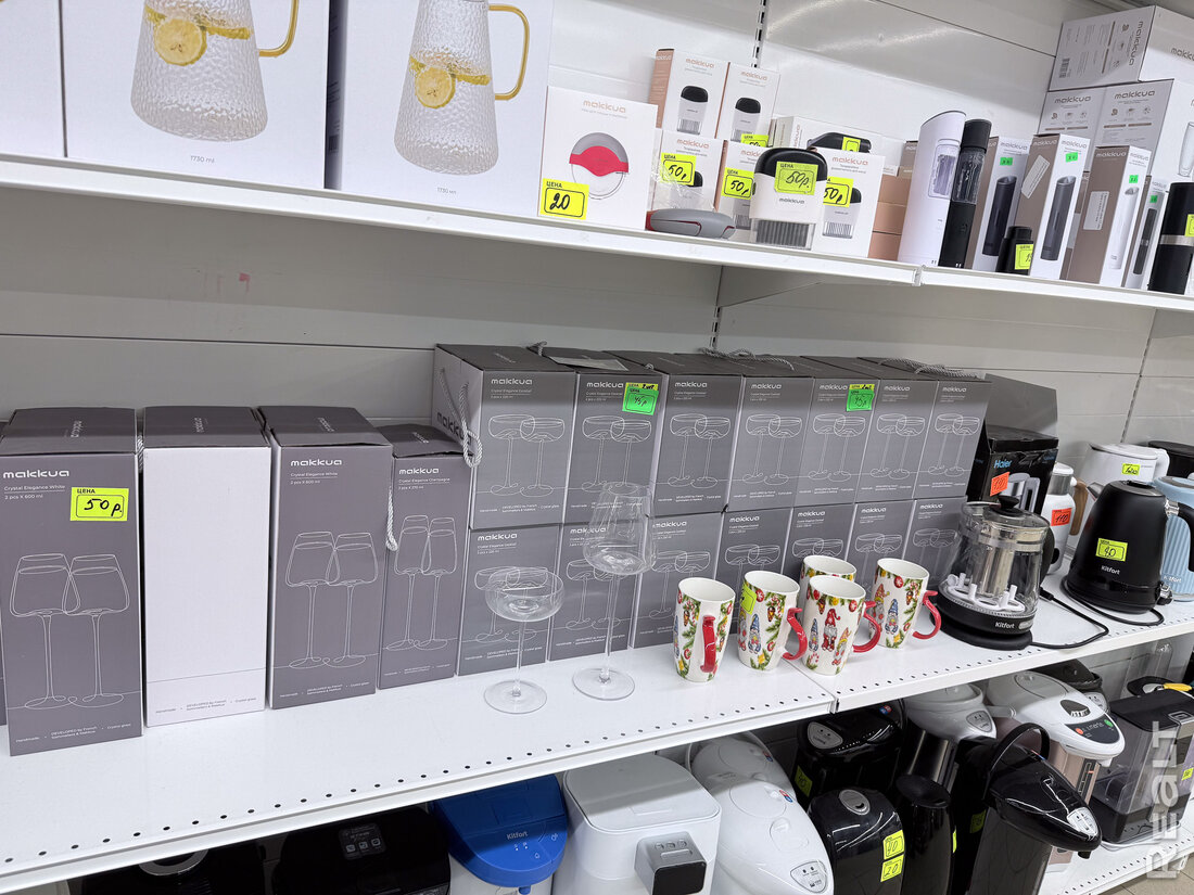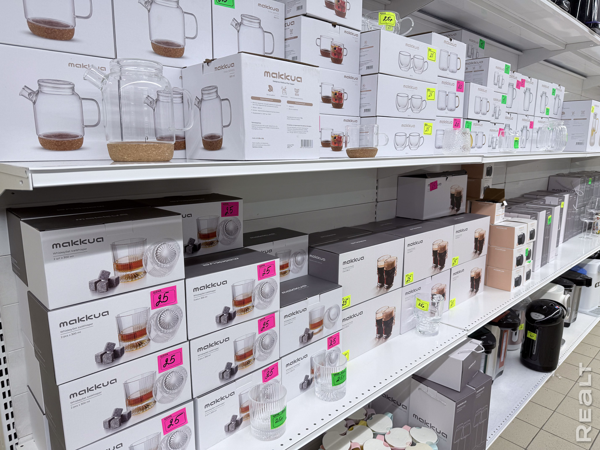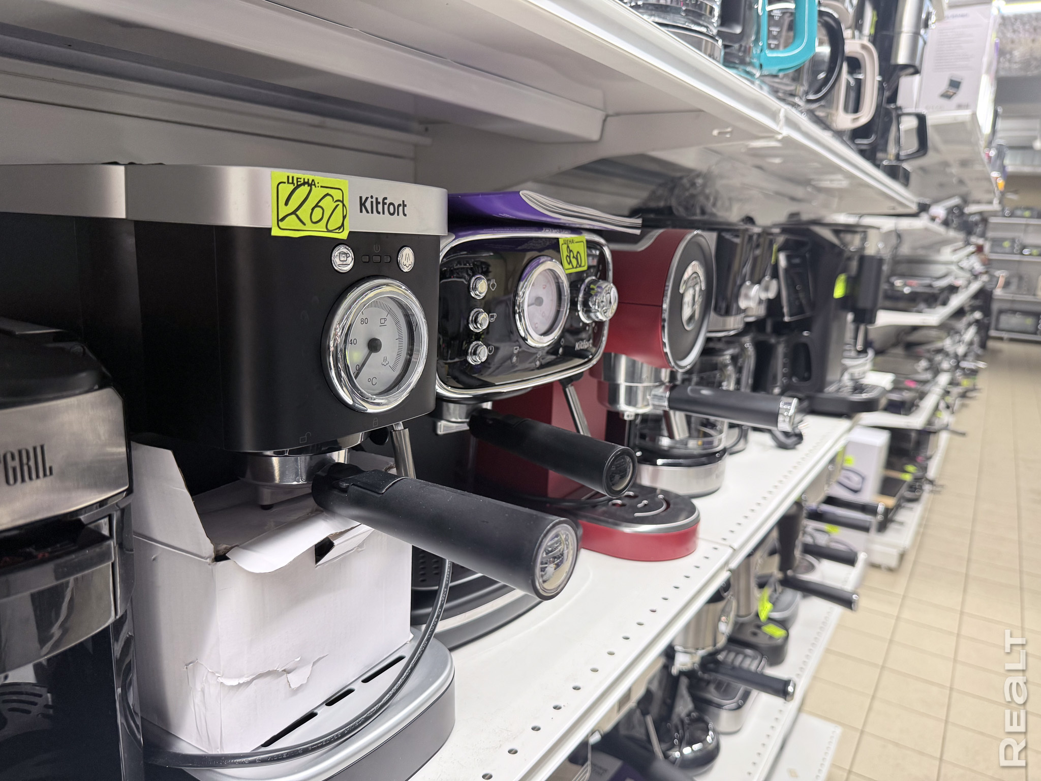 Несколько стеллажей заняты кофеварками, кофемашинами и кофемолками. Есть варианты от небольших капельных и рожковых кофеварок до серьезных кофемашин. Из брендов — это, в основном, Kitfort, DeLonghi и Weissgauf. Также можно выбрать и чайник.