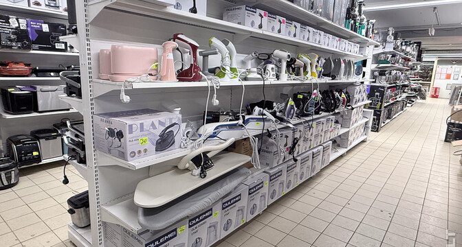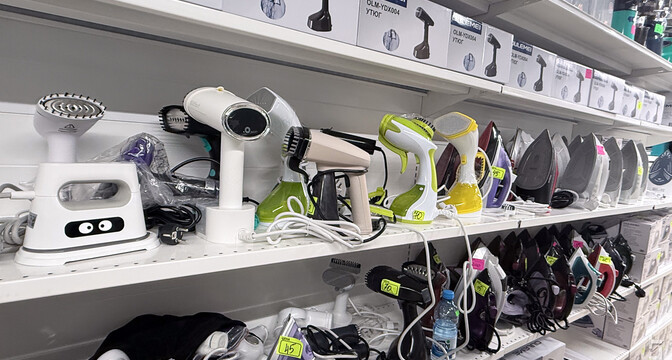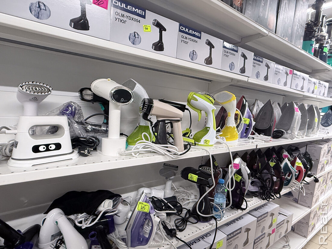 Из мелкой техники в магазине еще есть йогуртницы, блендеры, отпариватели, утюги, вакууматоры массажеры для ног. Еще можно купить обогреватели и вентиляторы. Также есть строительные материалы — электропилы, перфораторы, шуруповерты.