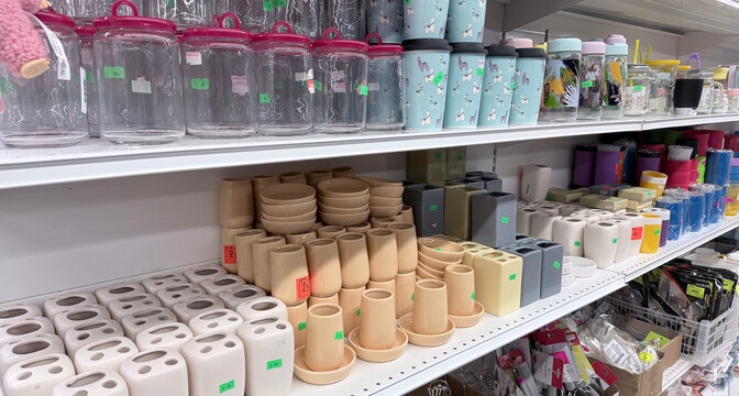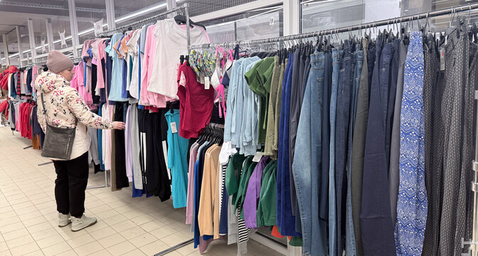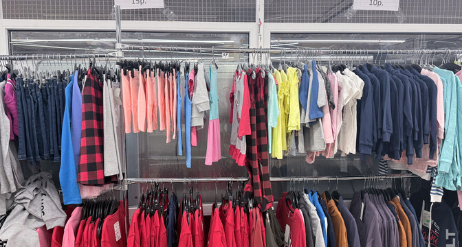 Есть несколько стоек с дешевой одеждой, детская обувь и мелочи, посуда и товары для декора.