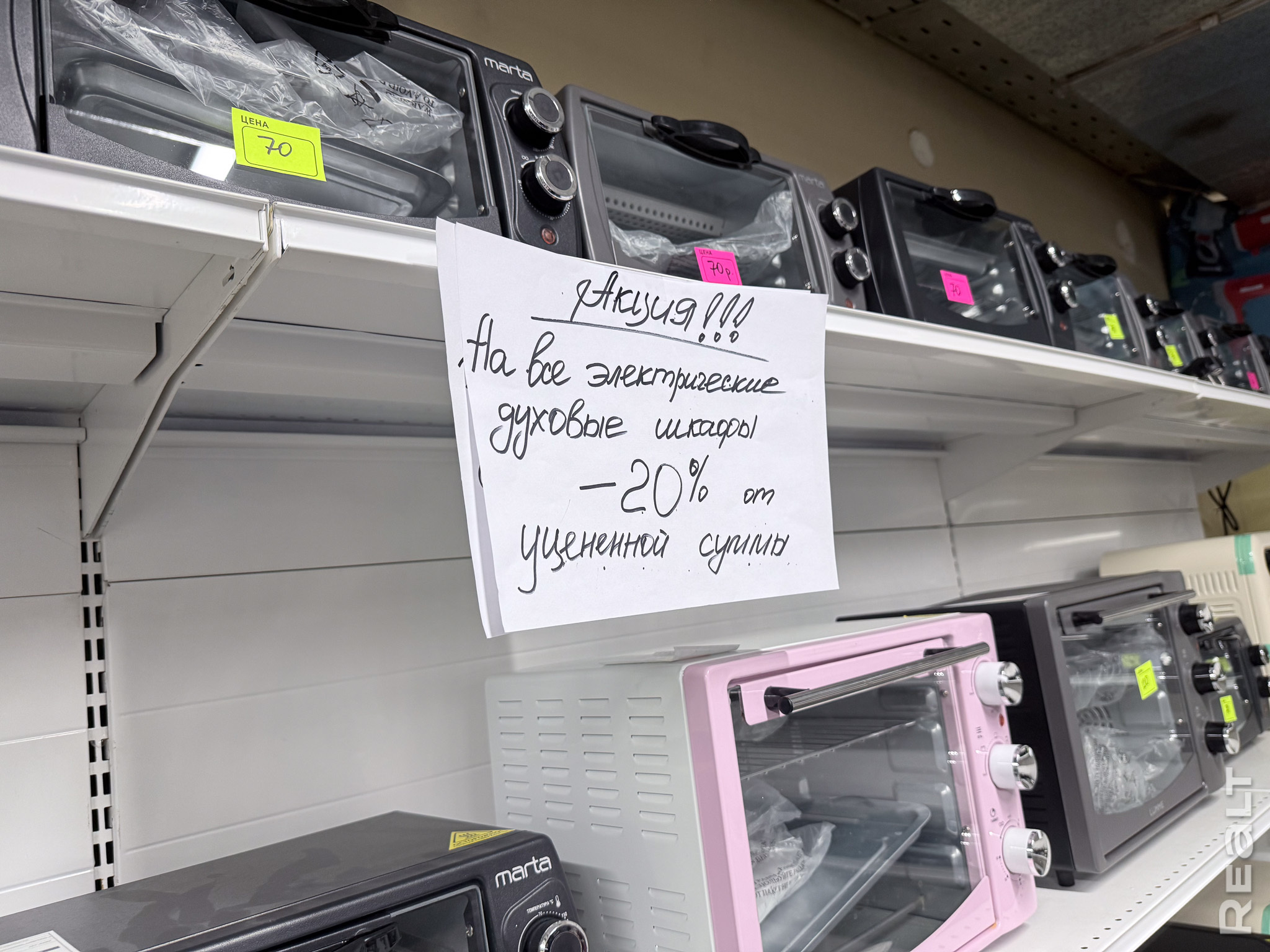 На электрические духовые шкафы в магазине предлагают скидку 20% от уцененной стоимости. В основном, это модели от Kitfort и Marta. Цены стартуют от 150 рублей. Есть СВЧ-печи, электрогрили, мультиварки. От 110 рублей можно выбрать портативную электроплитку на одну конфорку — такие обычно покупают на время капремонта.