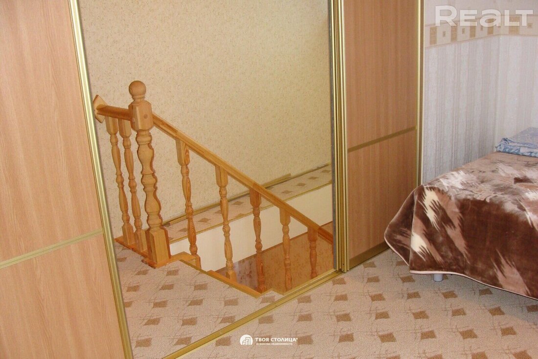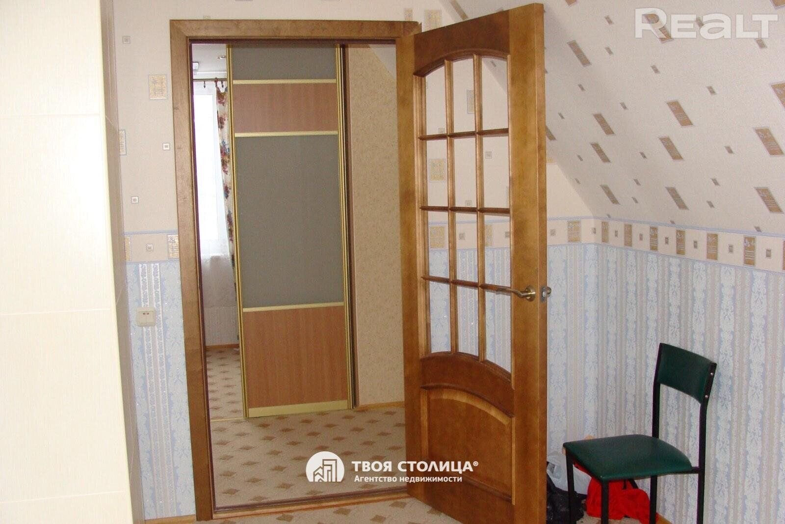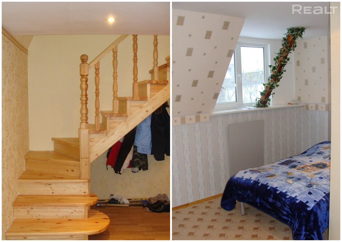Дом из экологичного сруба был построен в 2000 году. Дерево обеспечивает прохладу летом и тепло зимой, крыша покрыта шифером, в окнах — стеклопакеты. В цокольном этаже расположен гараж, а к самому дому пристроена крытая веранда.