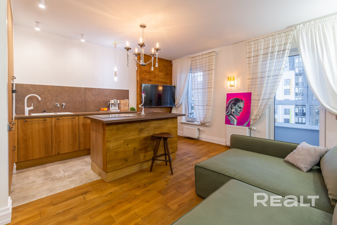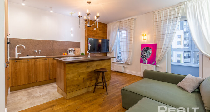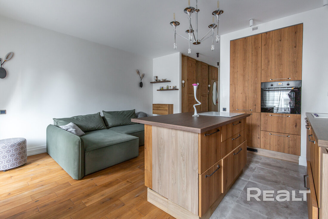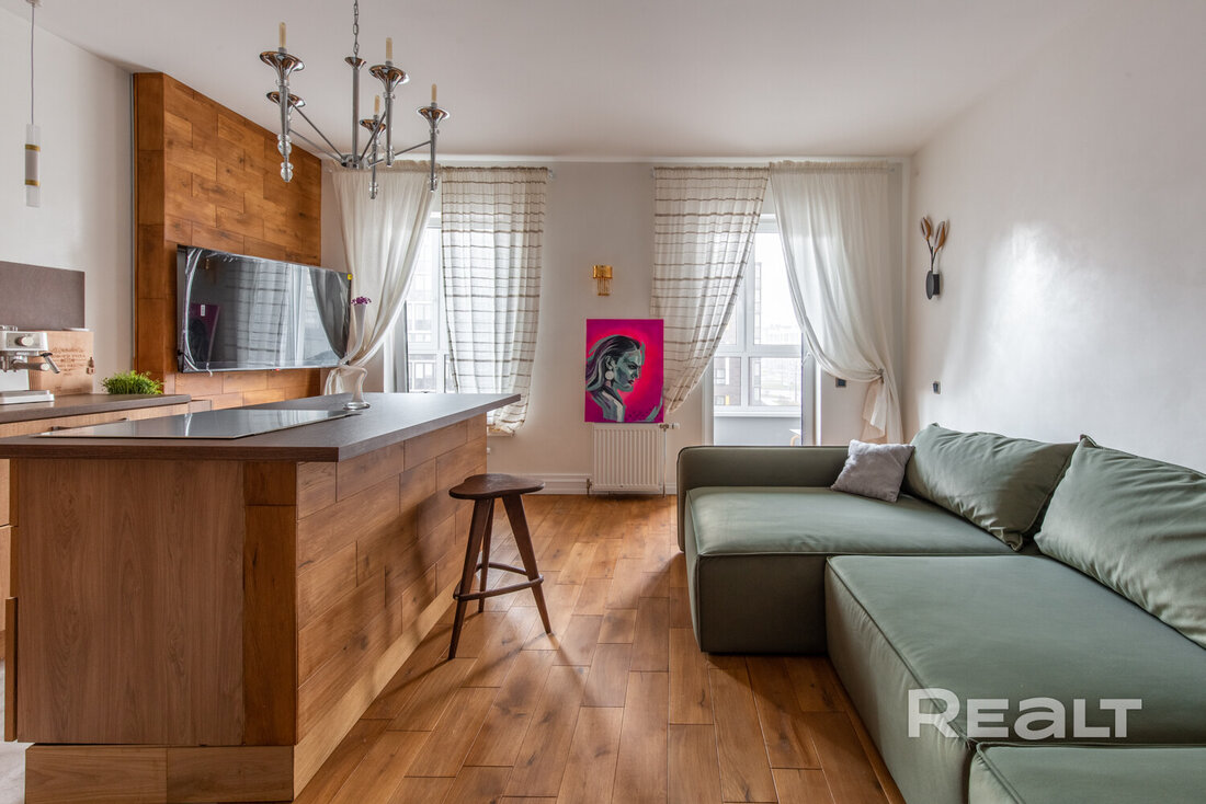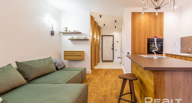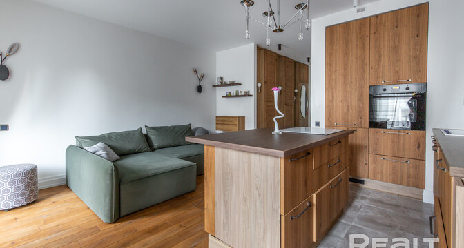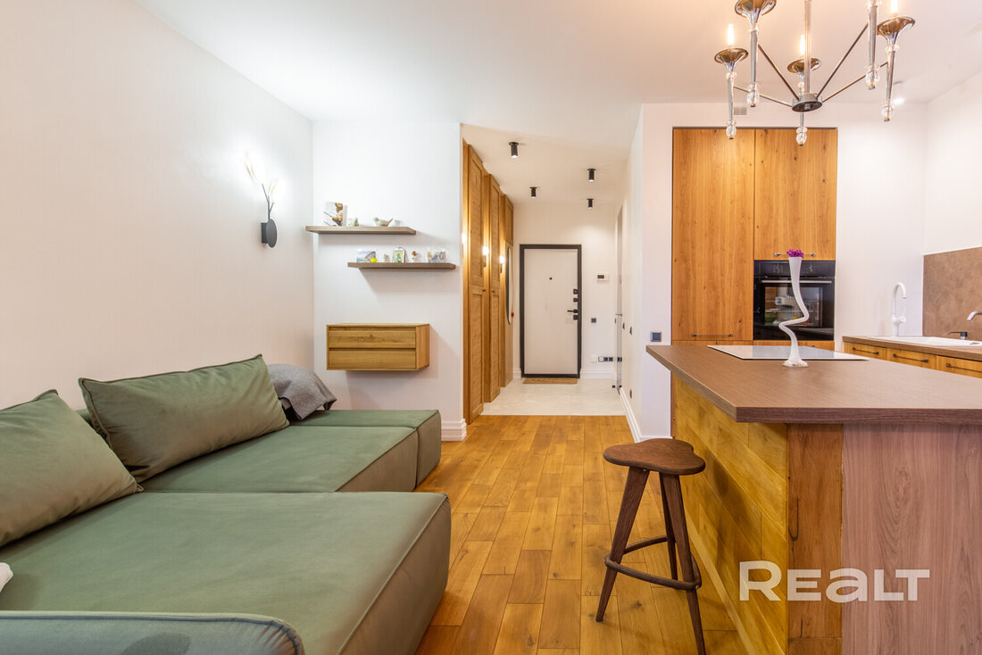 В доме, что стоит у центрального парка в Новой Боровой, продается симпатичная студия почти в 40 квадратов. Квартира обставлена мебелью и техникой. Интерьер получился свежим, благодаря большому количеству деревянных материалов. Оцените такое жилье.