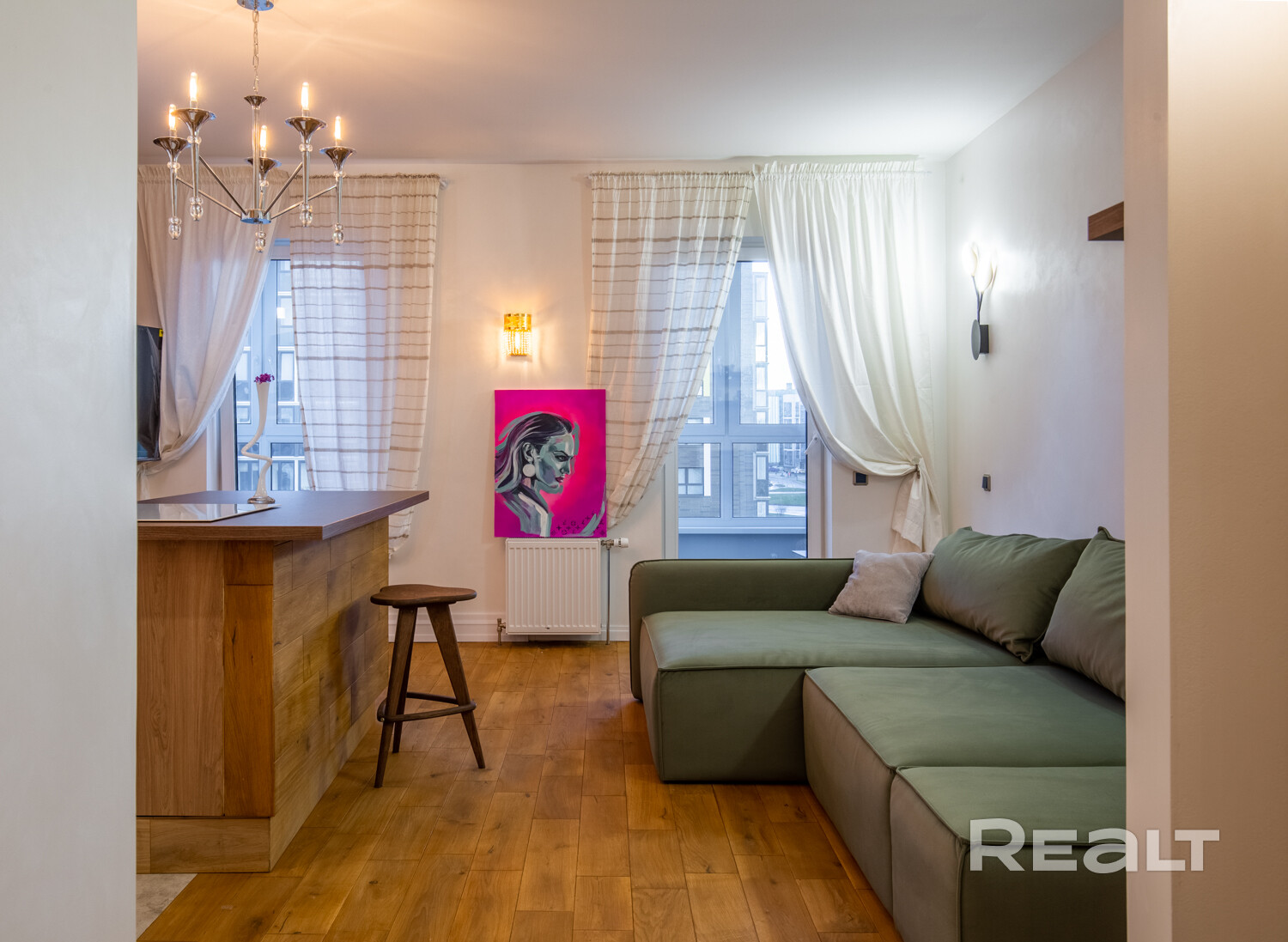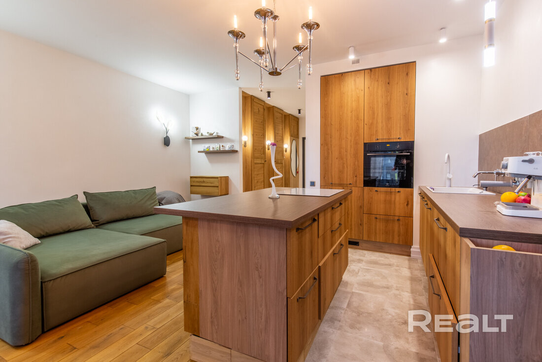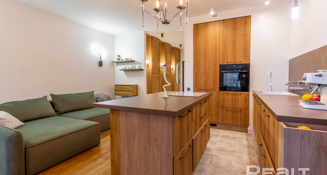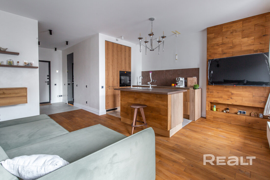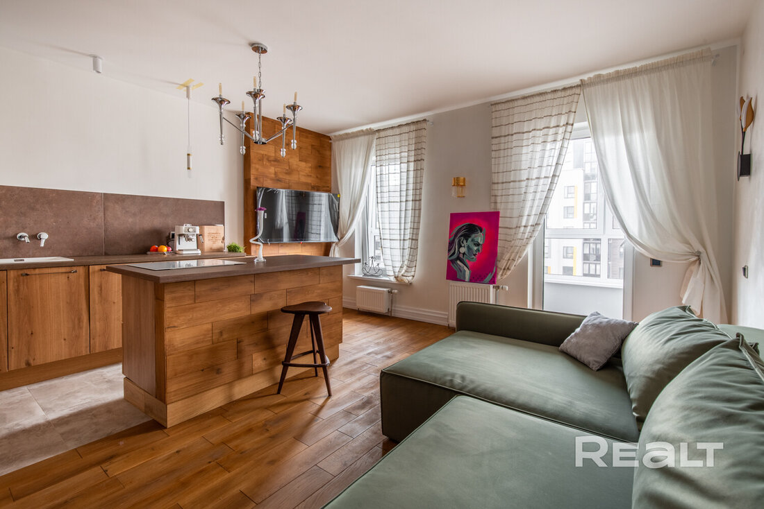 В доме, что стоит у центрального парка в Новой Боровой, продается симпатичная студия почти в 40 квадратов. Квартира обставлена мебелью и техникой. Интерьер получился свежим, благодаря большому количеству деревянных материалов. Оцените такое жилье.