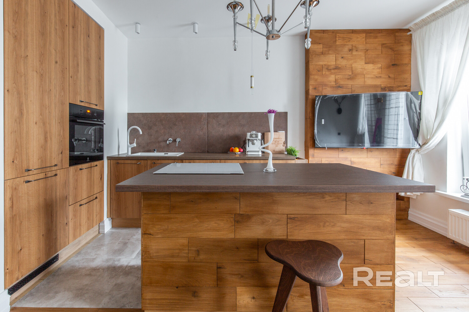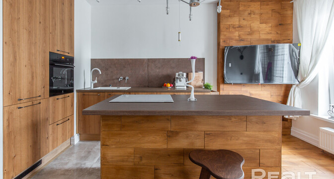 Достаточно много пространства отдано под кухню. Тут установлена встроенная техника: холодильник, духовка. Варочная панель разместилась на острове, который заменяет обеденный стол и обеспечивает дополнительные места для хранения.