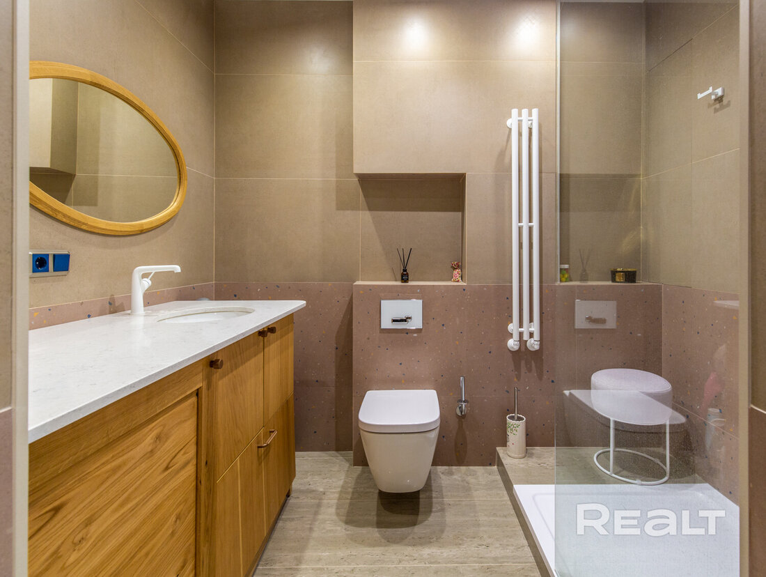 Совмещенный санузел идет с душем и инсталляцией.