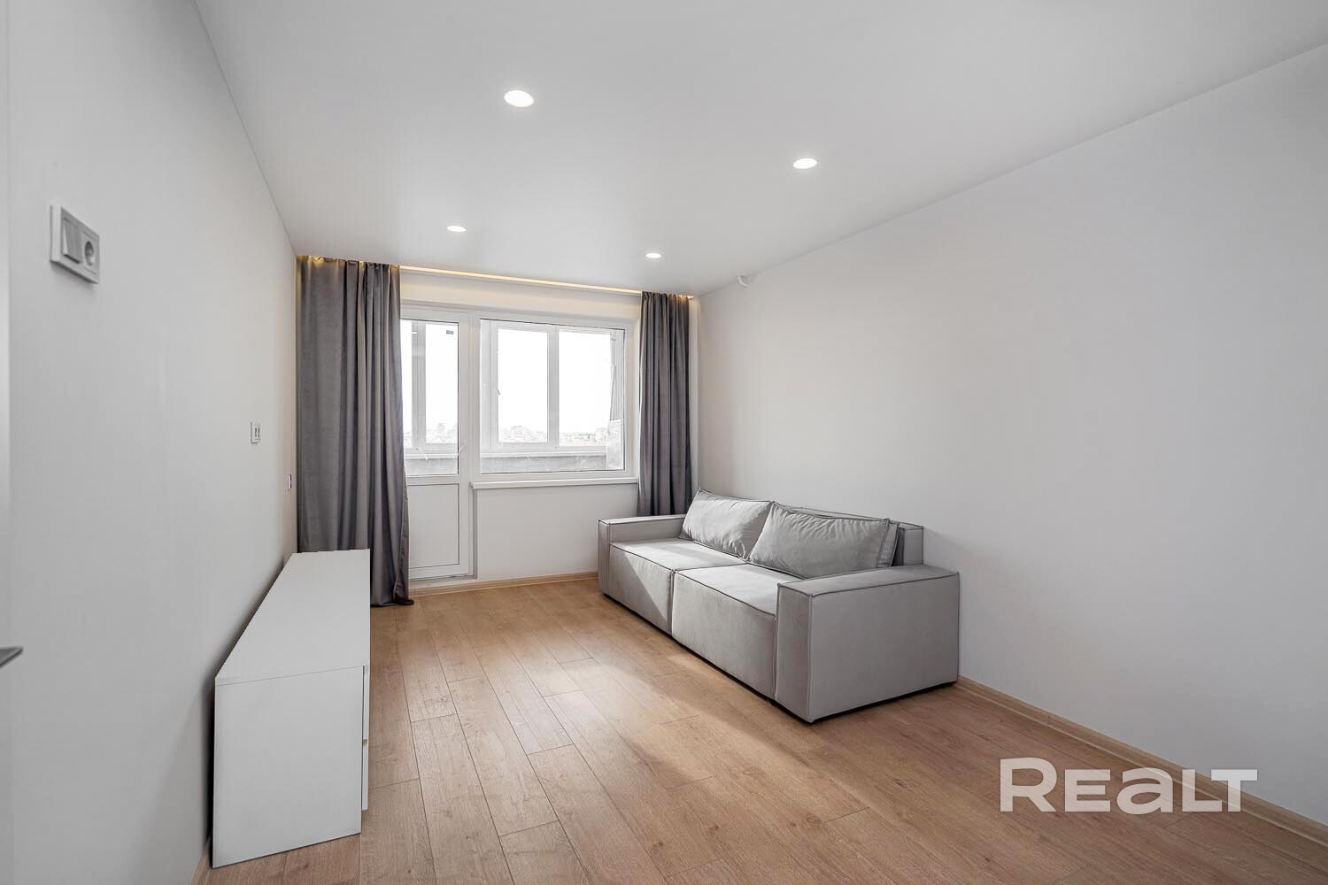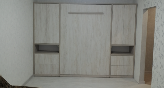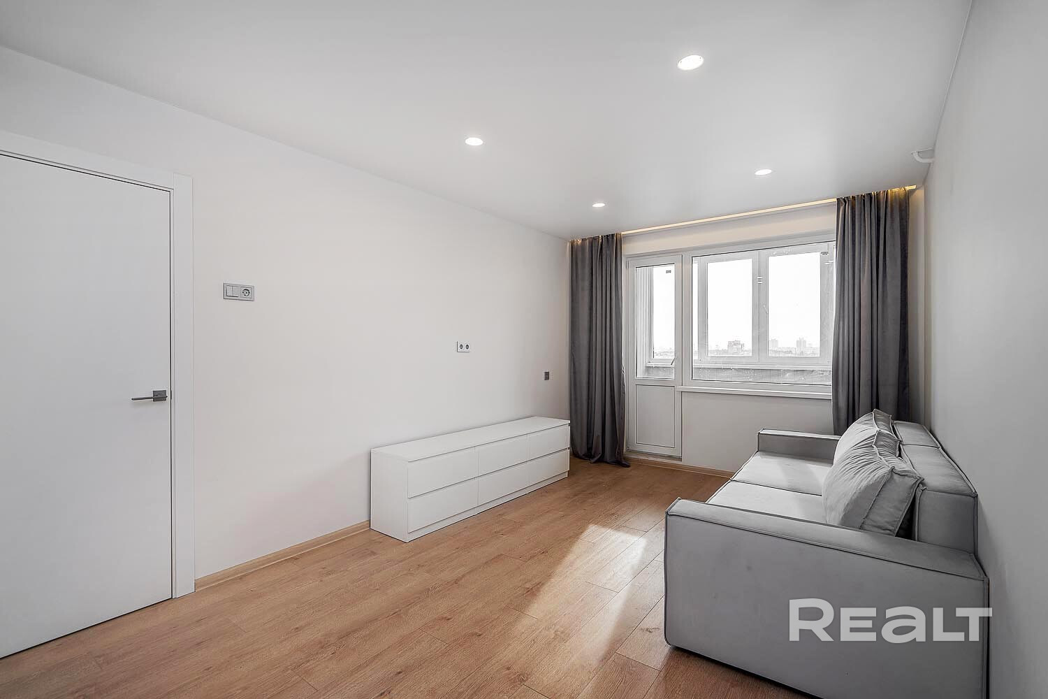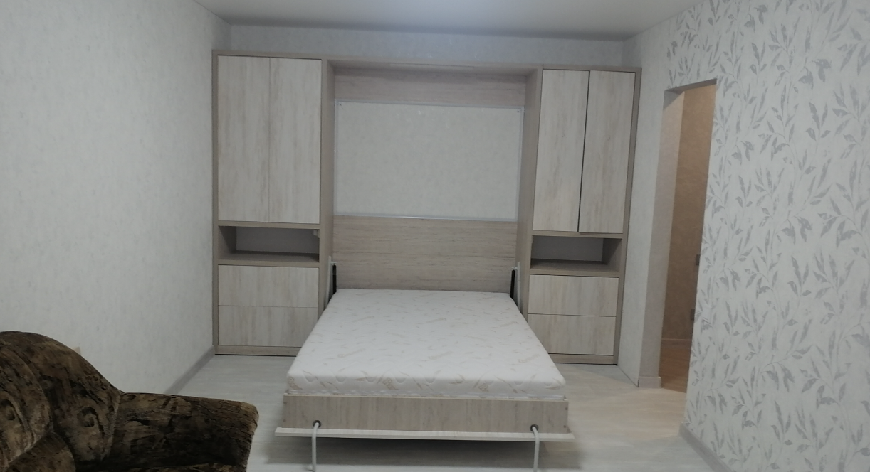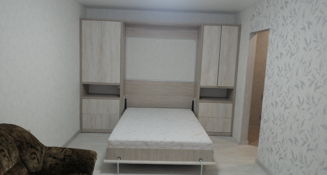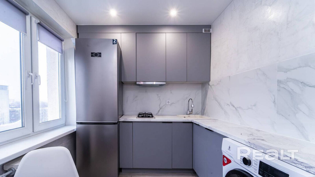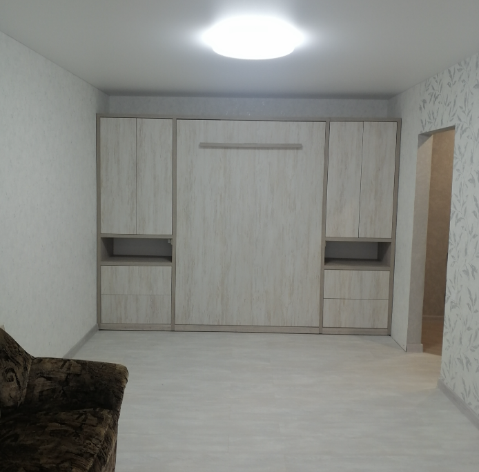 В прихожей установлен шкаф-купе. В жилой комнате стоит двуспальная кровать. Есть выход на лоджию. Кухонные фасады выполнены в сером цвете. Санузел раздельный. Продавец говорит, что в квартире недавно сделали ремонт.