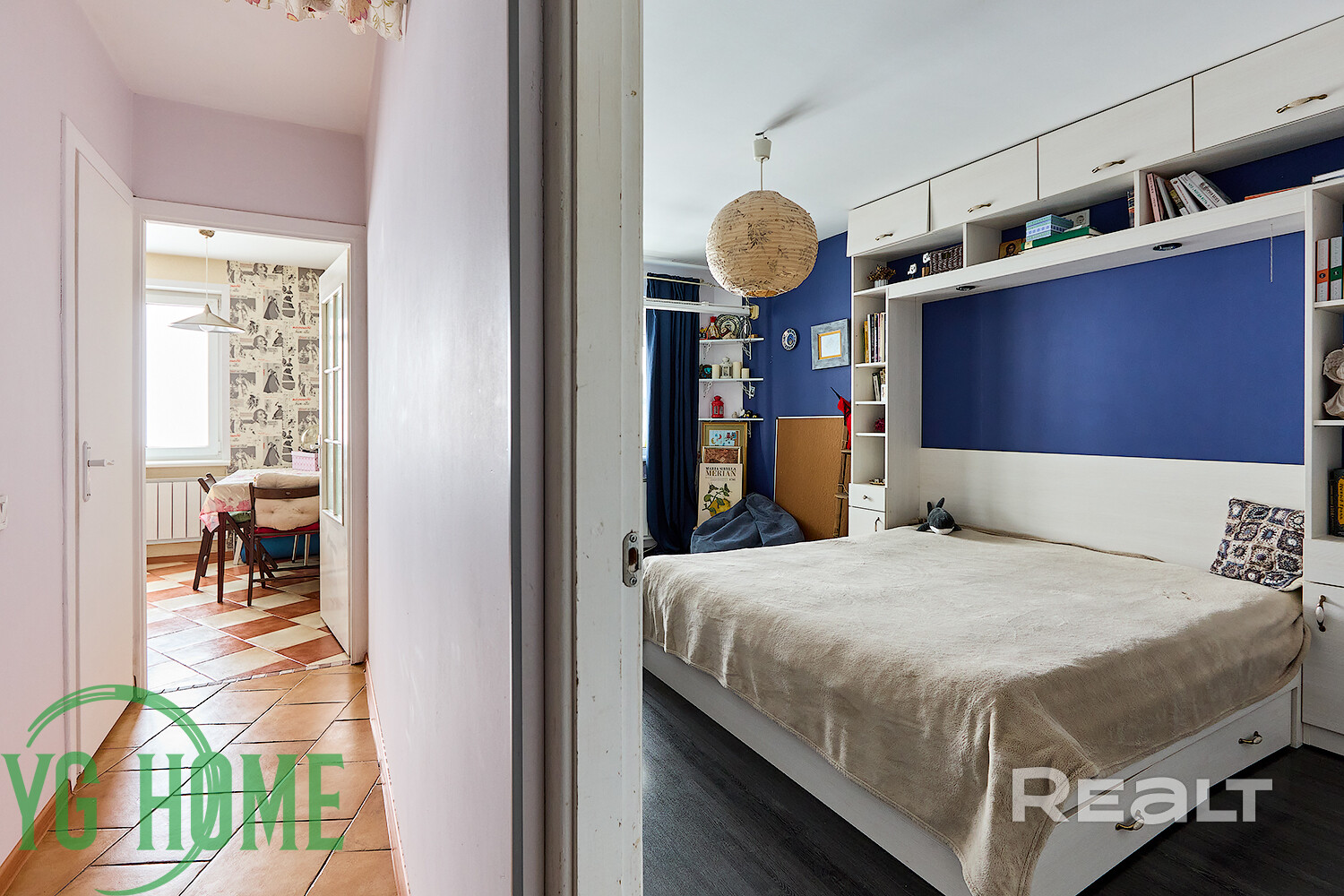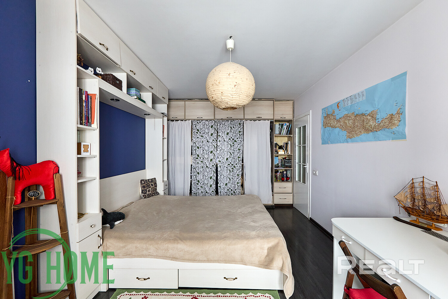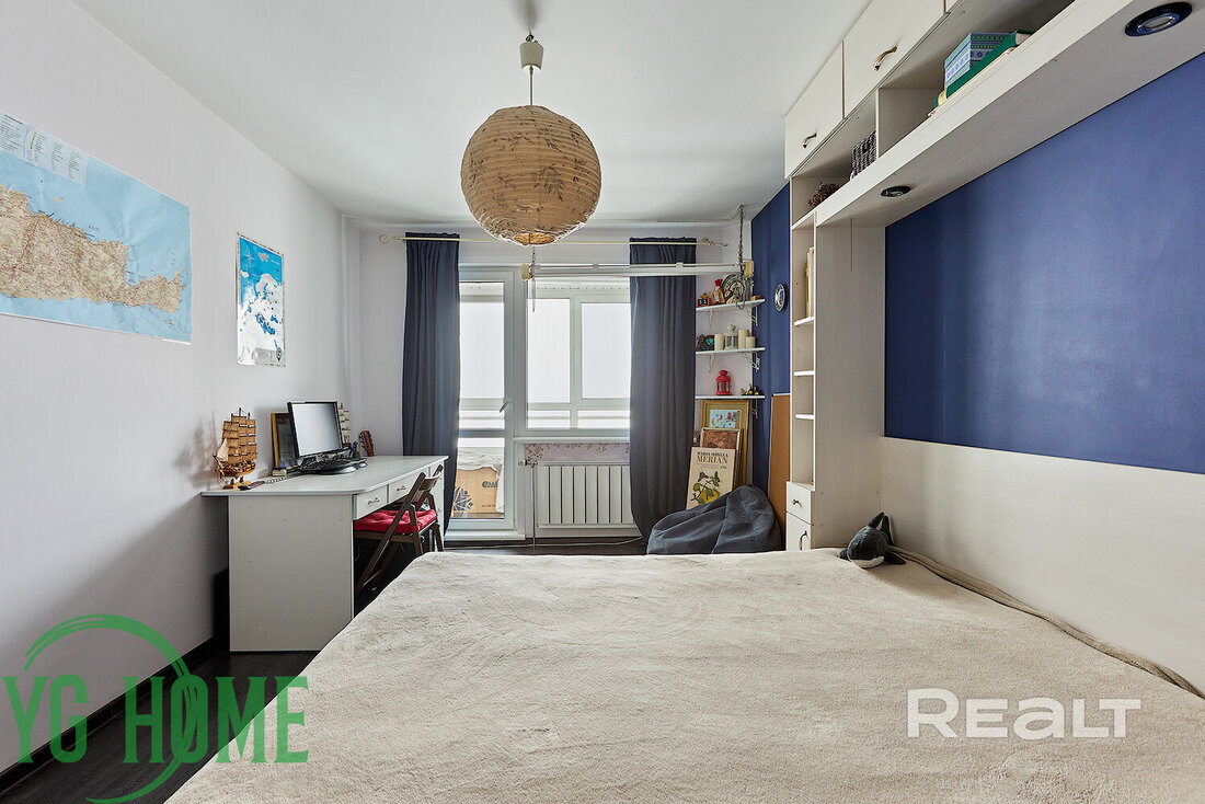 В жилой комнате стоит большая кровать, есть шкаф, стеллажи и рабочее место. Здесь же выход на застекленную лоджию.