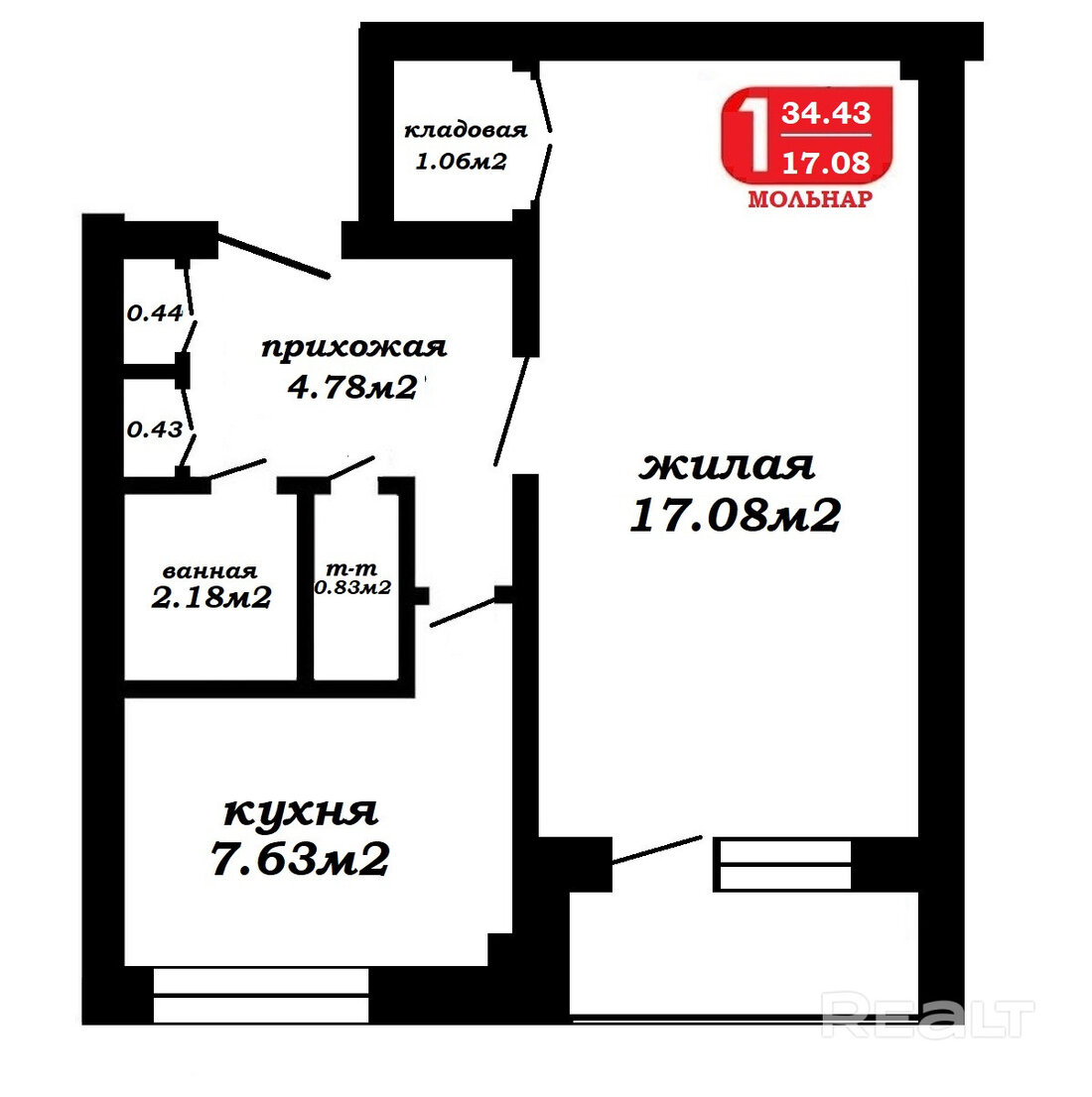 Общая площадь — 34 квадрата, жилая — 17, кухня — 7 метров.