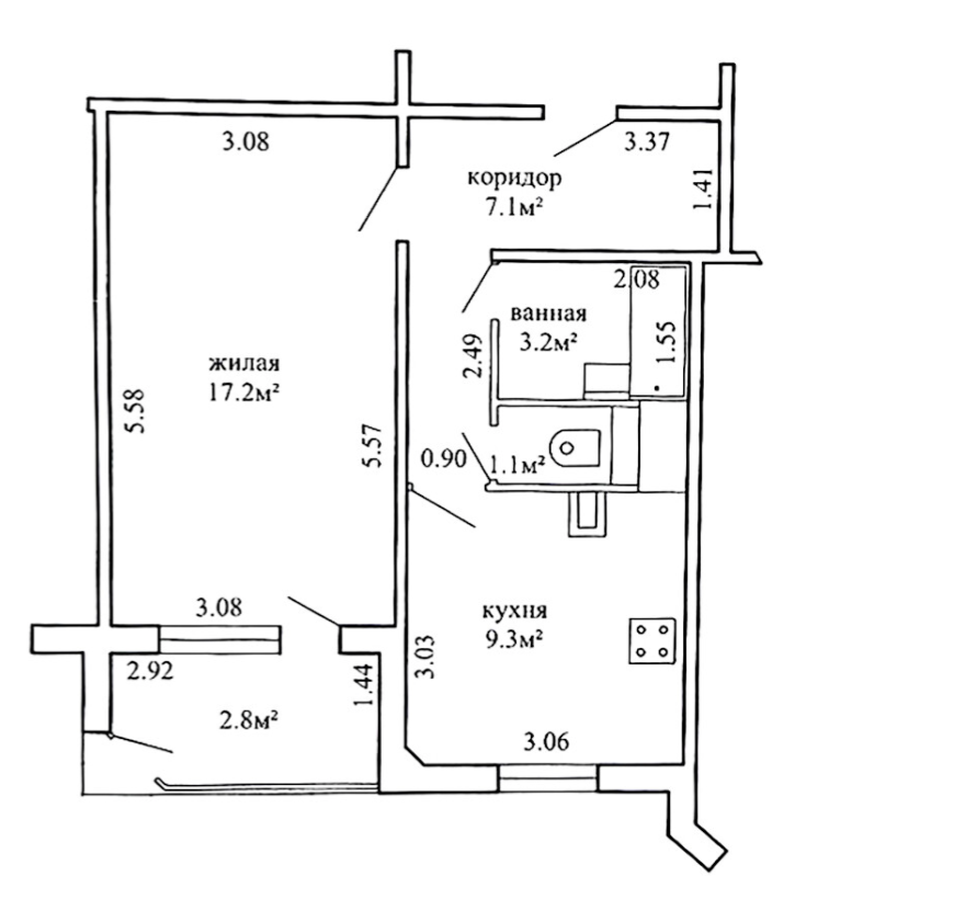 Общая площадь квартиры — 41 квадрат, жилая — 17 метров, а кухня — 9 метров.