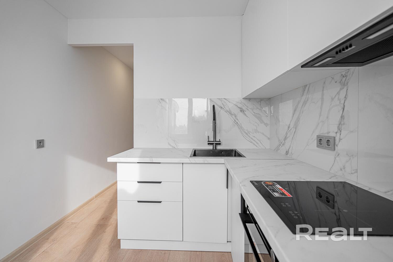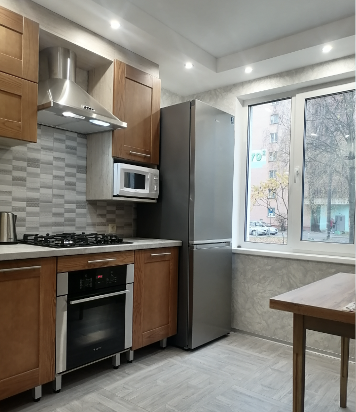 В кухне новая техника — холодильник, духовой шкаф, варочная панель и вытяжка.