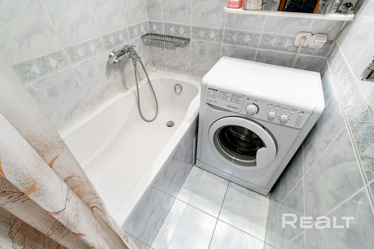 В кухне большое окно, в гостиной — выход на застекленную лоджию. Из мебели есть шкаф-купе, диван и комод. Санузел раздельный. Есть стиральная машина. Установлена ванна.