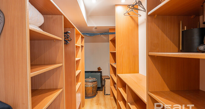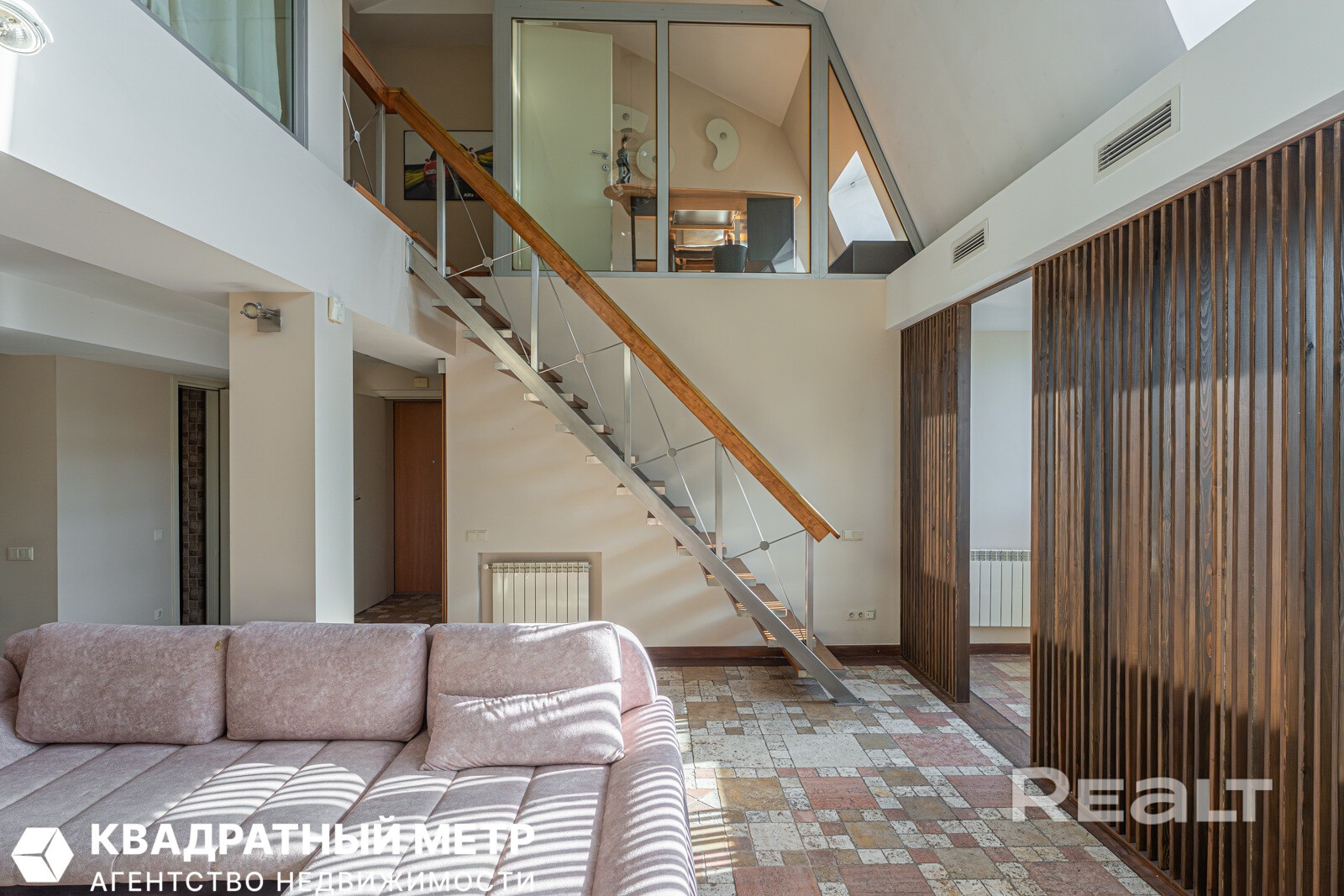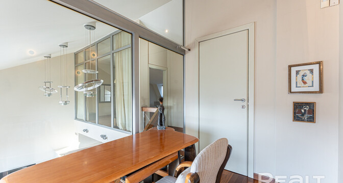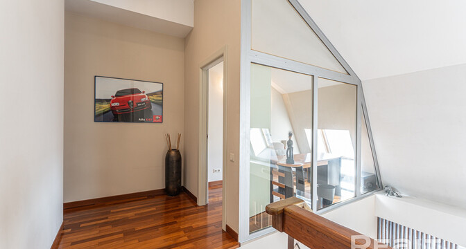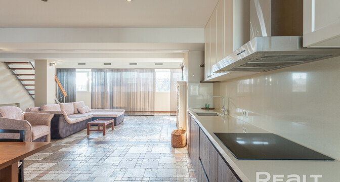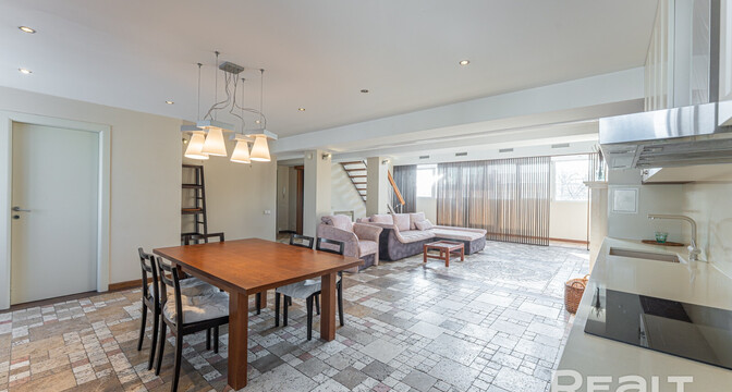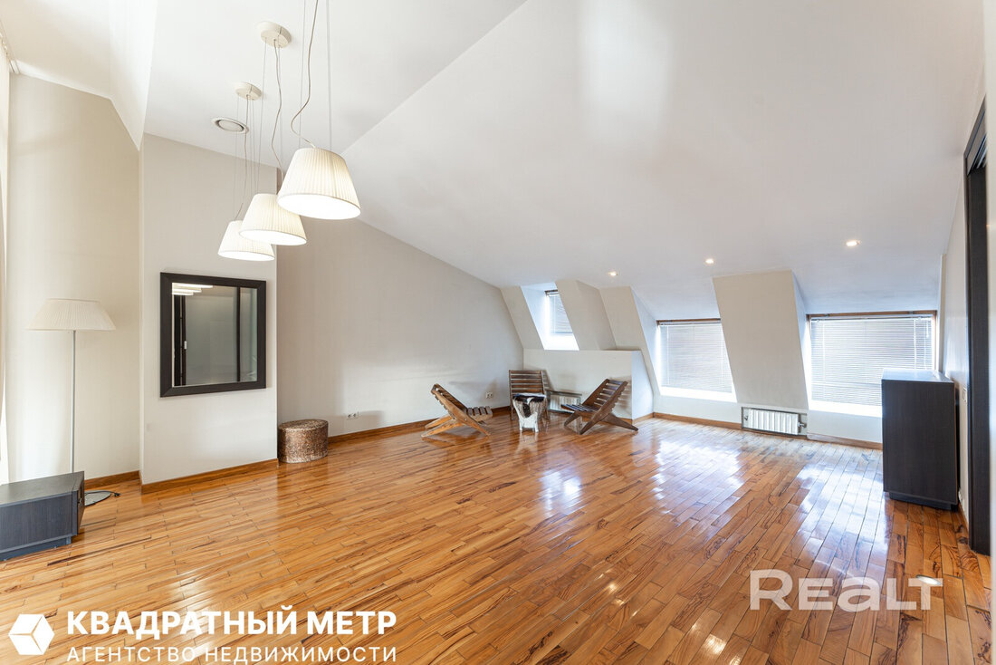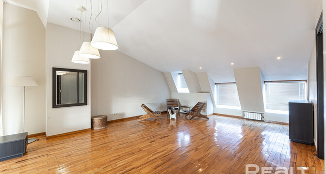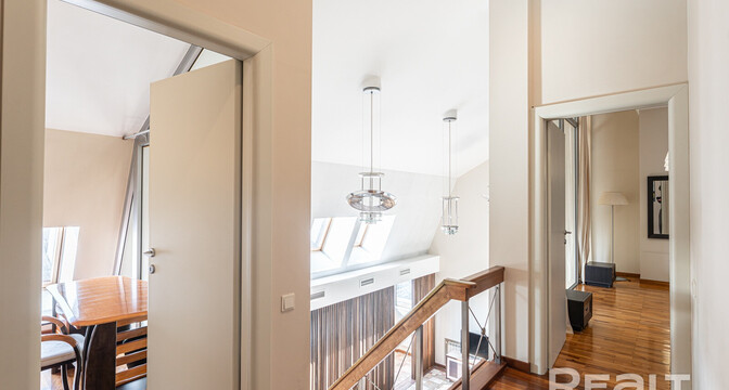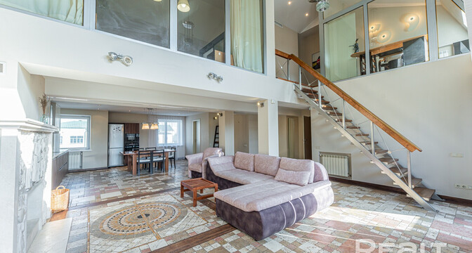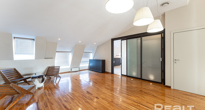 Но как бы это жилье ни было похоже на частный дом, находится оно на пятом этаже в шестиэтажной сталинке на Комсомольской, 29 в самом центре Минска. Дом построен в 1917 году, а в 2000-х его реконструировали — надстроили мансарды и сделали лифты.
