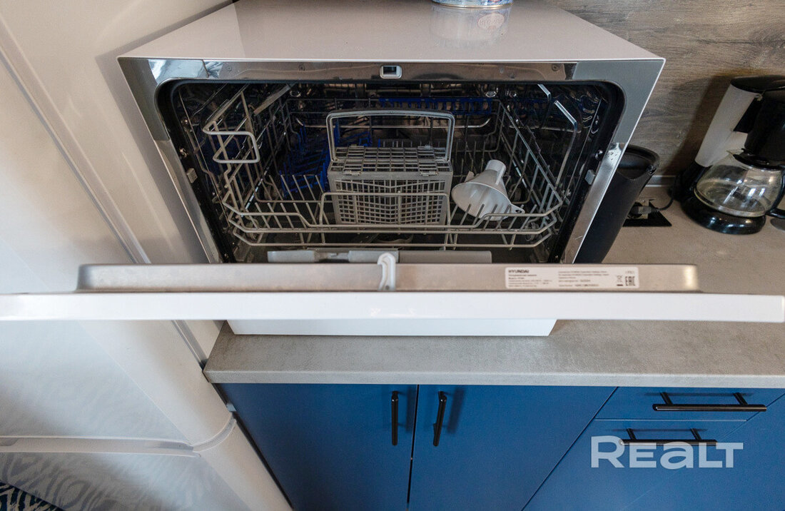 На кухне есть не только мебель, но и вся необходимая техника (посудомойка, микроволновка, холодильник и стиральная машина).