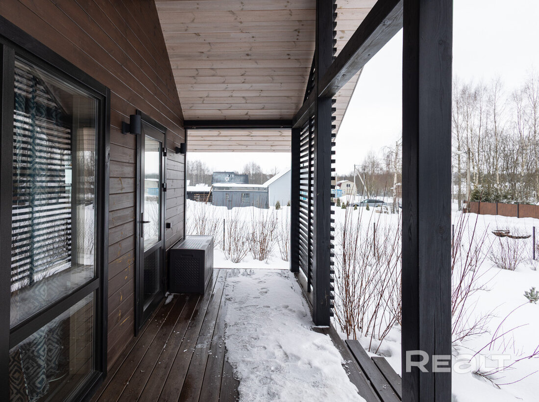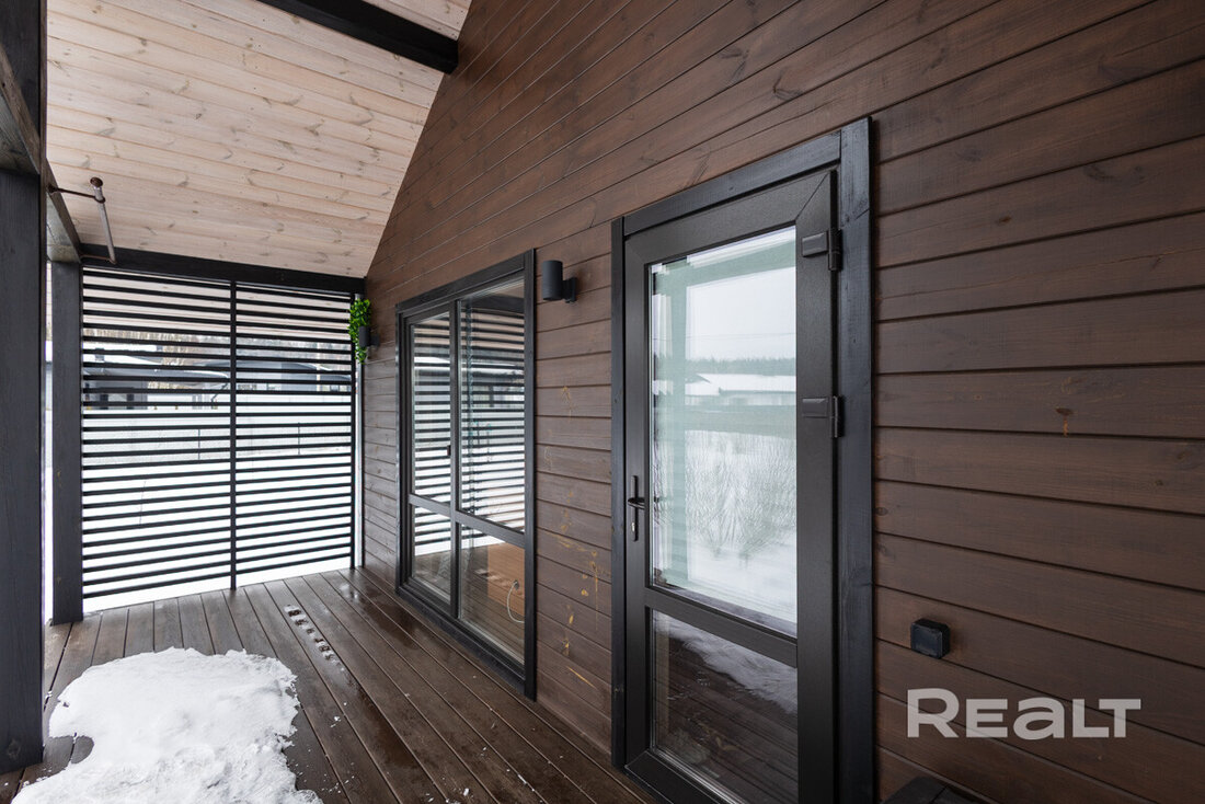 К дому примыкает терраса из сибирской лиственницы с панорамными окнами в пол и дополнительным выходом.
