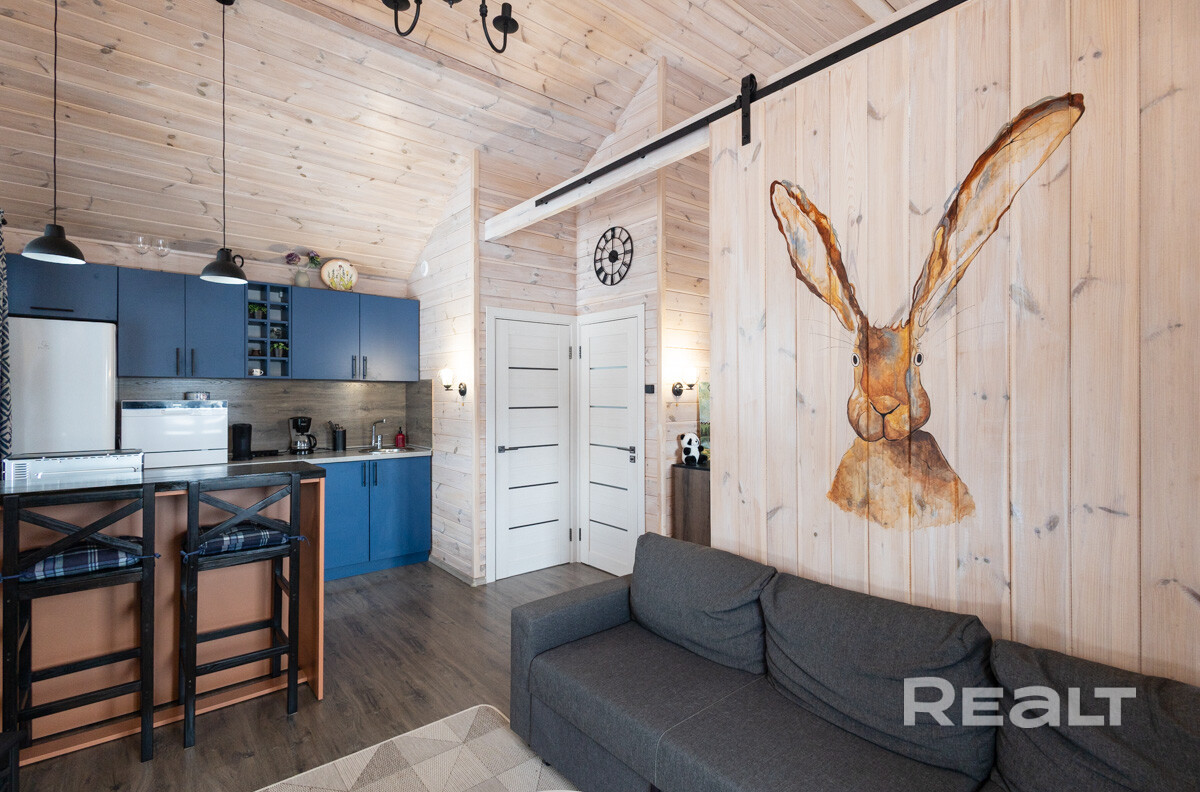 Общая площадь компактного дома составляет 48 квадратных метров. Он состоит из кухни-гостиной, спальной зоны, бойлерной и санузла. Дом уже декорирован и обставлен мебелью. На стене в гостиной можно заметить симпатичного нарисованного кролика.
